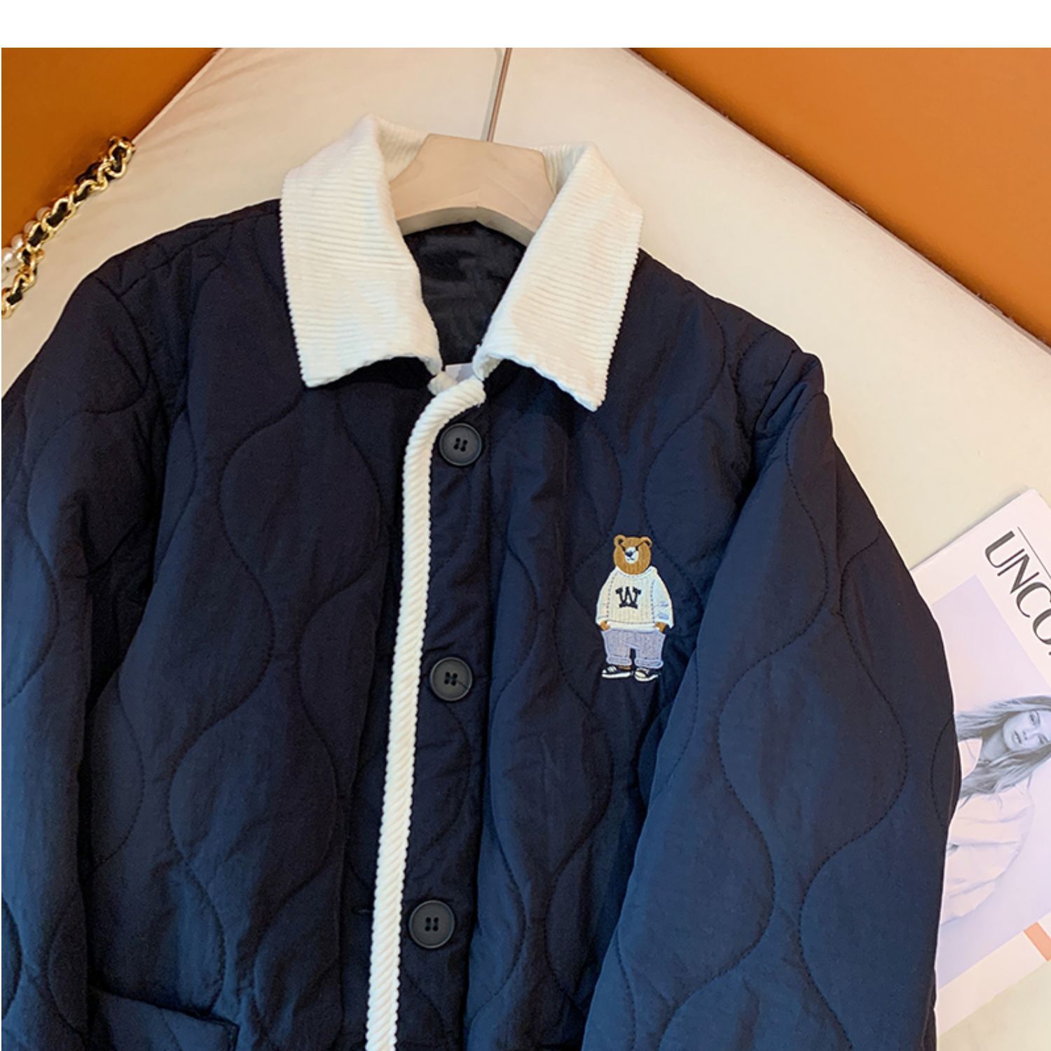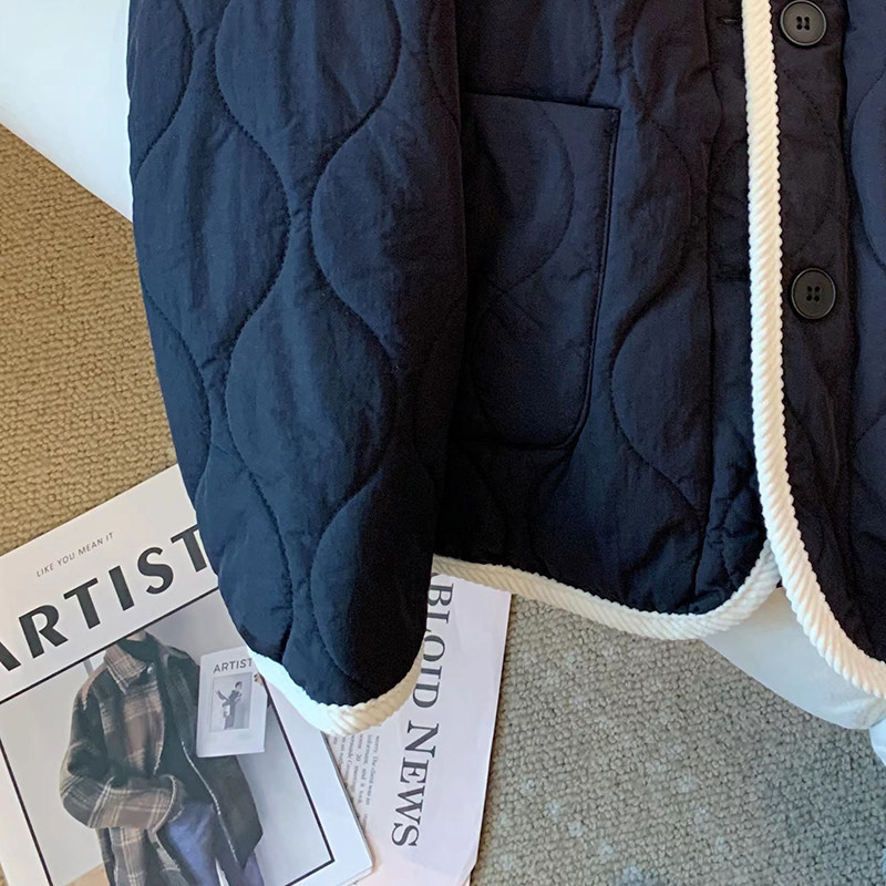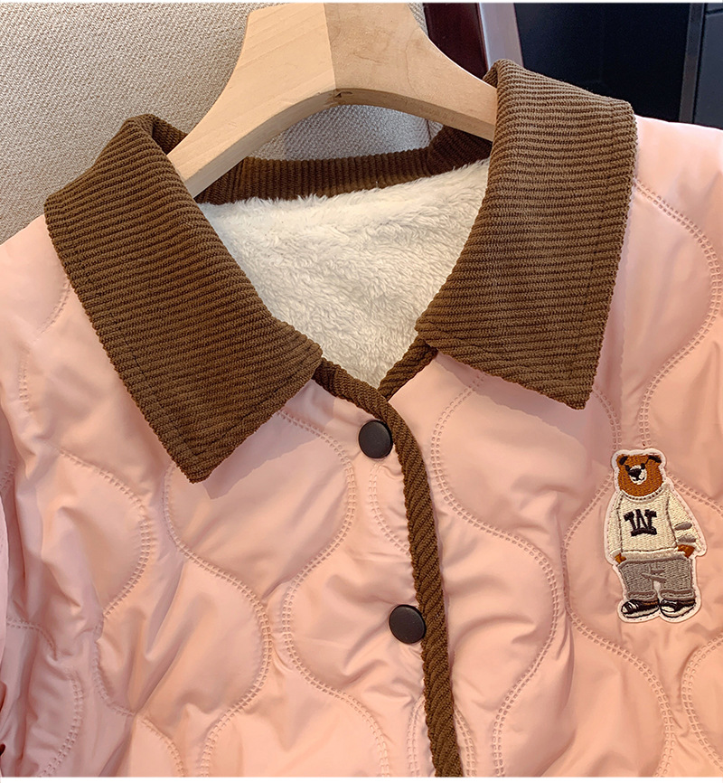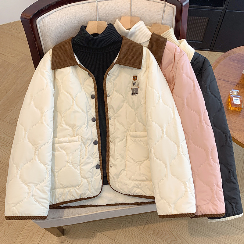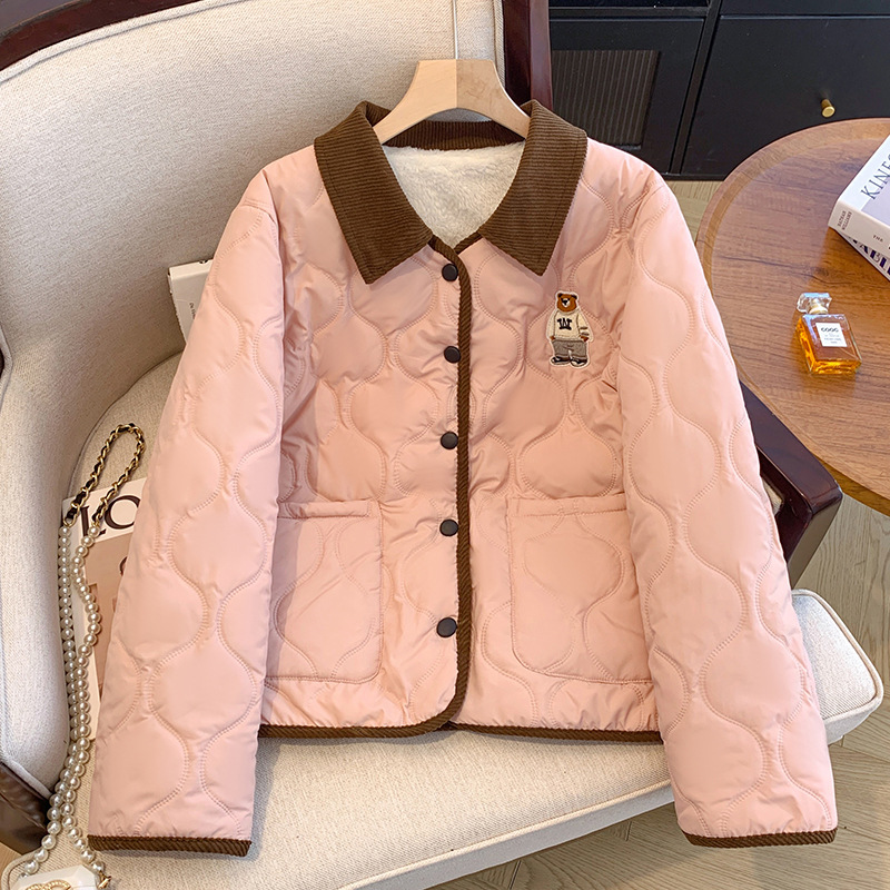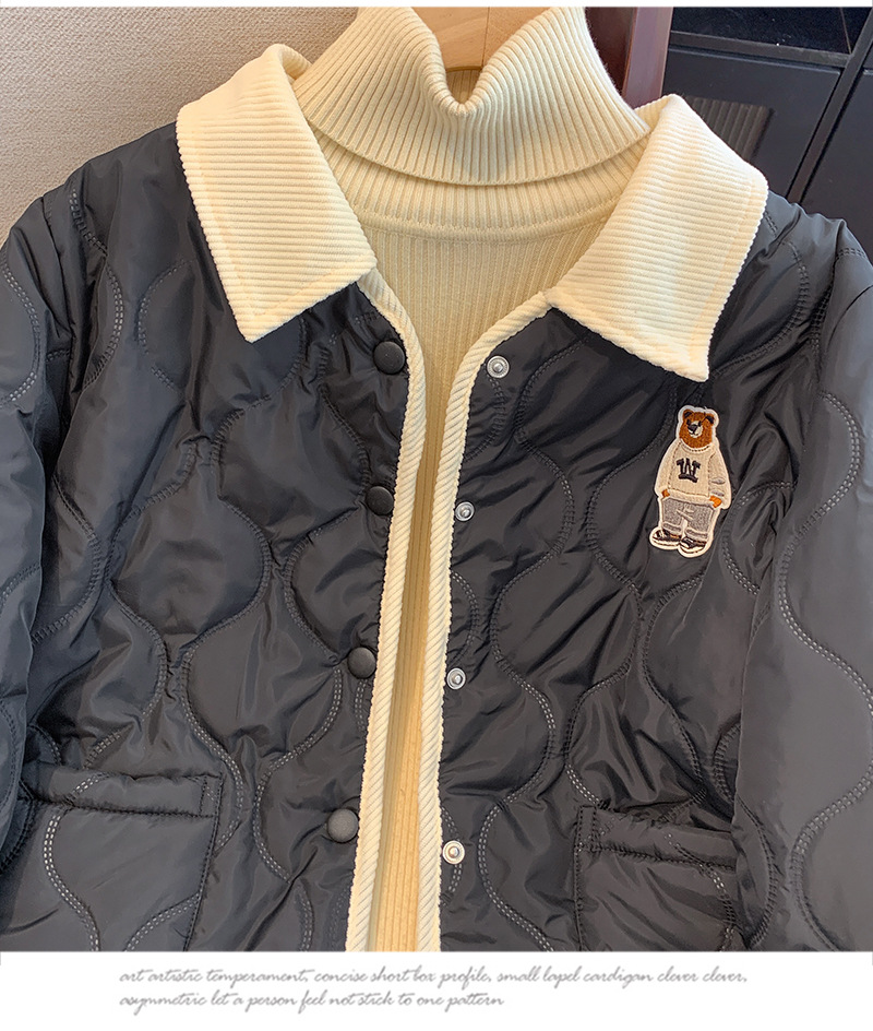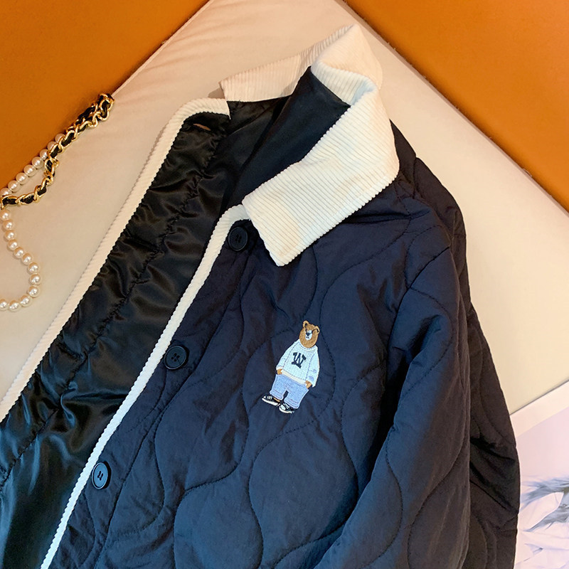 丁摩 美式复古小熊刺绣撞色包边棉服女冬季时尚菱格宽松加厚翻领外套5ZF-11108