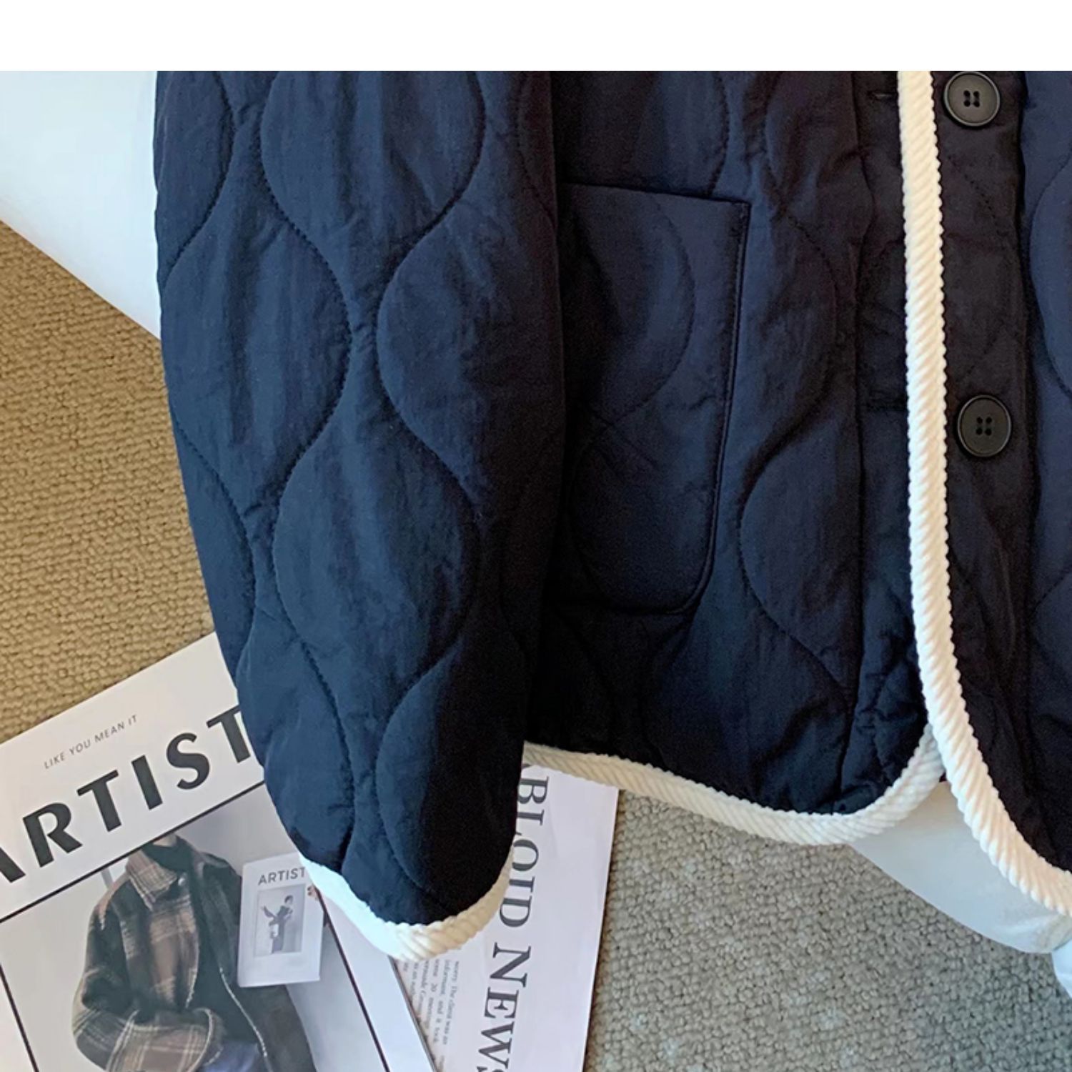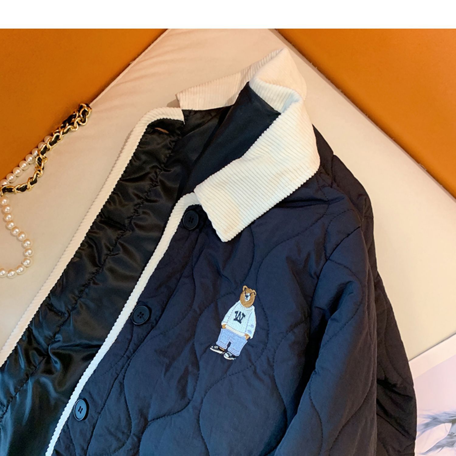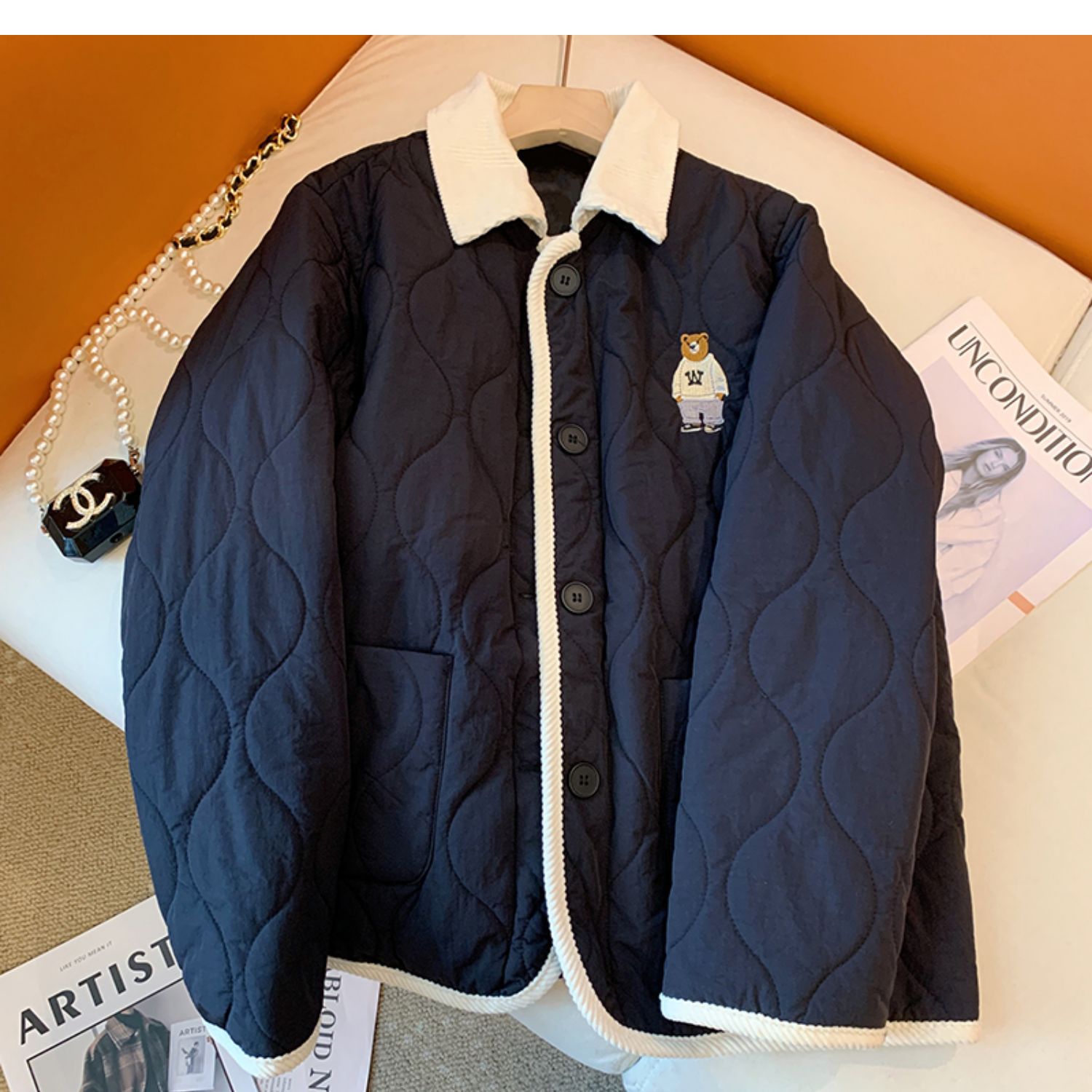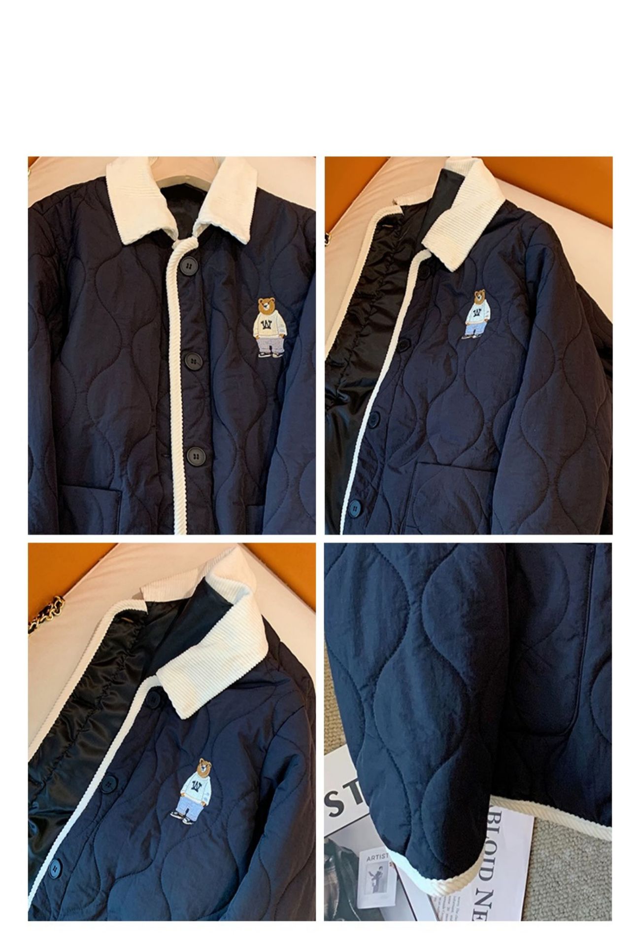 丁摩 美式复古小熊刺绣撞色包边棉服女冬季时尚菱格宽松加厚翻领外套5ZF-11108