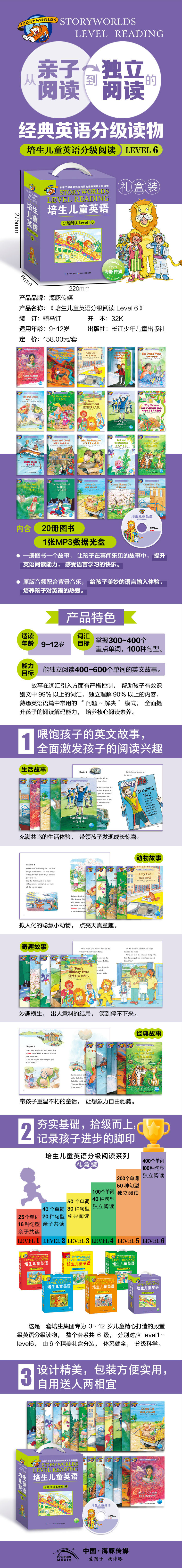 《培生儿童英语分级阅读Level6》是培生集团为9-12岁儿童精心打造的经典英语分级读物。整套书包含20册图书和1张MP3数据光盘,用精美大礼盒包装,方便实用,精致大气。本套书以儿童最喜欢的故事为主导,在符合孩子语言发展规律的基础上,涵盖生活故事、动物故事、奇趣故事和经典故事等,旨在用故事的万花筒,全面激发孩子的英语学习潜能,提升阅读能力,帮助孩子实现从亲子共读到独立阅读的跨越。