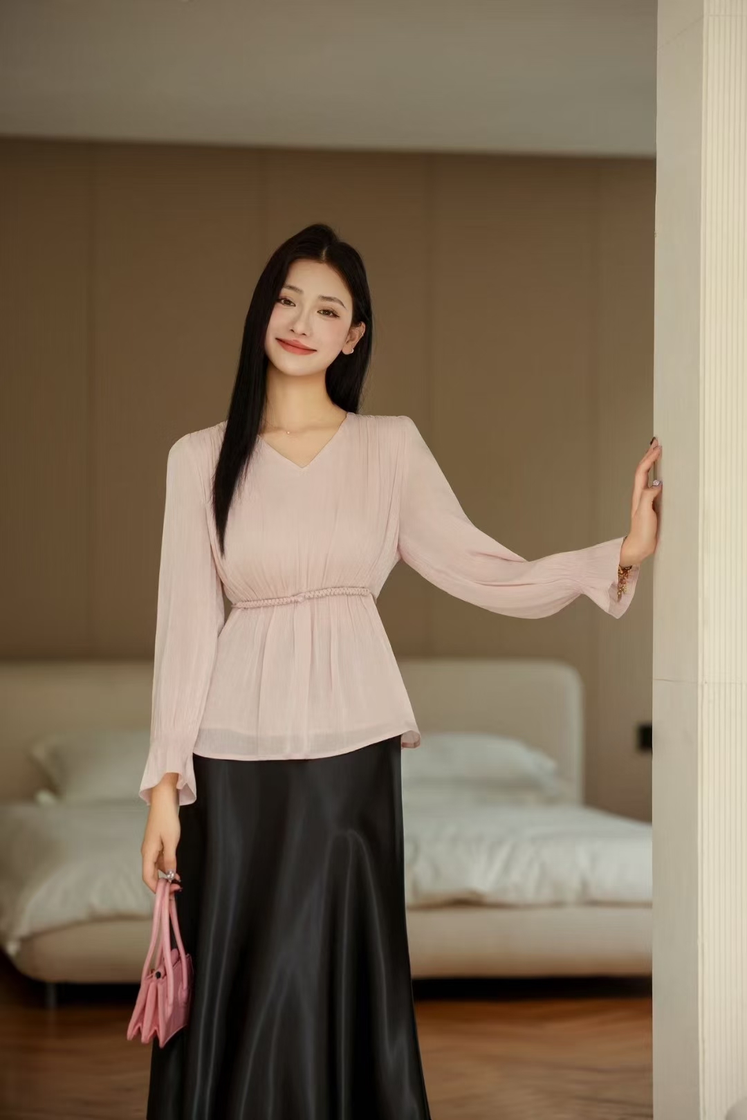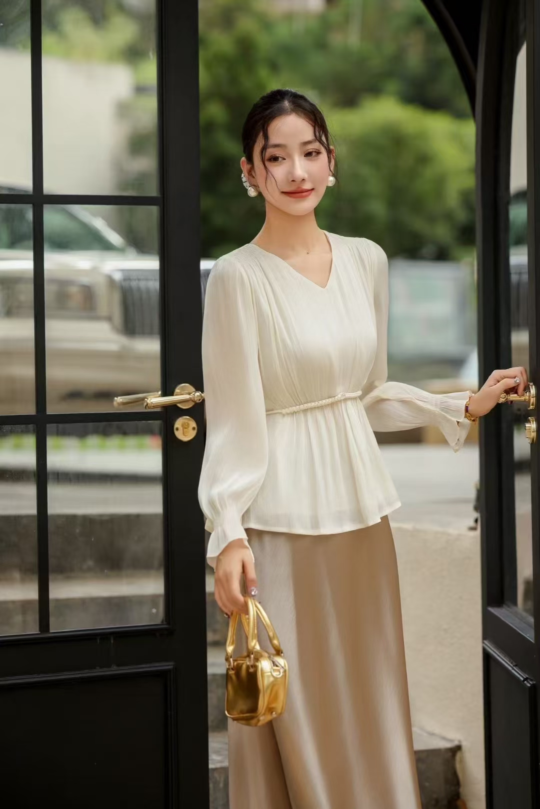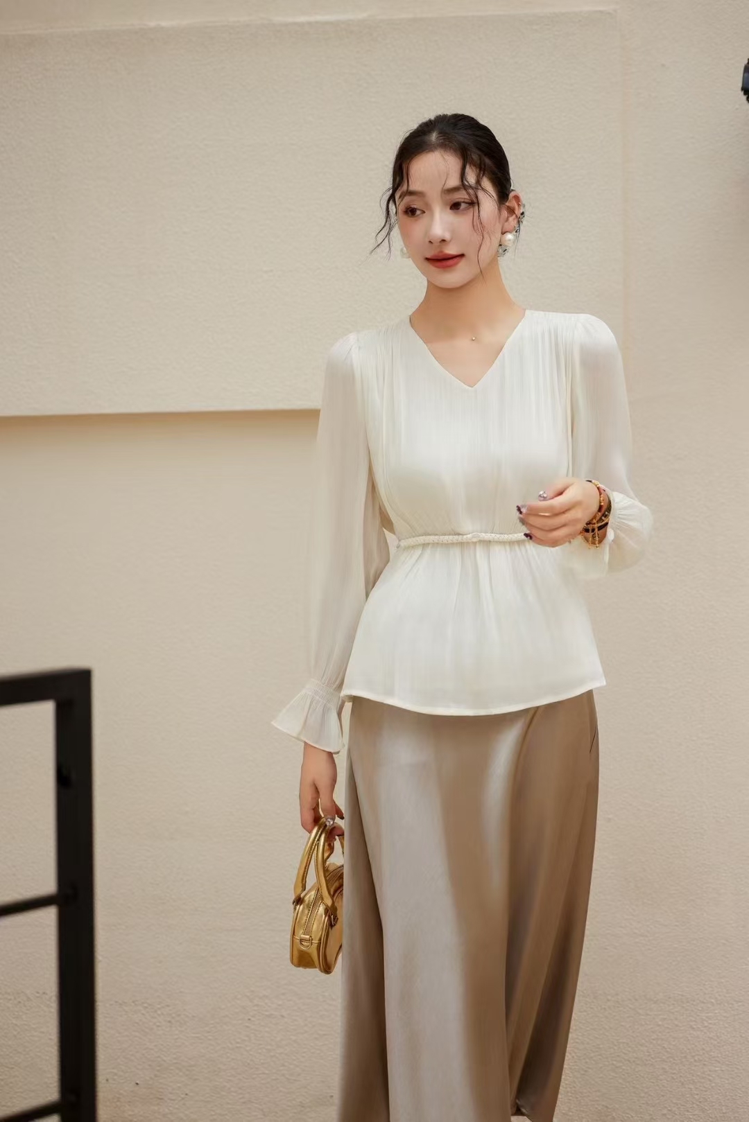 「自」全新升级【铂金会员165/天猫219/差价54】(53156)洛诗琳法式V领长袖雪纺衬衫2025新款秋季气质显瘦上衣女