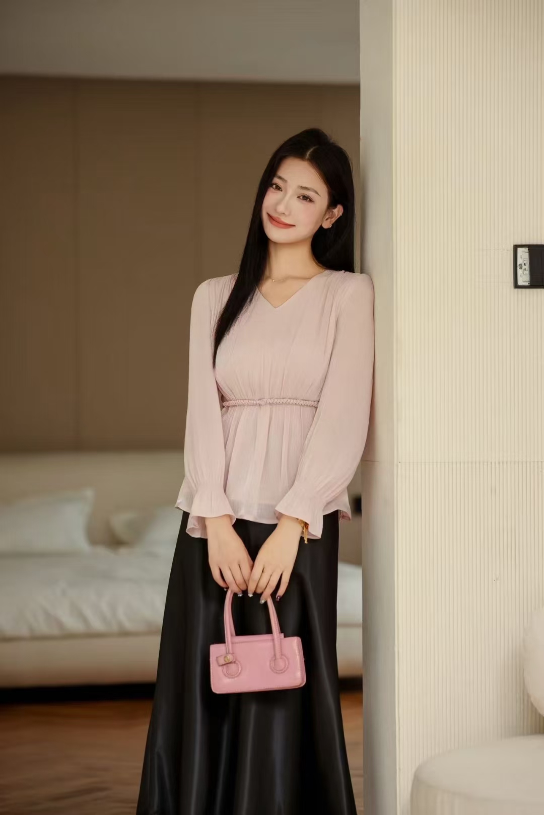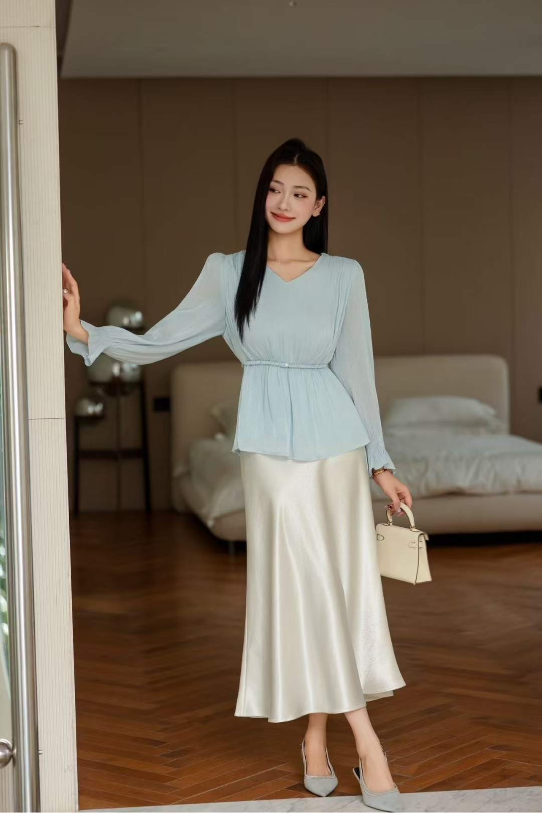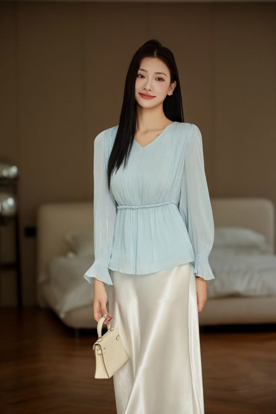 「自」全新升级【铂金会员165/天猫219/差价54】(53156)洛诗琳法式V领长袖雪纺衬衫2025新款秋季气质显瘦上衣女
