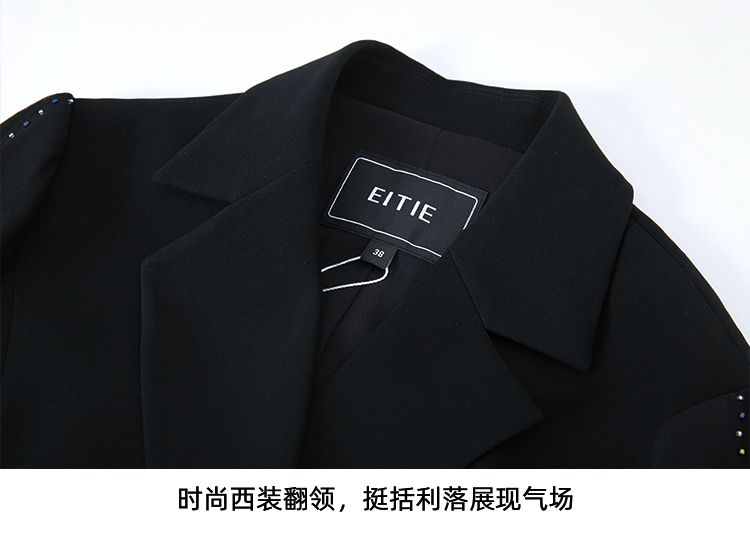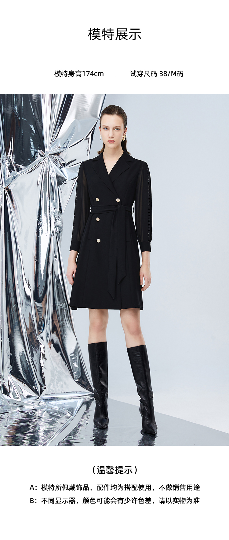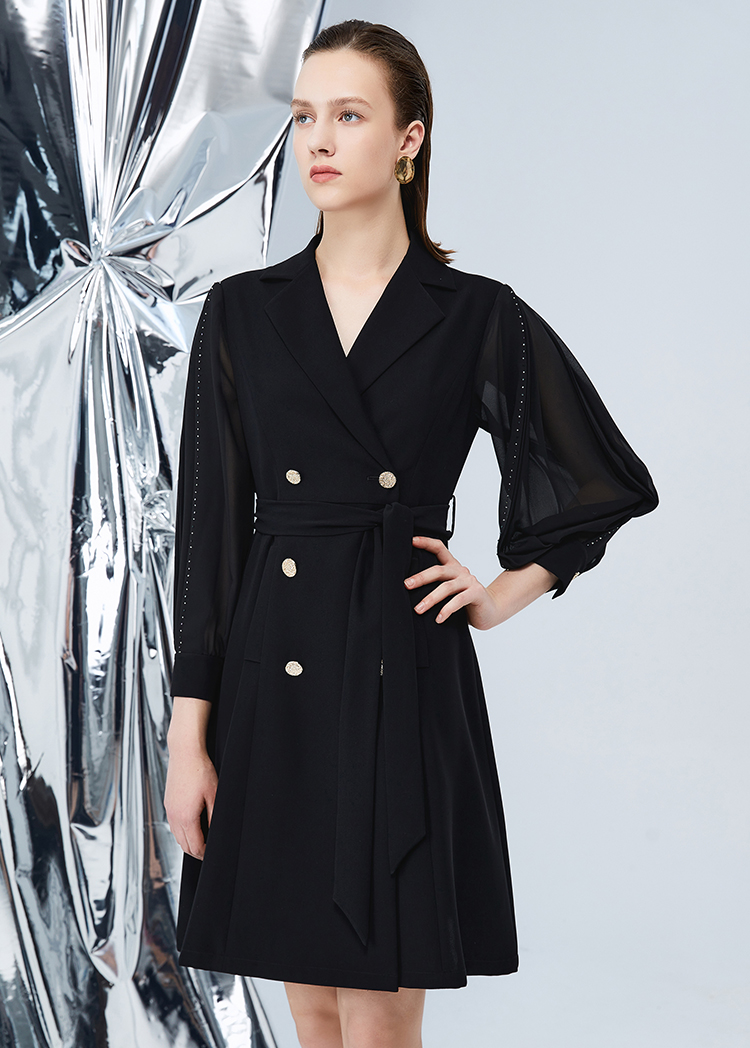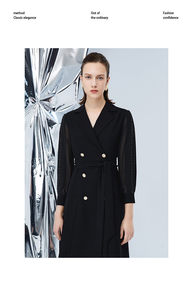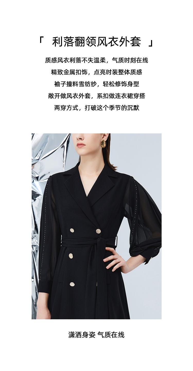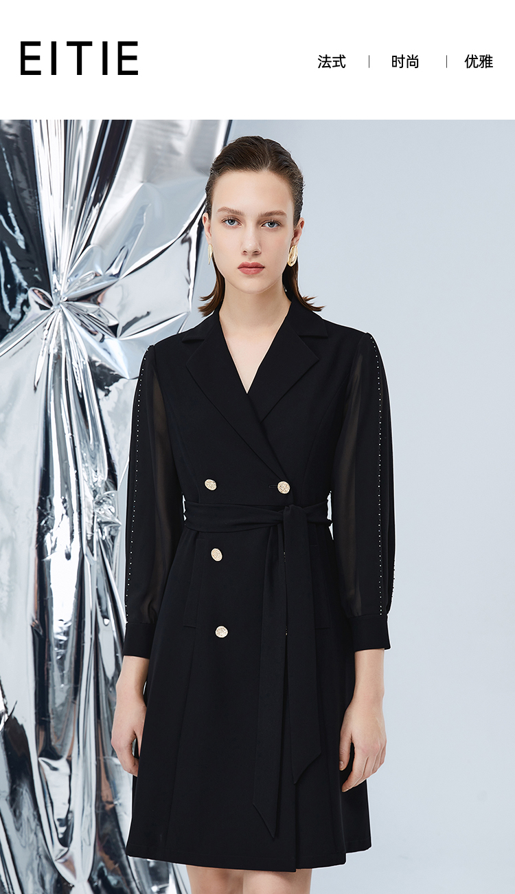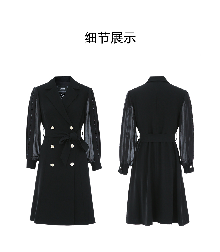 EITIE爱特爱秋季翻领双排扣时尚网纱拼接黑色风衣外套7504202