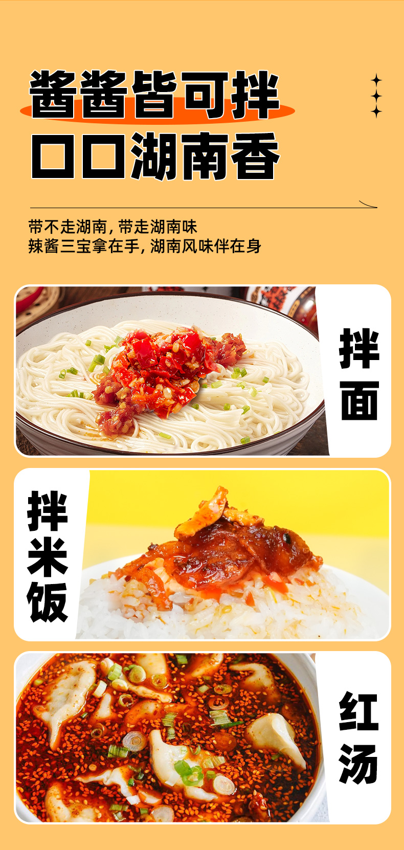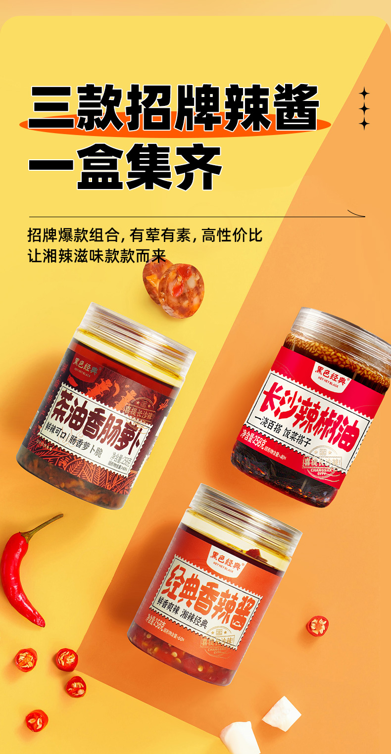 【作废】长沙辣酱三宝套餐(长沙辣椒油+经典香辣酱+茶油香肠萝卜)258g/瓶*3