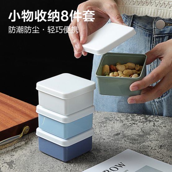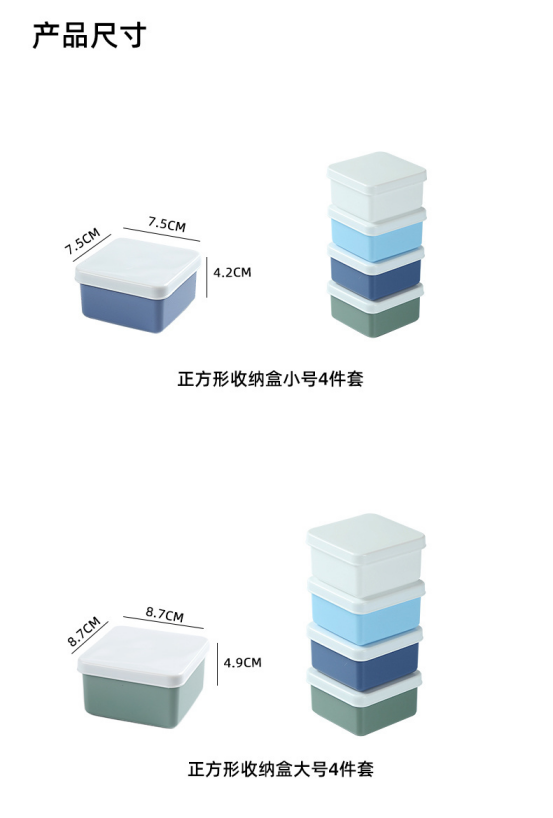 尺寸:①收纳盒4大4小8件套:正方形小7.5*7.5*4.2CM 150ML;正方形大8.7*8.7*4.9CM 250ML