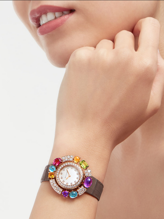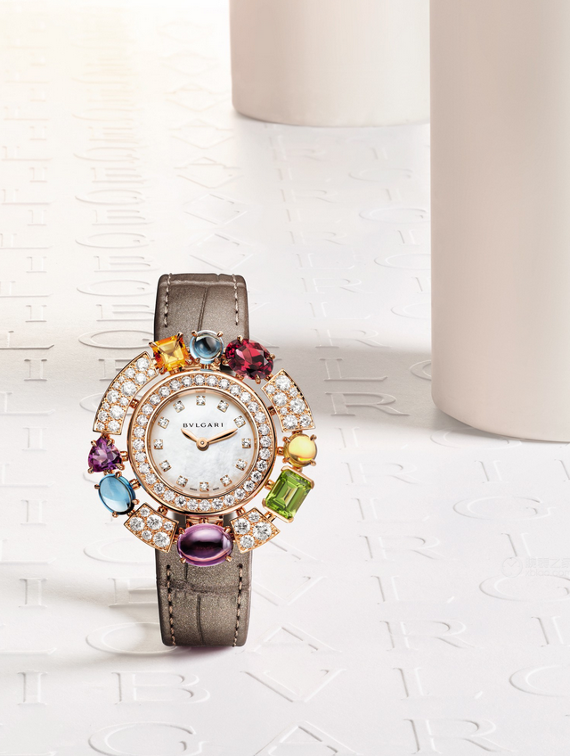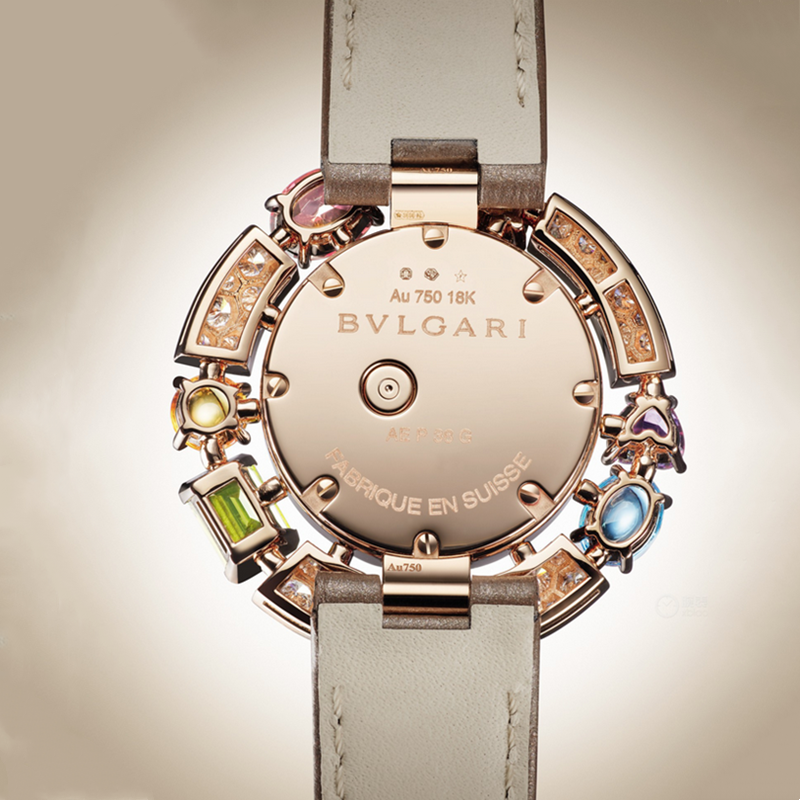 镜面 材质 | 蓝宝石水晶玻璃 | 表盘 | 18k玫瑰金金表壳,镶嵌82颗圆形明亮式切割钻石(约2.23克拉)和多颗刻面切割与凸形蛋面切割宝石:2颗黄水晶(约1.45克拉)、2颗紫水晶(约3.06克拉)、1颗橄榄石(约1.29克拉)、2颗凸形蛋面切割蓝色托帕石(约3.06克拉)、1颗玫瑰榴石(约1.63克拉) |