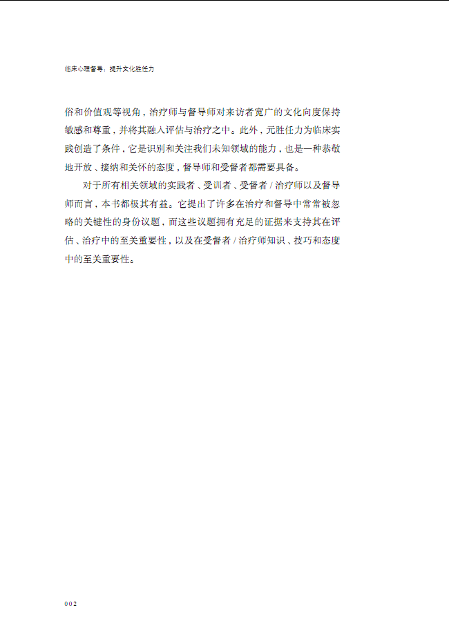 督导师的一身套装,可能反映了其个人的品位,同时也反映了其社会阶层、经济收入水平、自身教养及个人对自己身份的认同,多元文化的特点如此清晰地呈现在我们的面前。对来访者与治疗师(受督导者),受督导者与督导者之间复杂的文化多样性,如何觉察、面对并把握,使督导者具备多元文化的胜任力?“开卷有益”形容此书恰如其分。