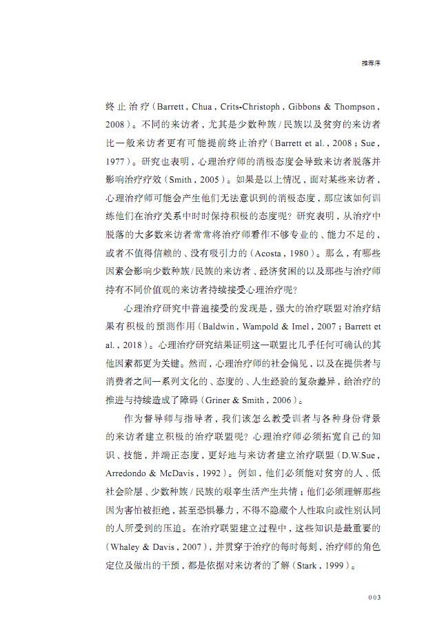 此书的出版象征着中国心理咨询和督导行业的一大进步,让人兴奋。西方心理学研究证明对多元文化和多元人群的关注是所有心理治疗、咨询和督导成功的必不可少因素。此书的 英文版是美国出版的第一本专注临床督导中多元文化和多元群体议题的书。译者能及时把它带给中国读者以引起与本土结合的讨论,实在可佳。