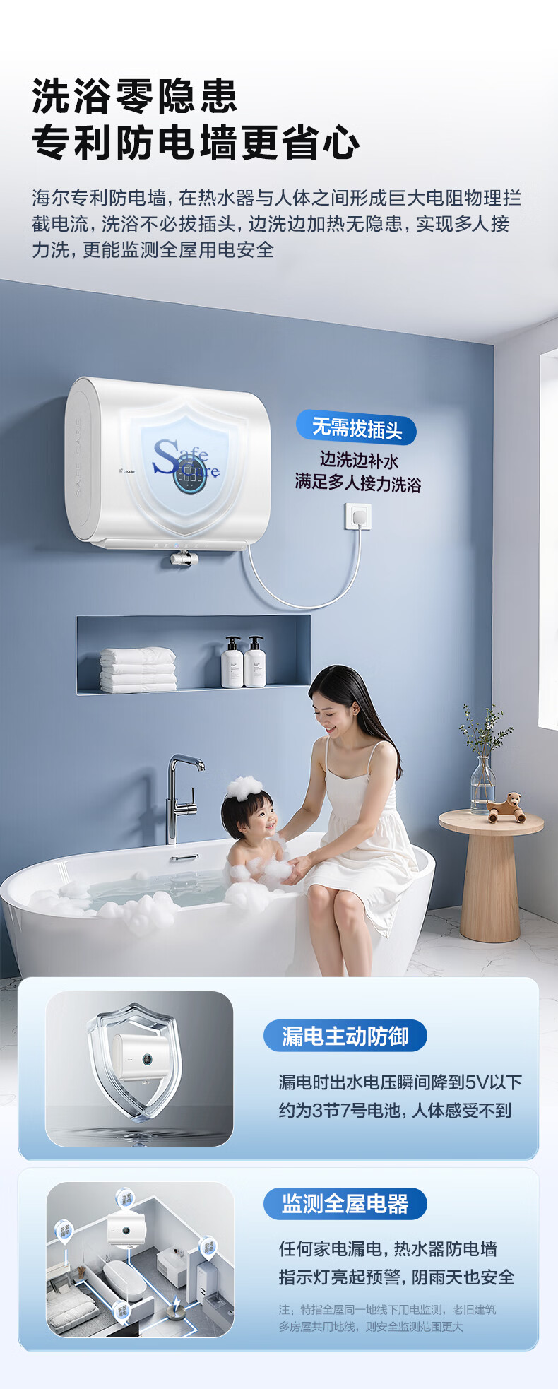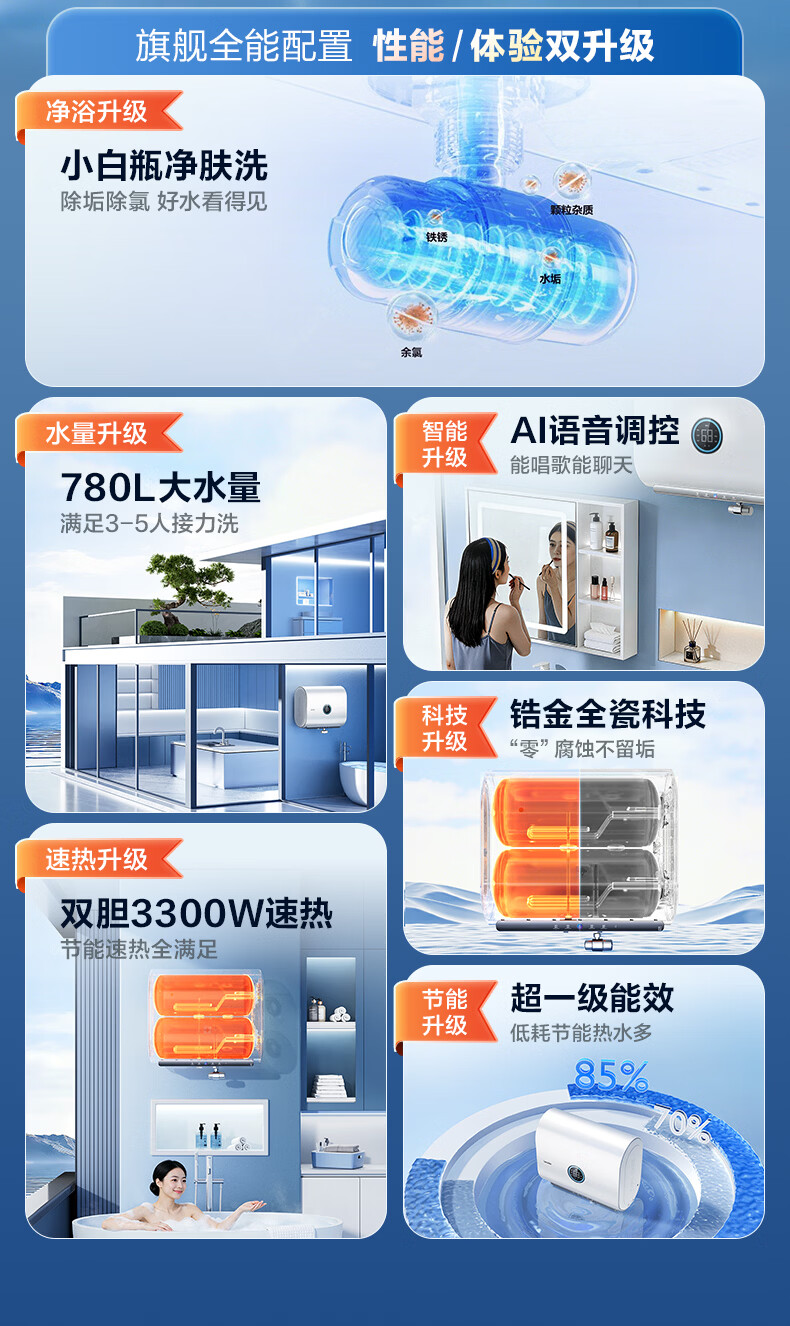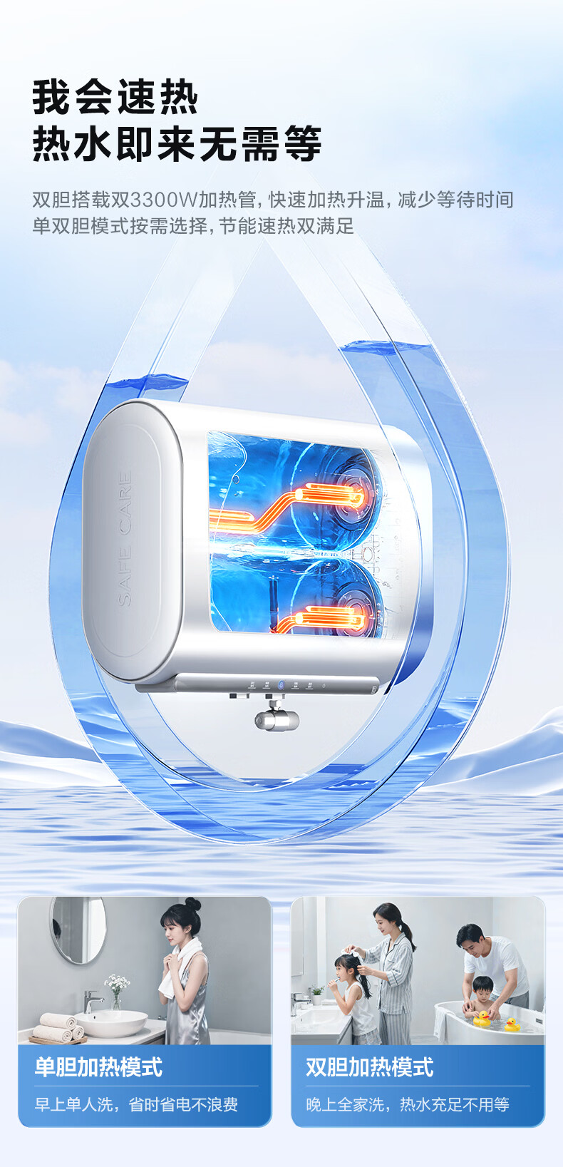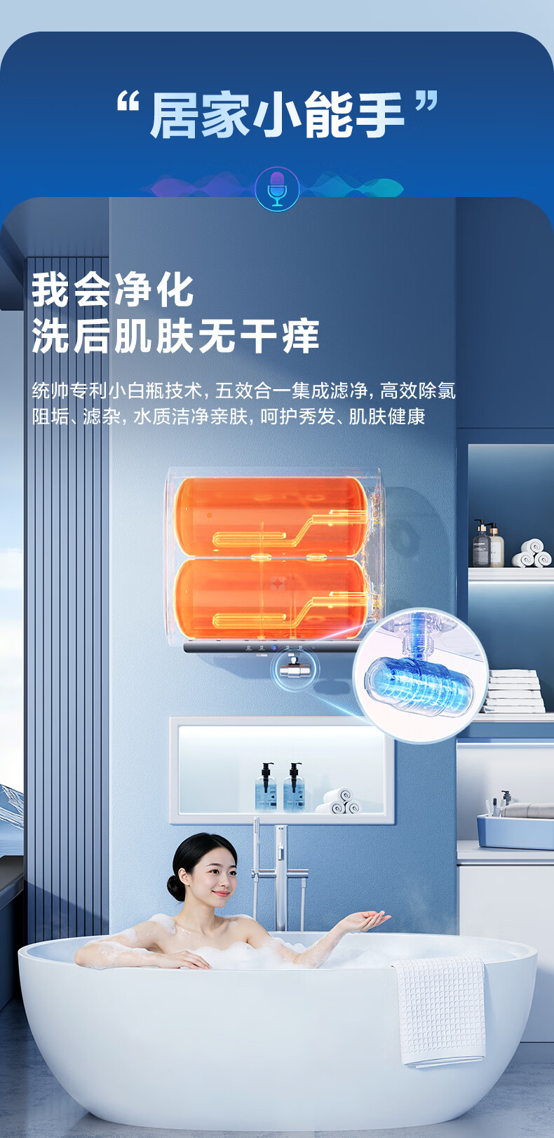 海尔出品统帅懒人系列60升双胆扁桶电热水器小白瓶母婴级净肤AI语音3300W一级能效国家补贴小音浪F7PRO