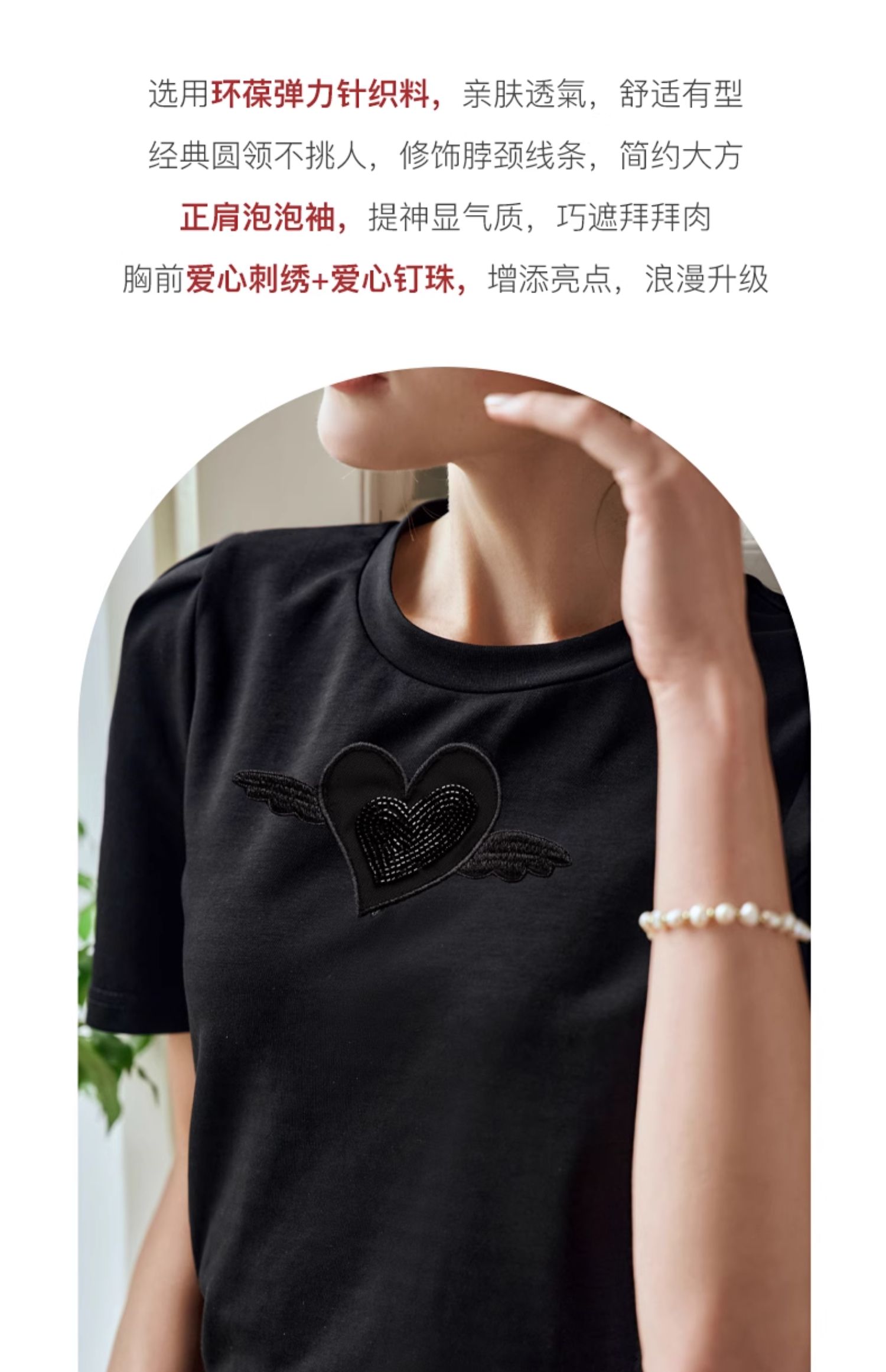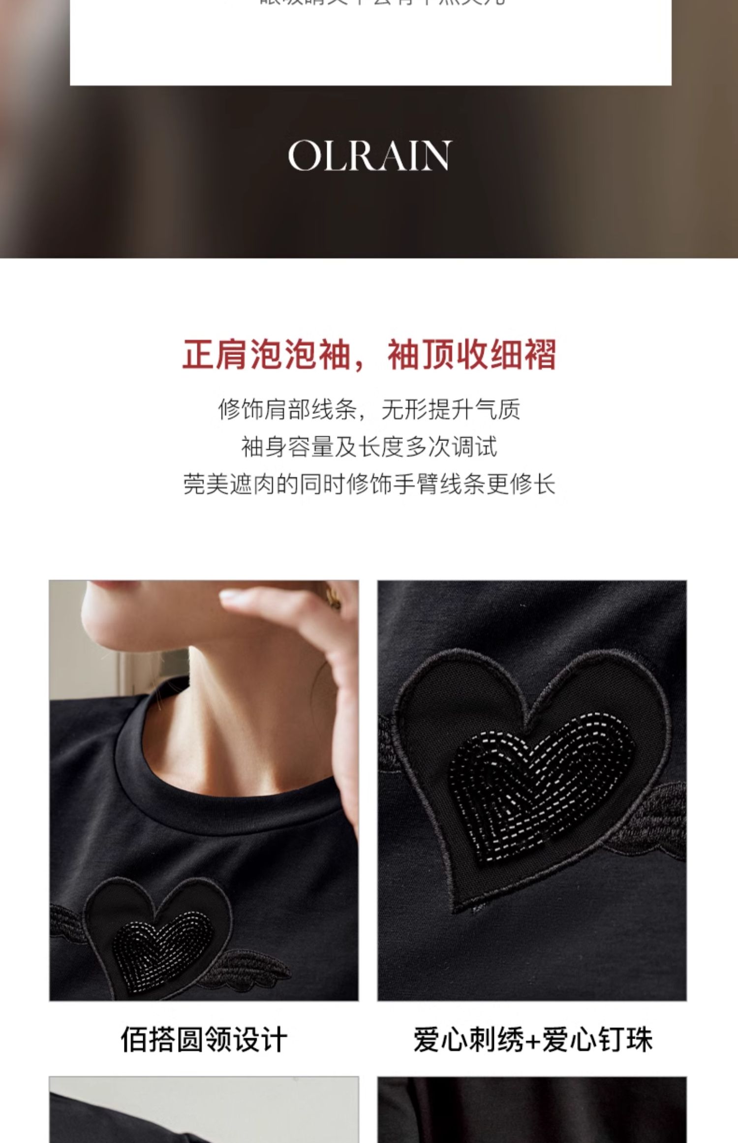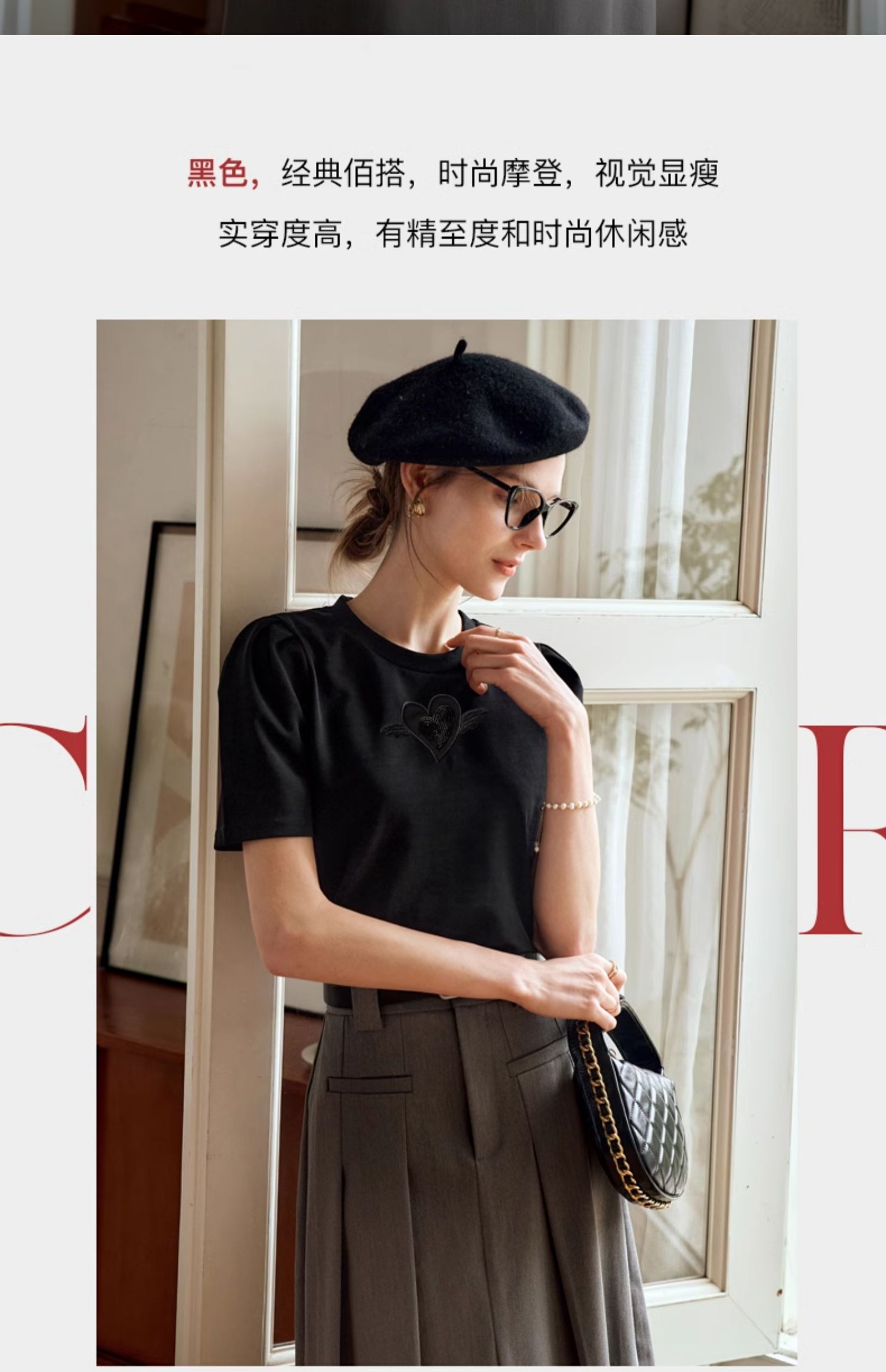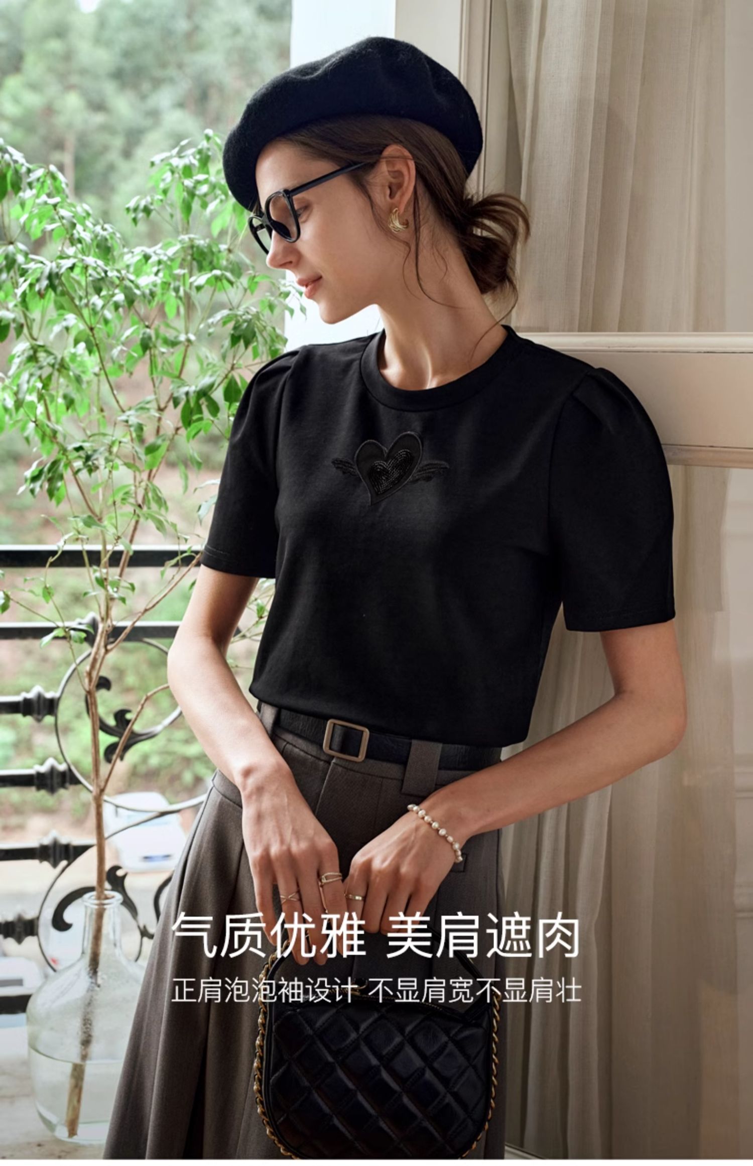 OLrain欧芮儿黑色短袖T恤女夏季2024年新款宽松爱心镂空圆领上衣