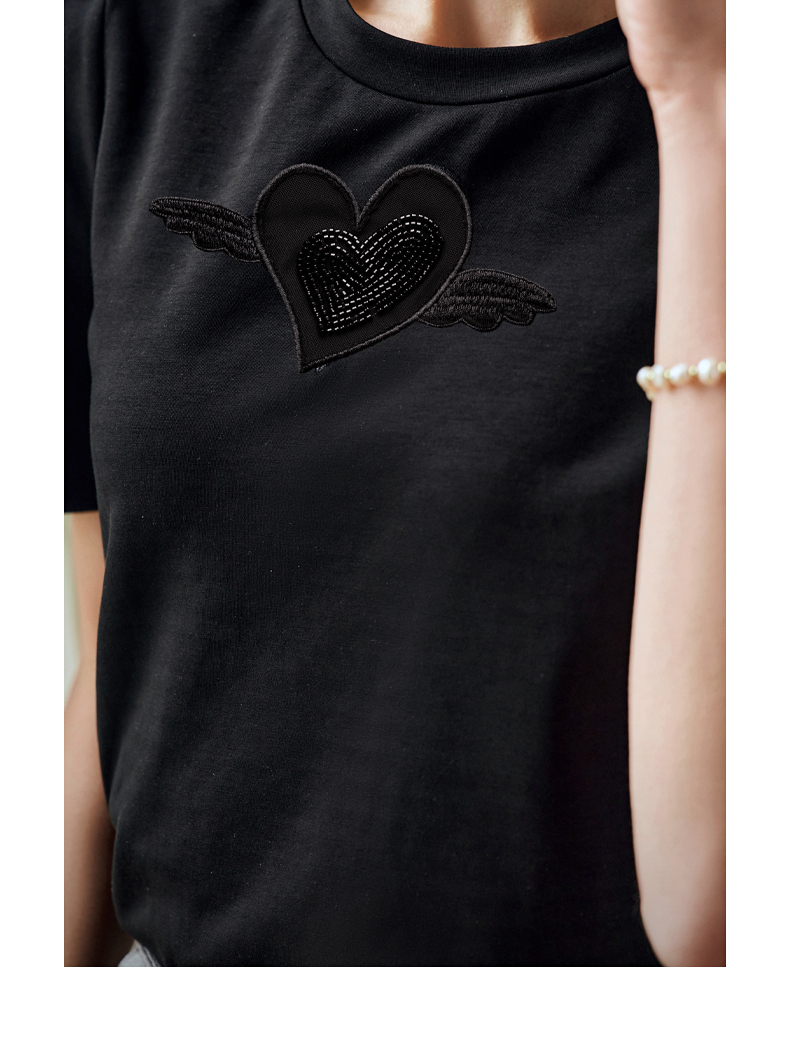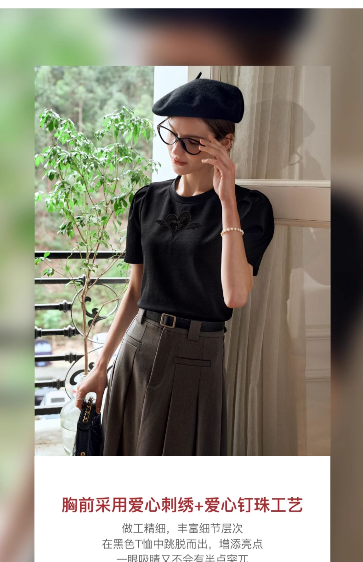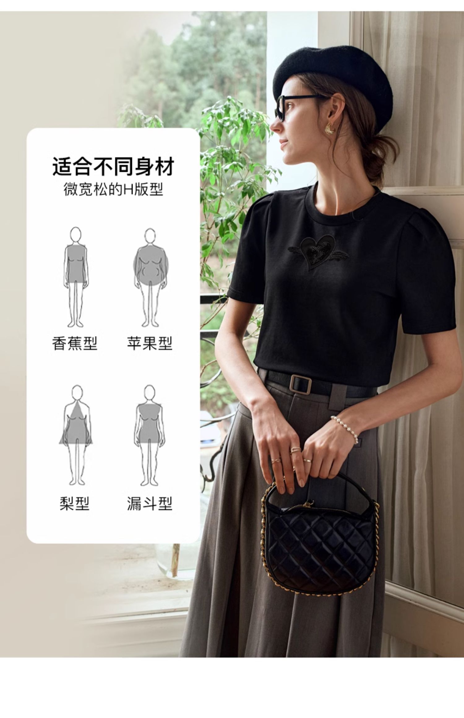 OLrain欧芮儿黑色短袖T恤女夏季2024年新款宽松爱心镂空圆领上衣