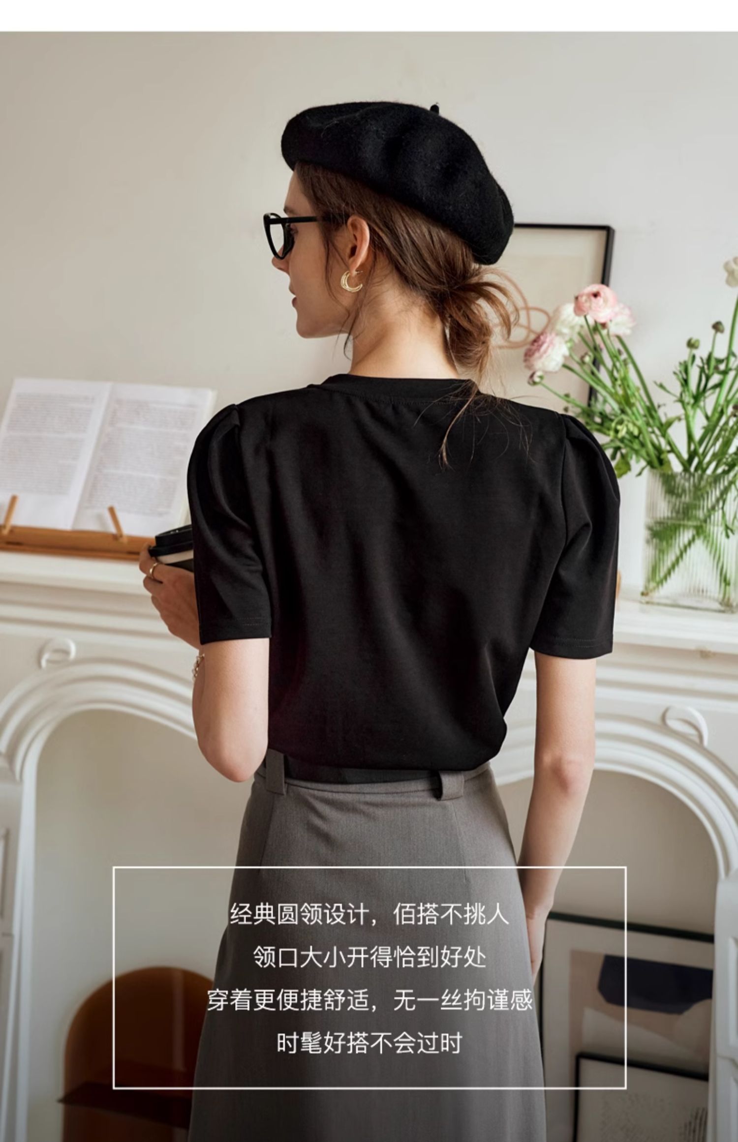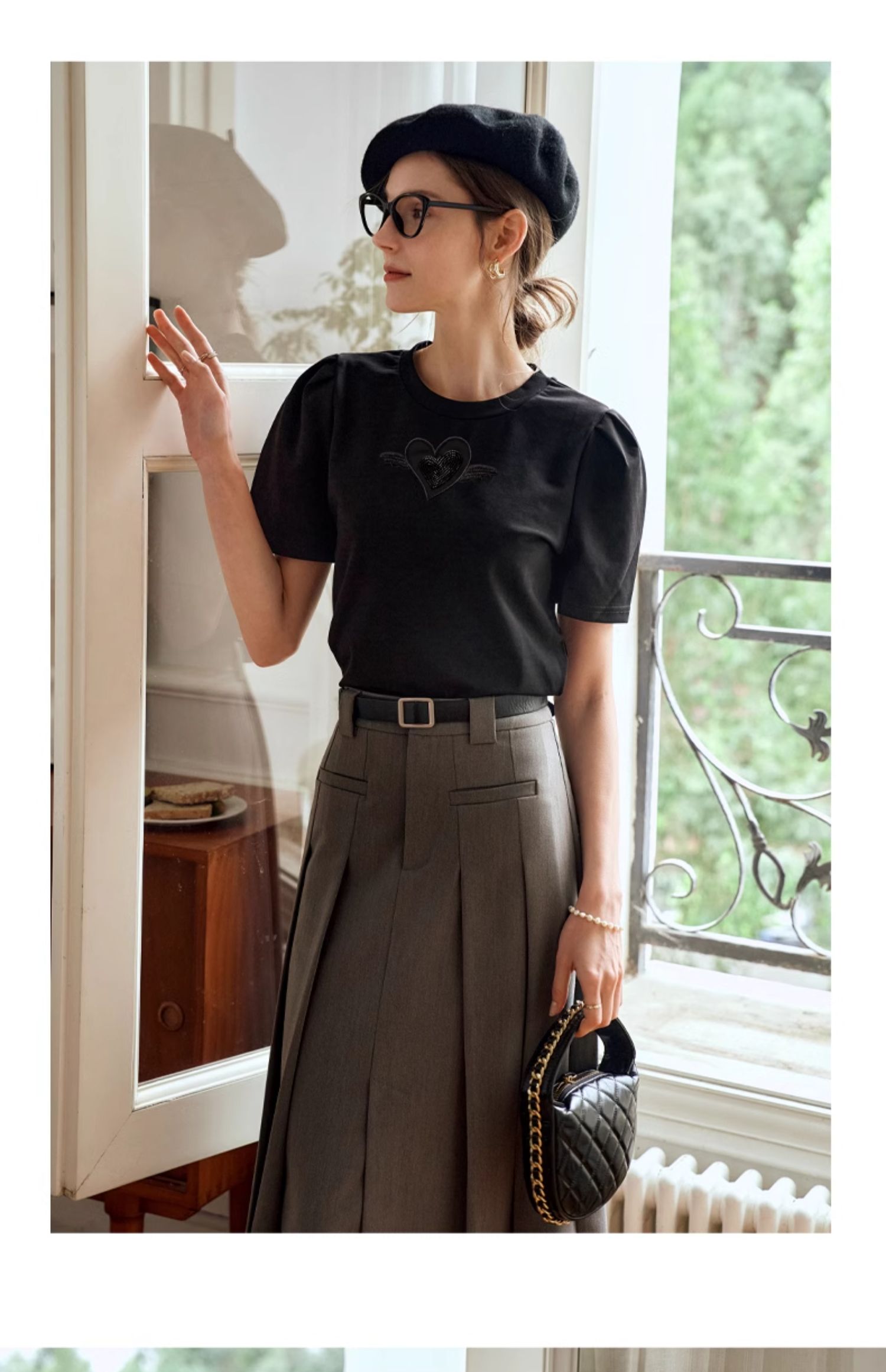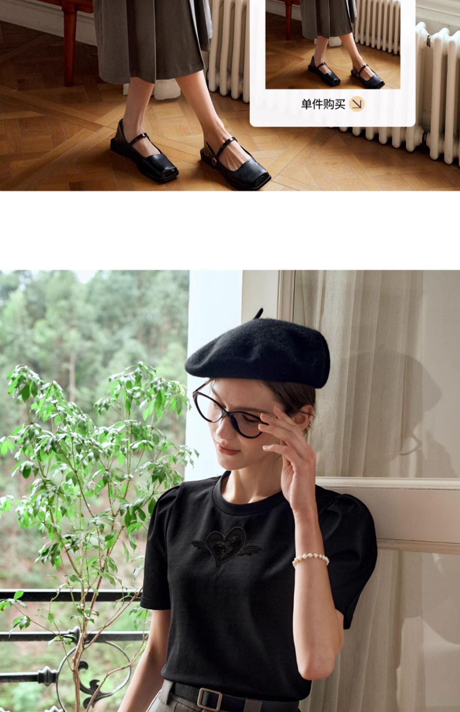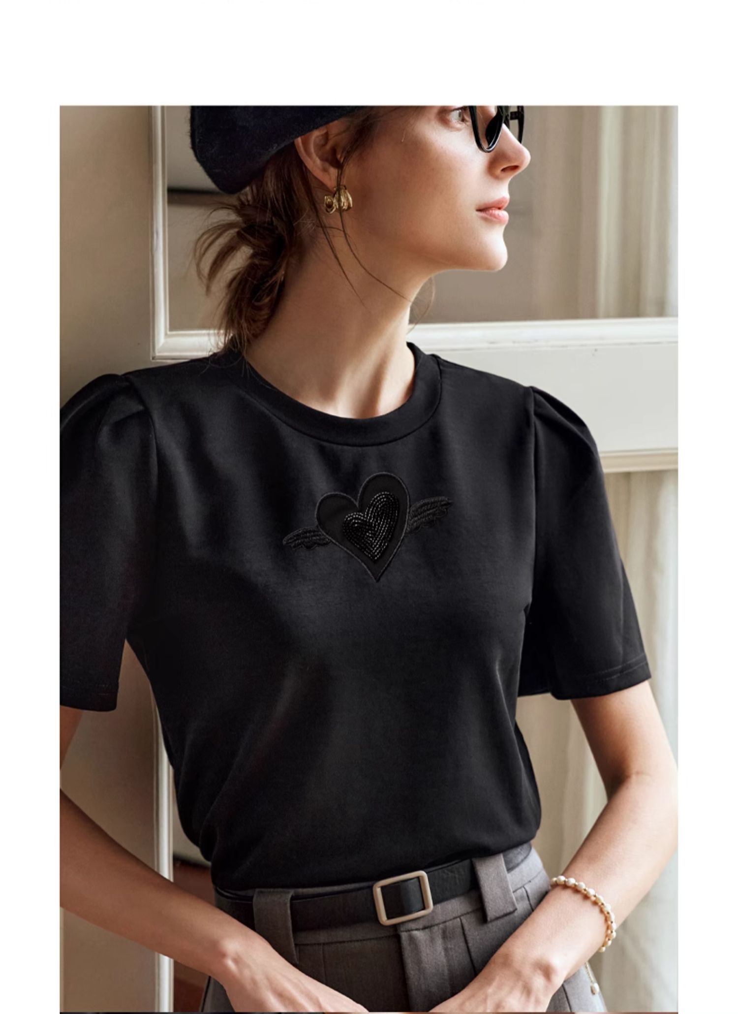 OLrain欧芮儿黑色短袖T恤女夏季2024年新款宽松爱心镂空圆领上衣