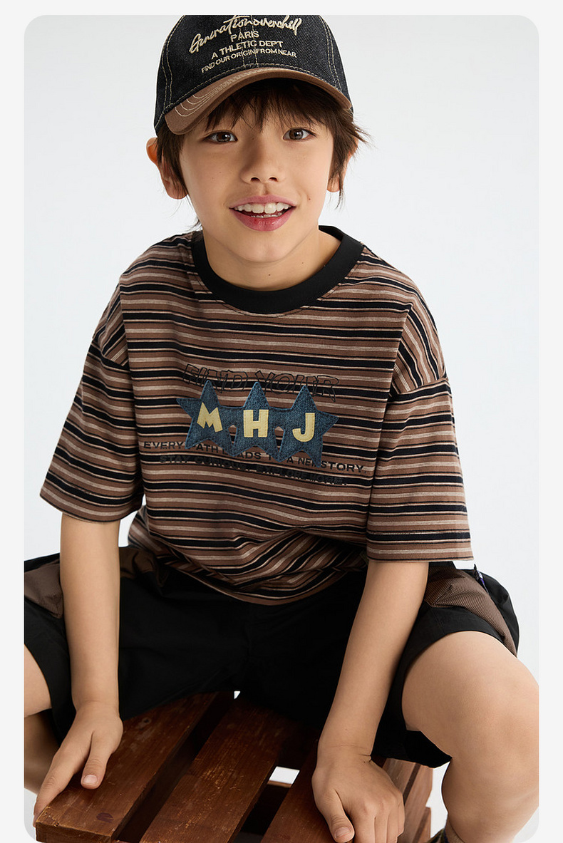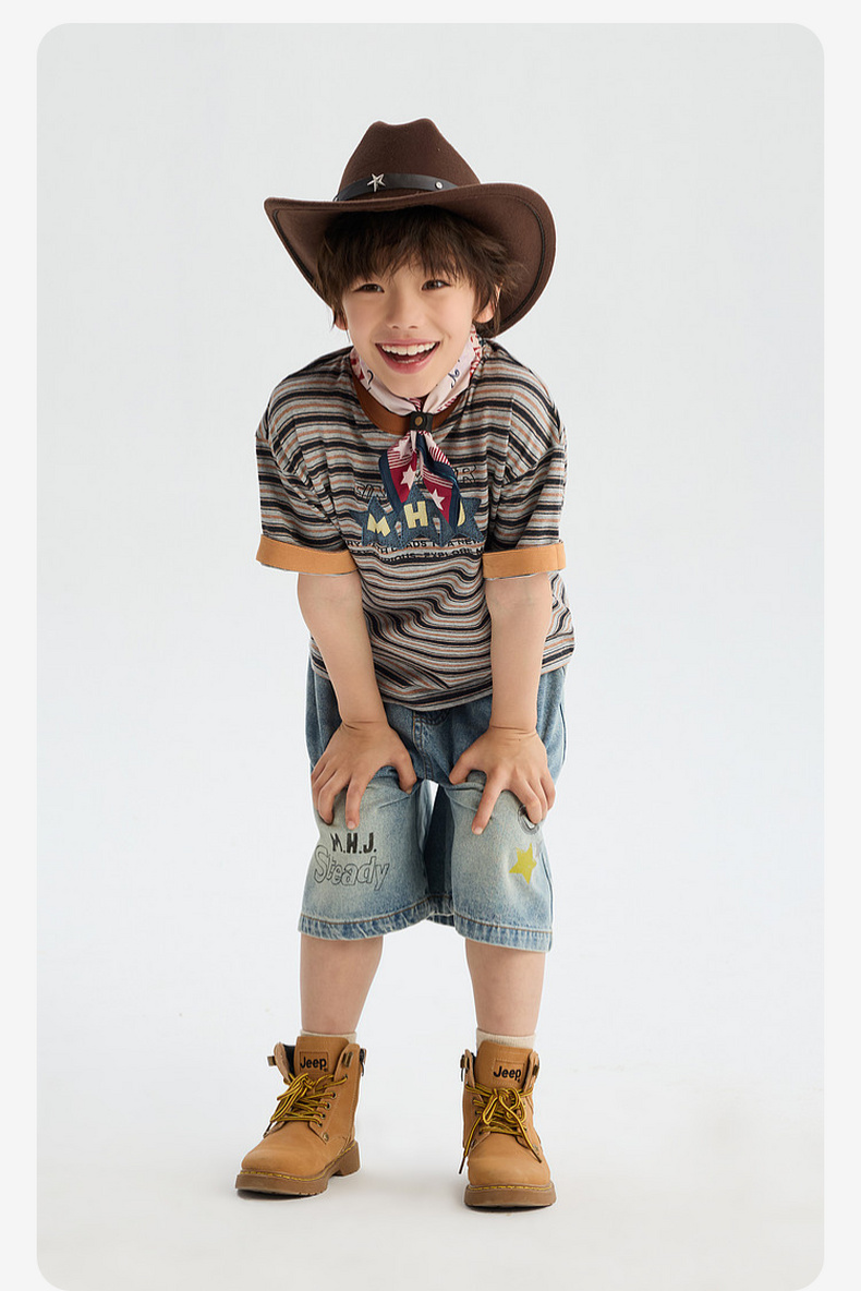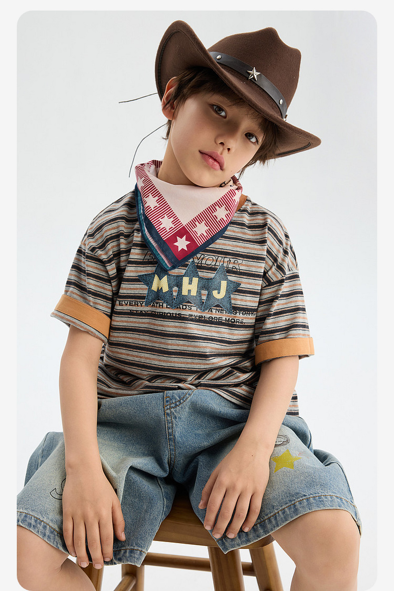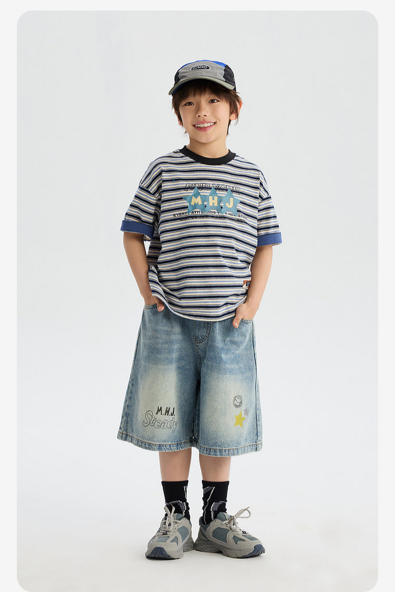 MANHOJIA【牛仔星星T】儿童T恤牛仔印花复古条纹全棉亲肤短袖T