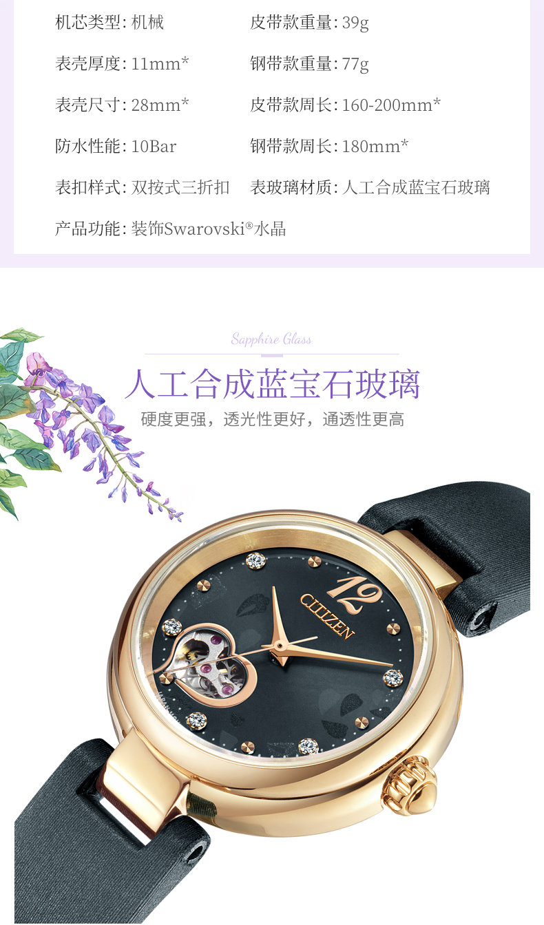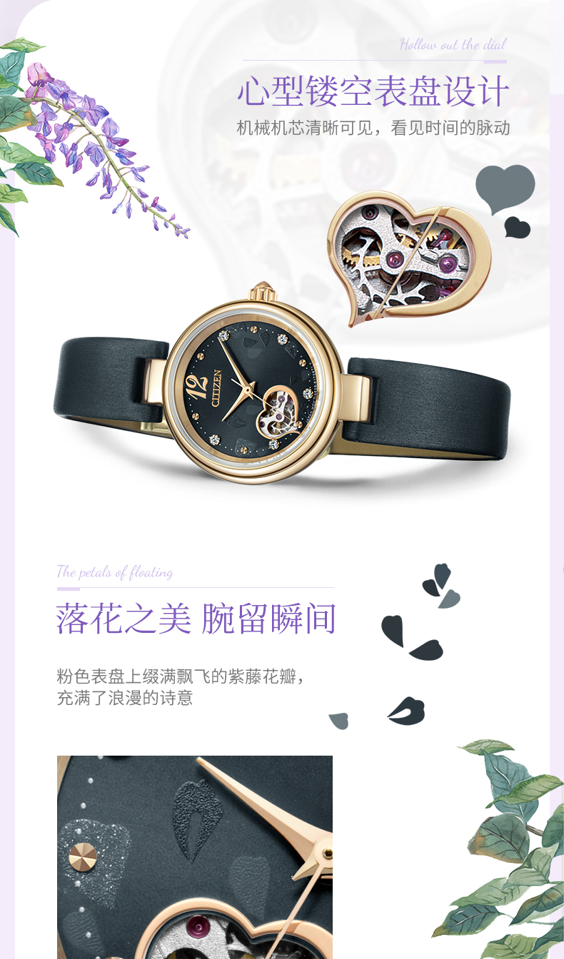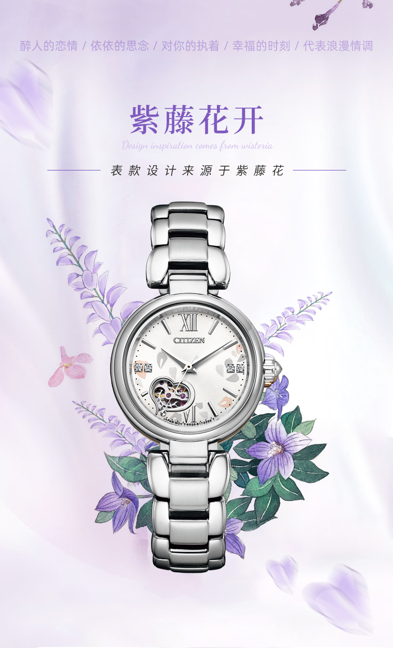 西铁城日本官方正品紫藤花心型镂空水晶装饰机械女士手表PR1020-85A