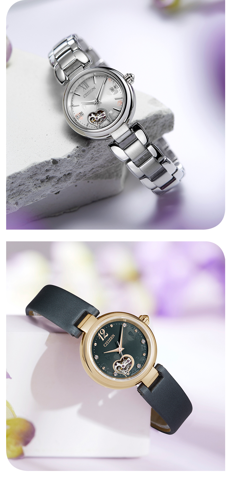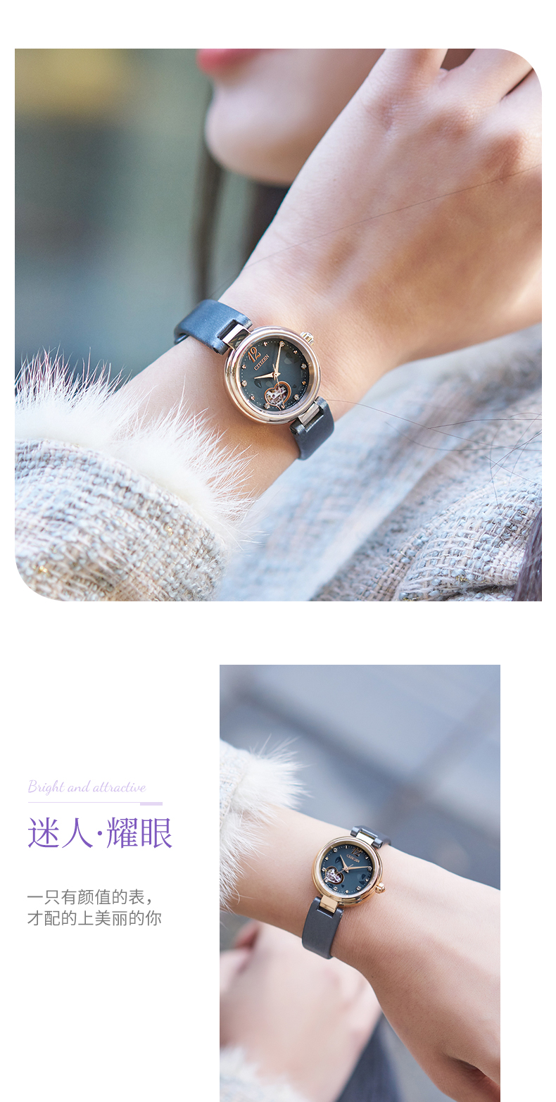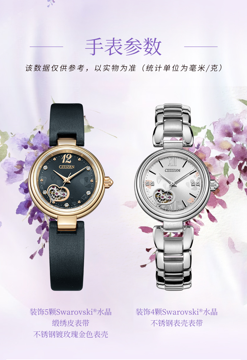 西铁城日本官方正品紫藤花心型镂空水晶装饰机械女士手表PR1020-85A