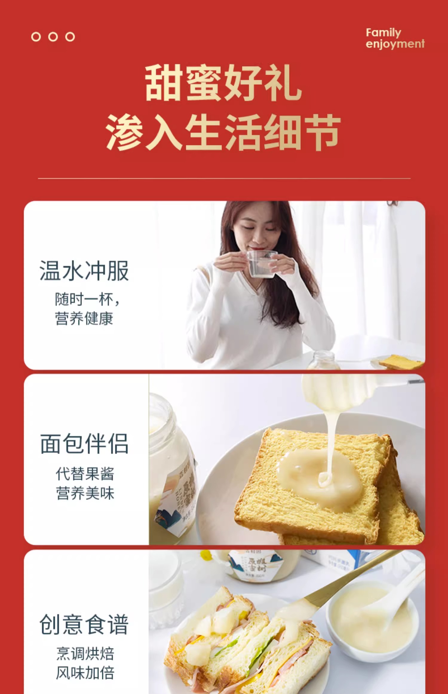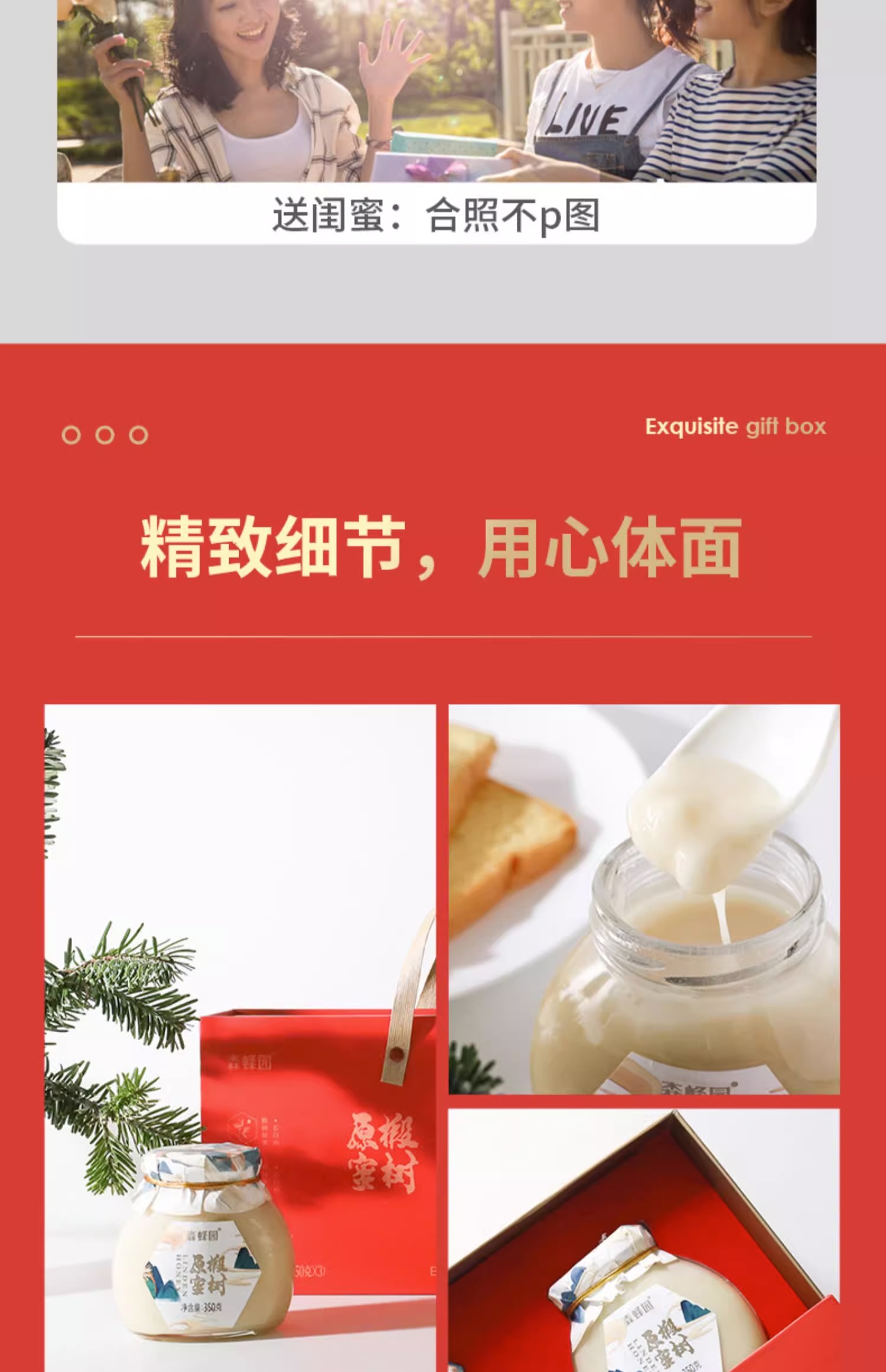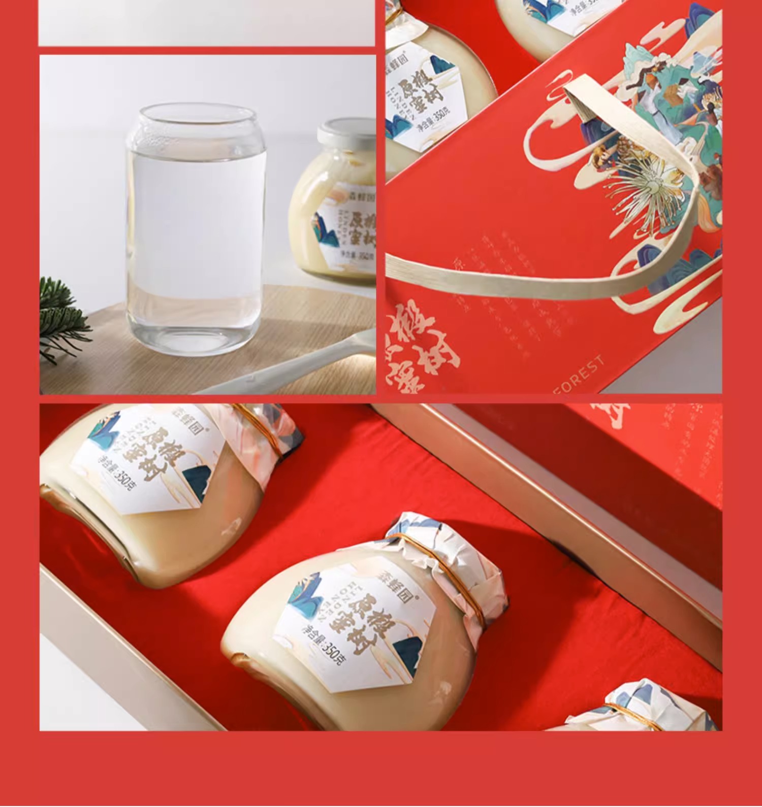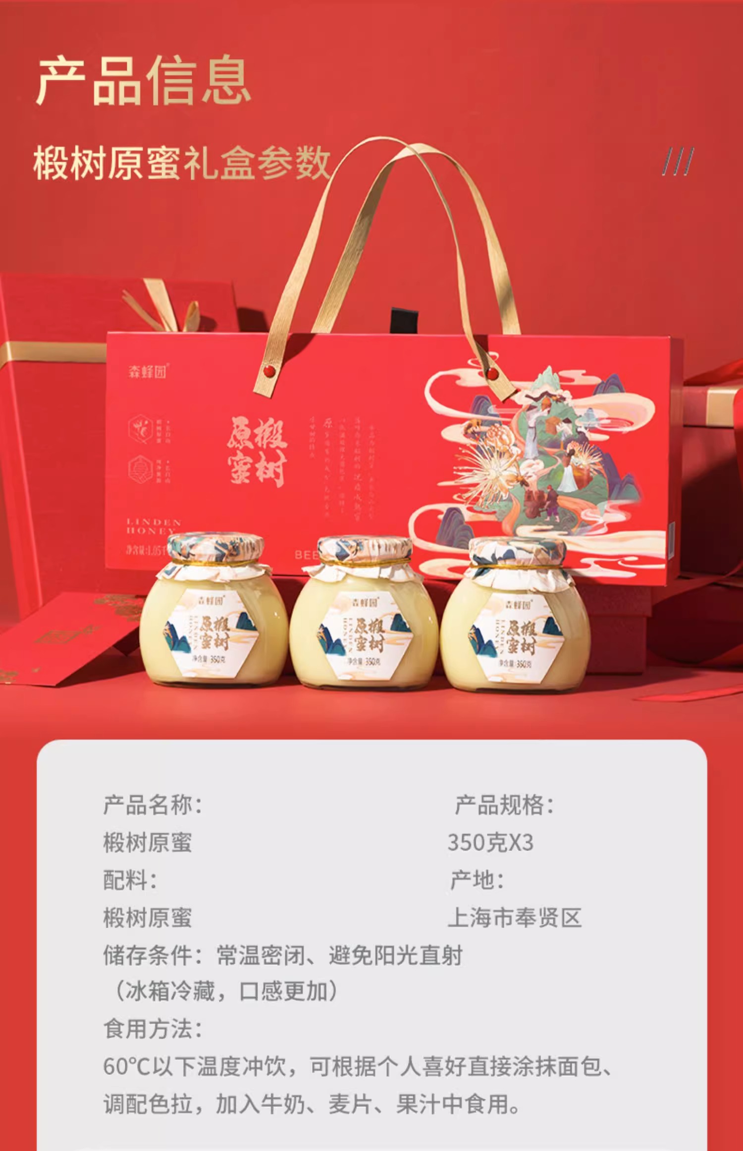 【椴树蜂蜜礼盒】来自长白山纯天然椴树蜜!配料简单,含有丰富的营养成分,活性酶含量是普通蜂蜜的三倍!口感甜而不腻,可搭配面包/空口吃/泡水喝等!350g*3瓶(礼盒装)!