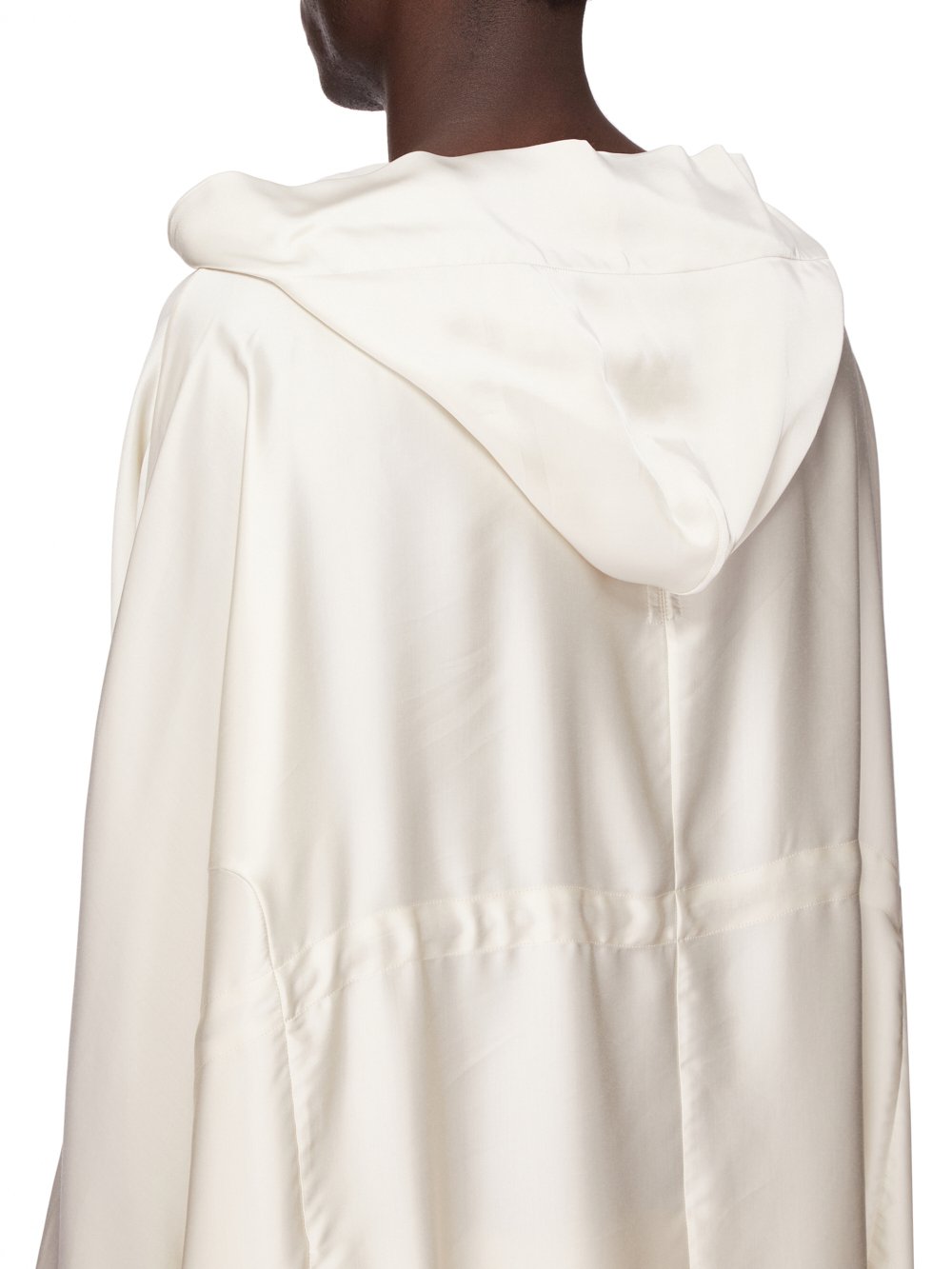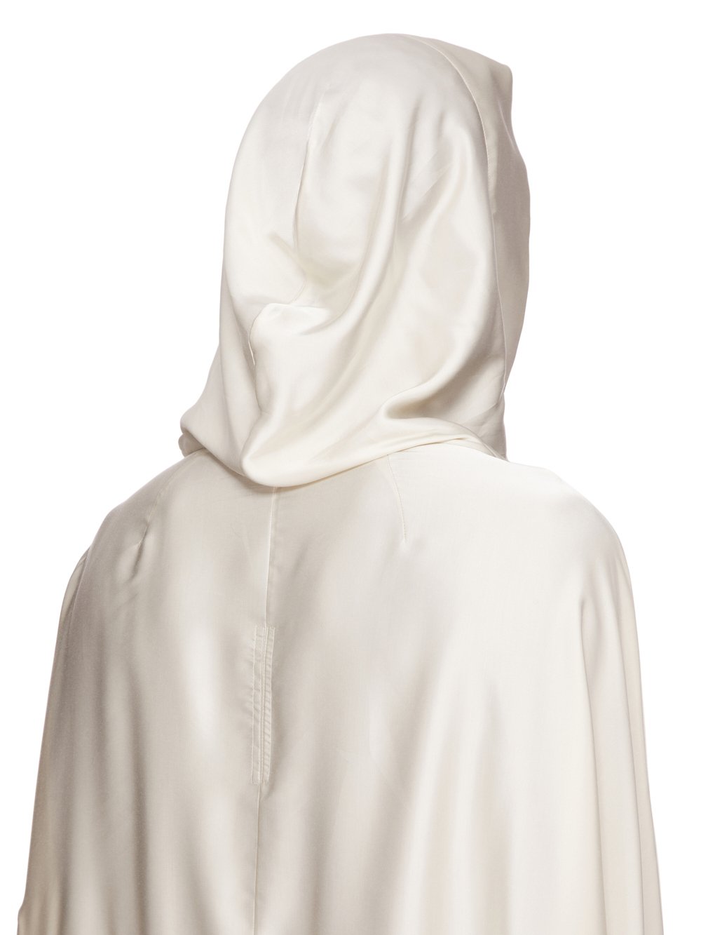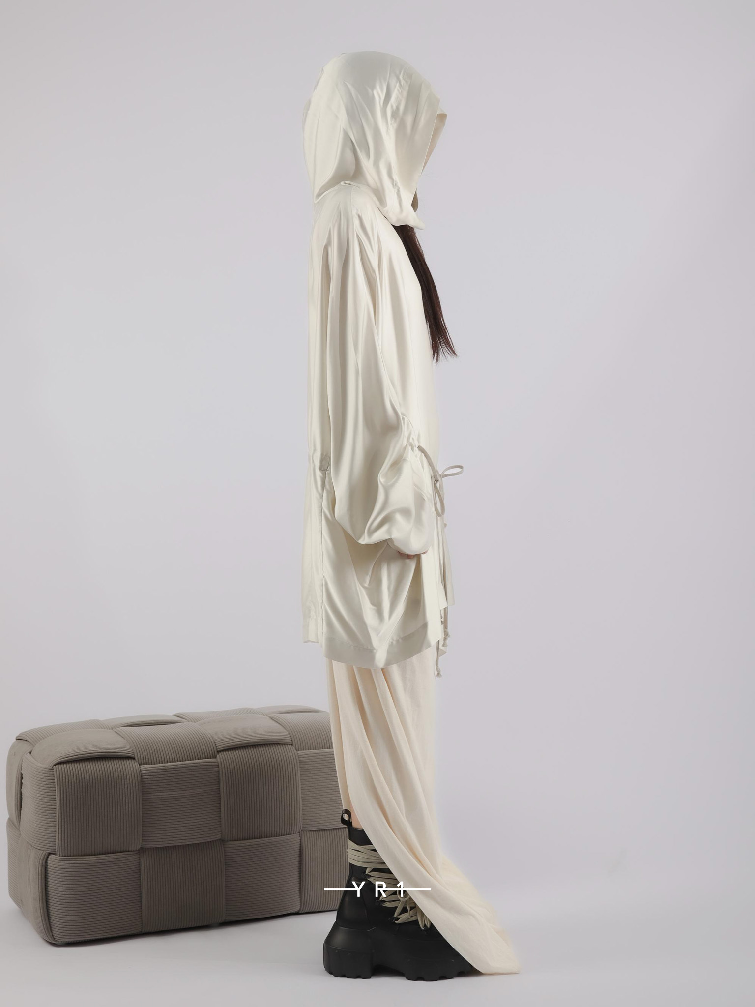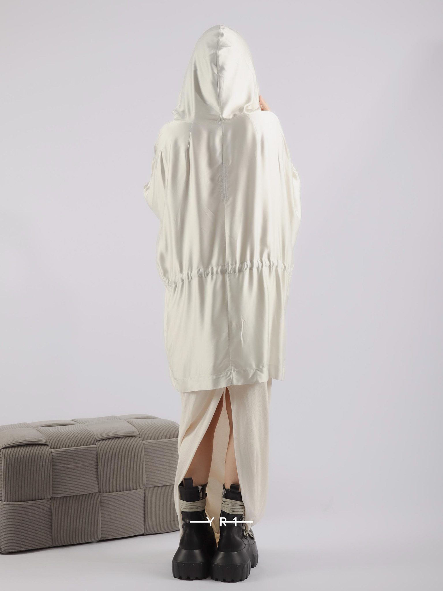 它有一个大兜帽,垂在前颈处,宽大的方形衣身可以收拢,腰部有一根绳子。