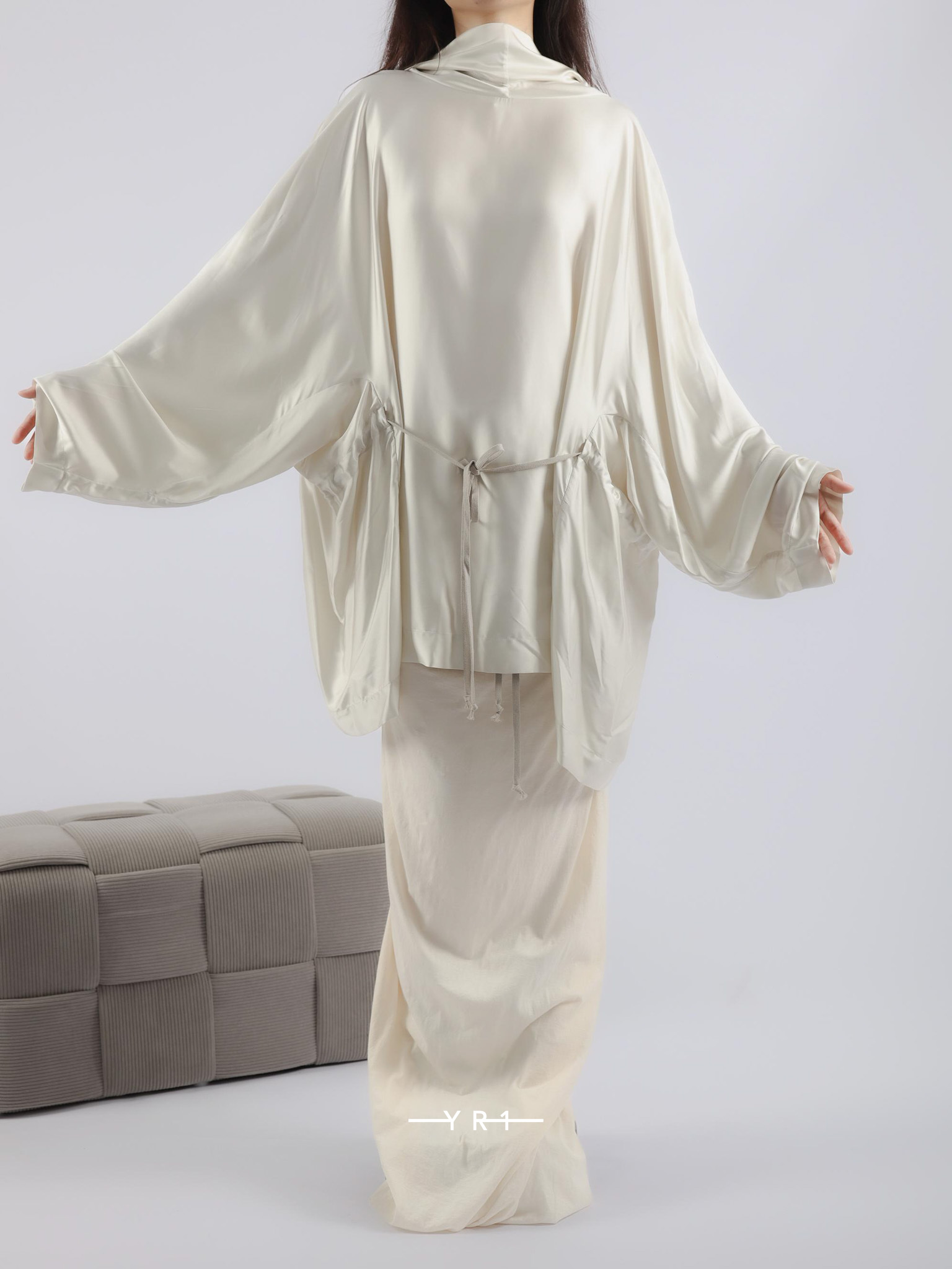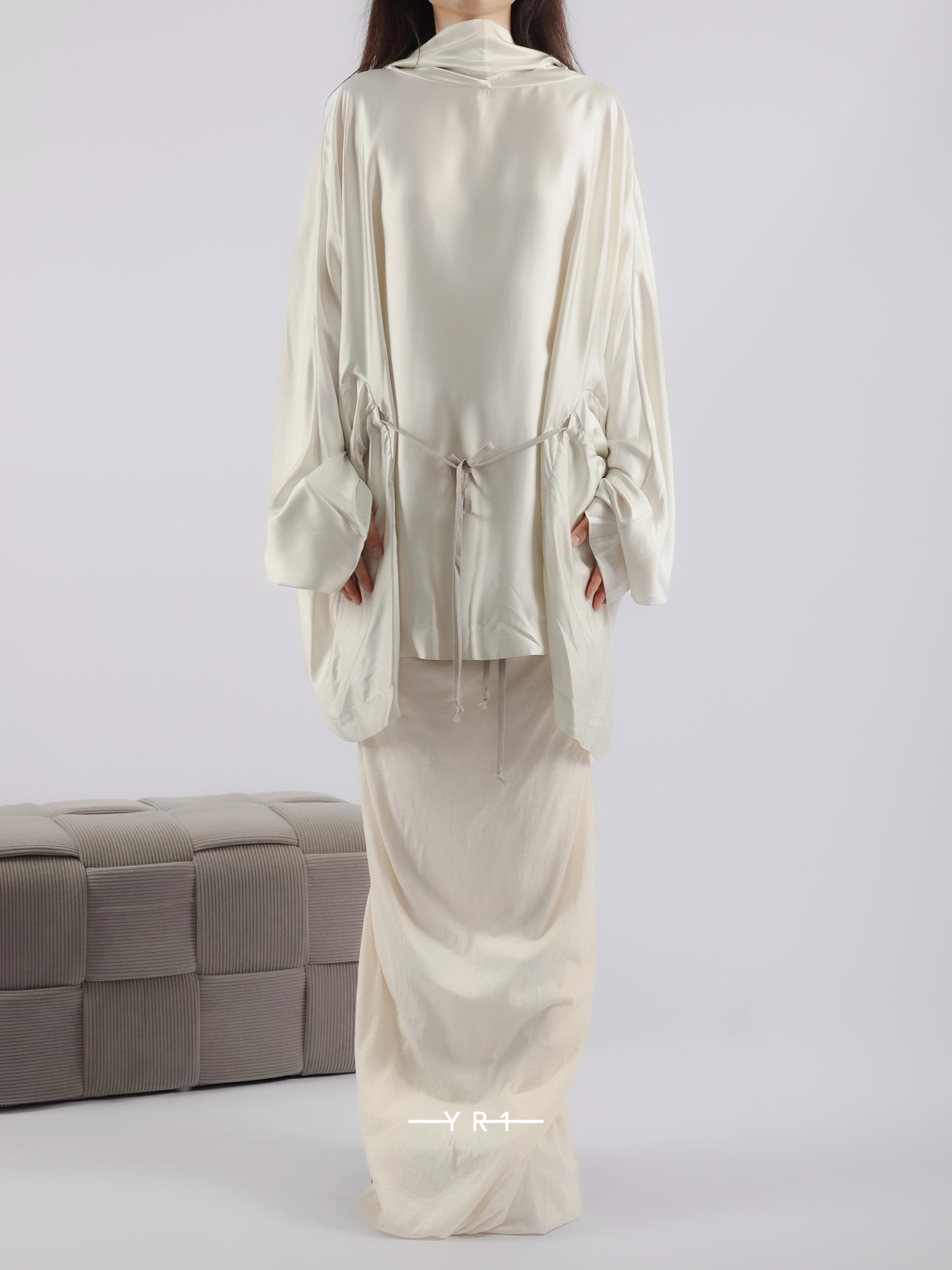 这款轻盈流畅的素绉缎表面呈半光泽,经过水洗处理。