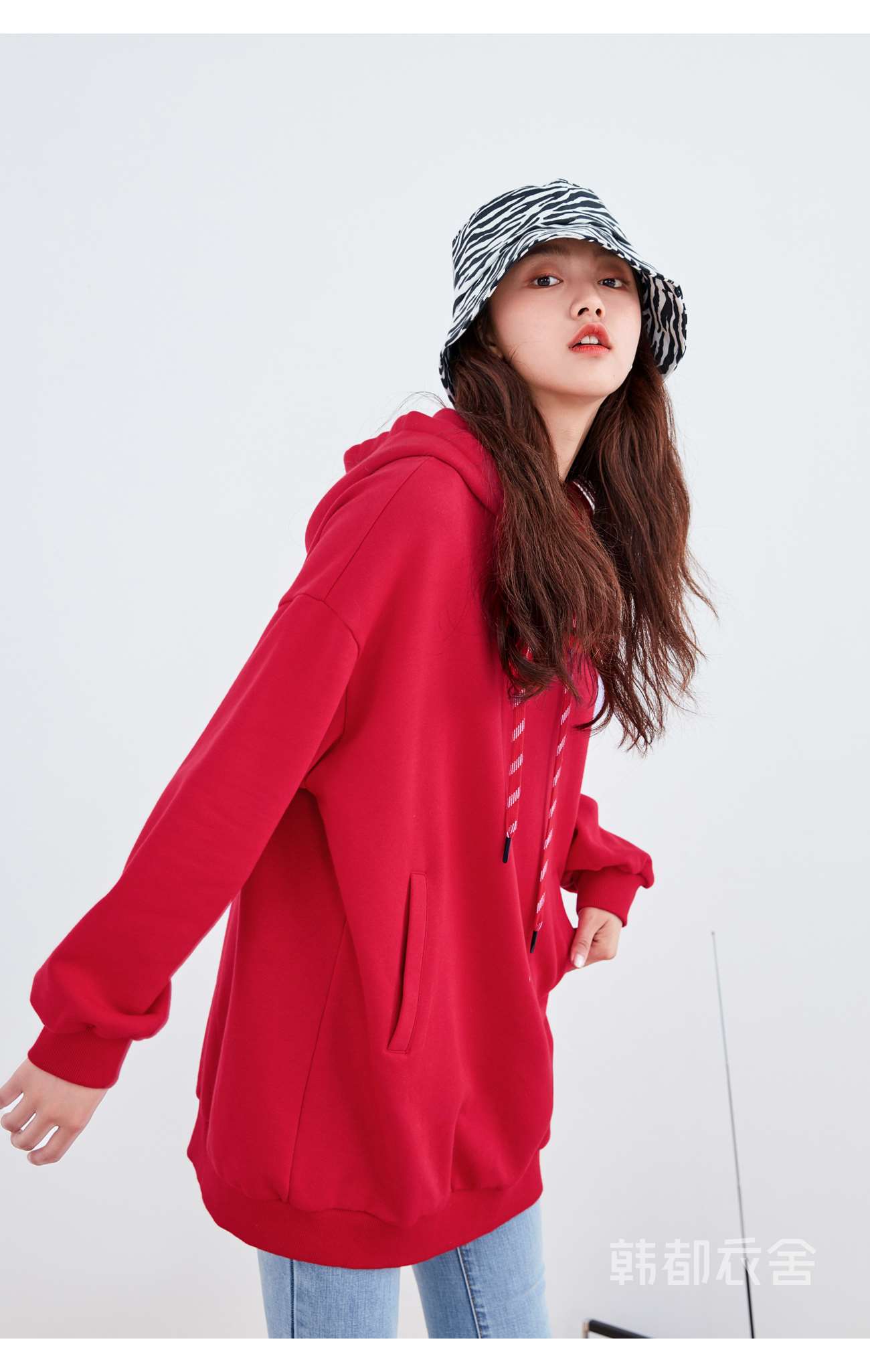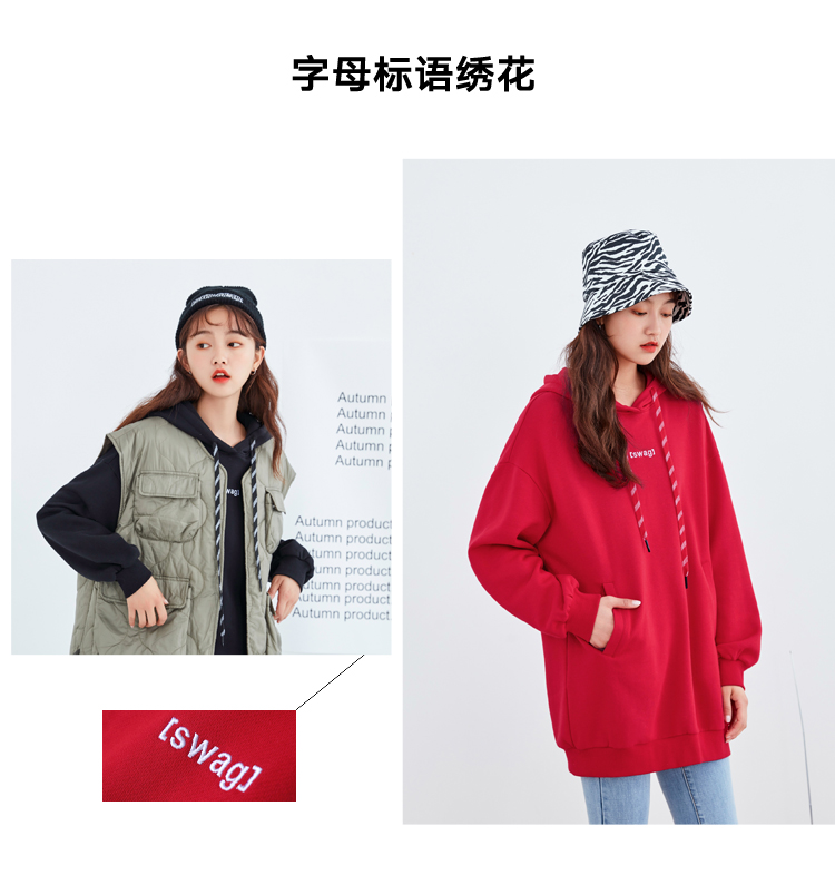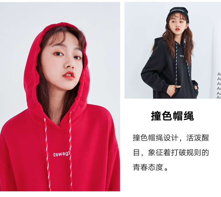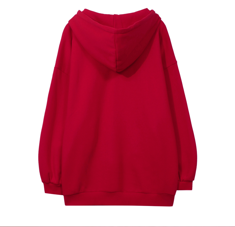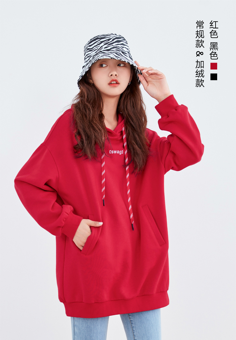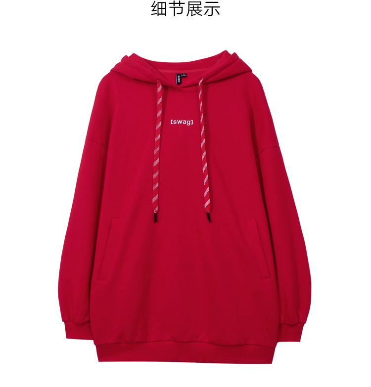 韩都衣舍2021春新款韩版慵懒中长款新年红色连帽卫衣女OU13545