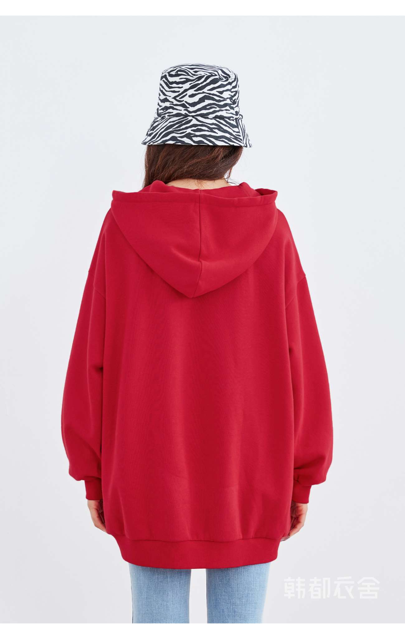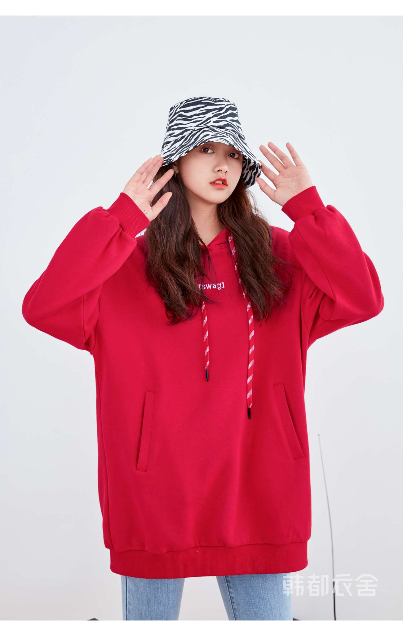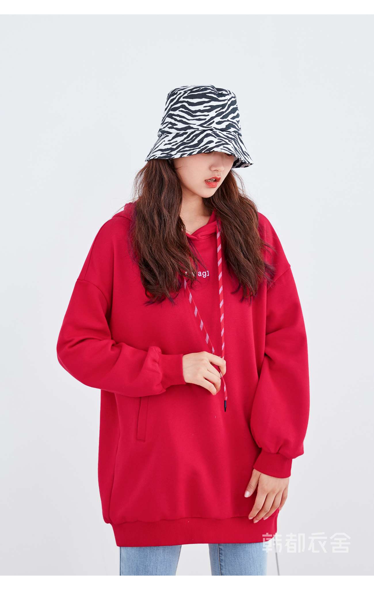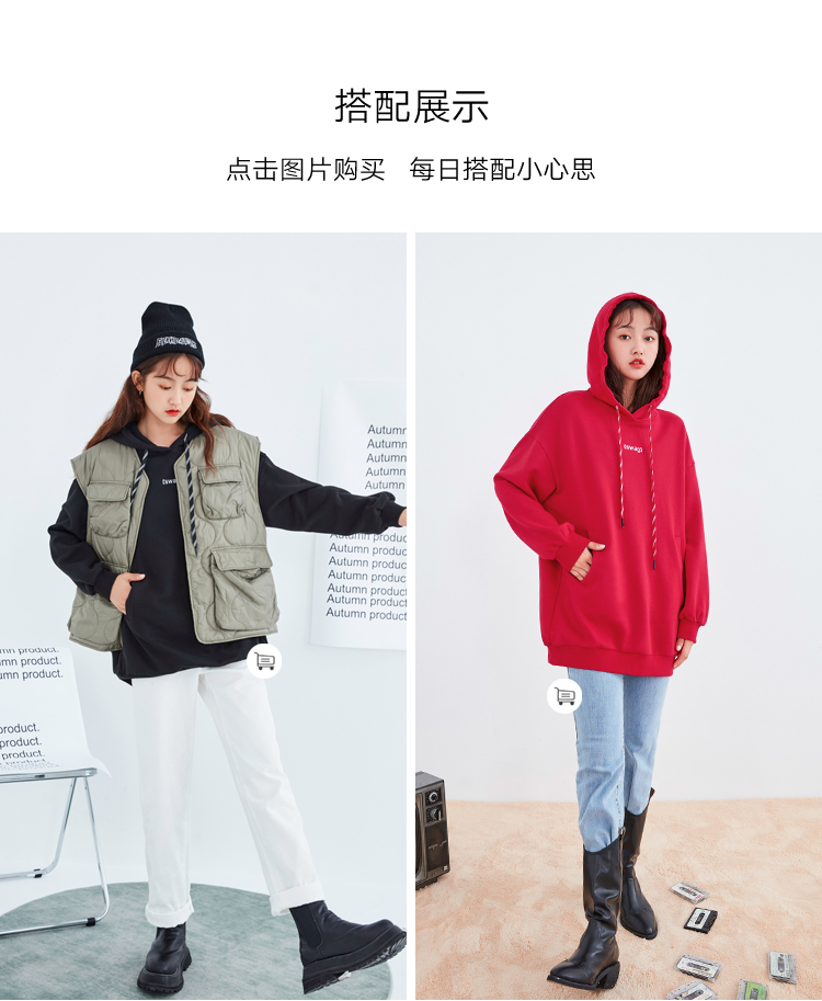 韩都衣舍2021春新款韩版慵懒中长款新年红色连帽卫衣女OU13545