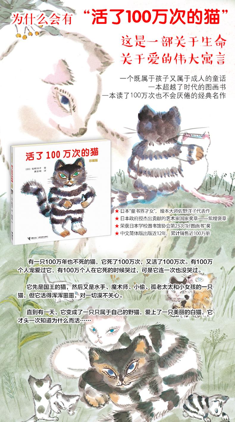 佐野洋子著唐亚明译的《活了100万次的猫(珍藏版)(精)》是一本给4-7岁孩子看的经典图画书名作,讲述的是有一只100万年也不死的猫,他死了100万次,又活了100万次。有100万个人宠爱过他,有100万个人在他死的时候哭过,可是他连一次也没有哭过,他先是国王的猫,然后又是水手、魔术师、小偷、孤老太太和小女孩的猫,但他对一切漠不关心,直到有一天,他变成了一只只属于自己的野猫,爱上了一只美丽的白猫,他才头一次知道为什么而活……