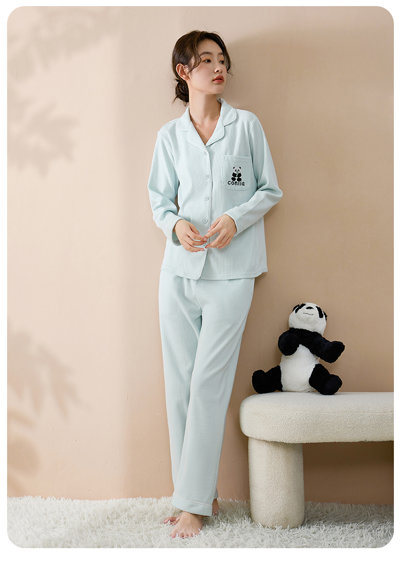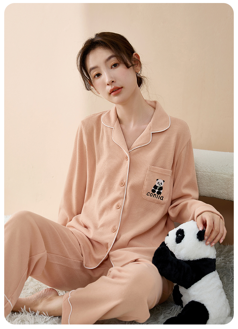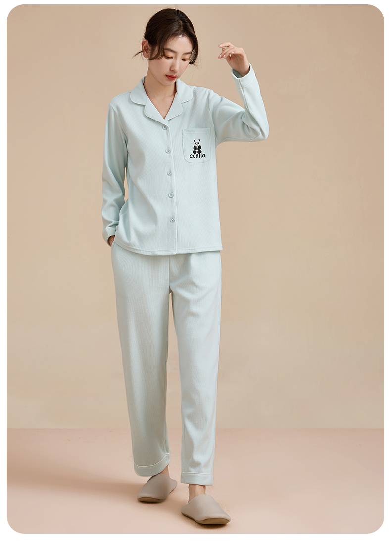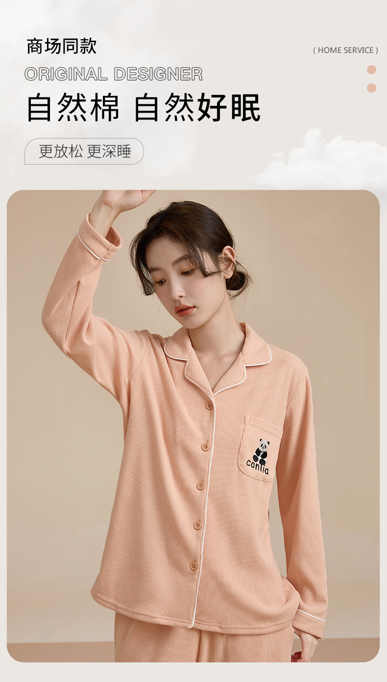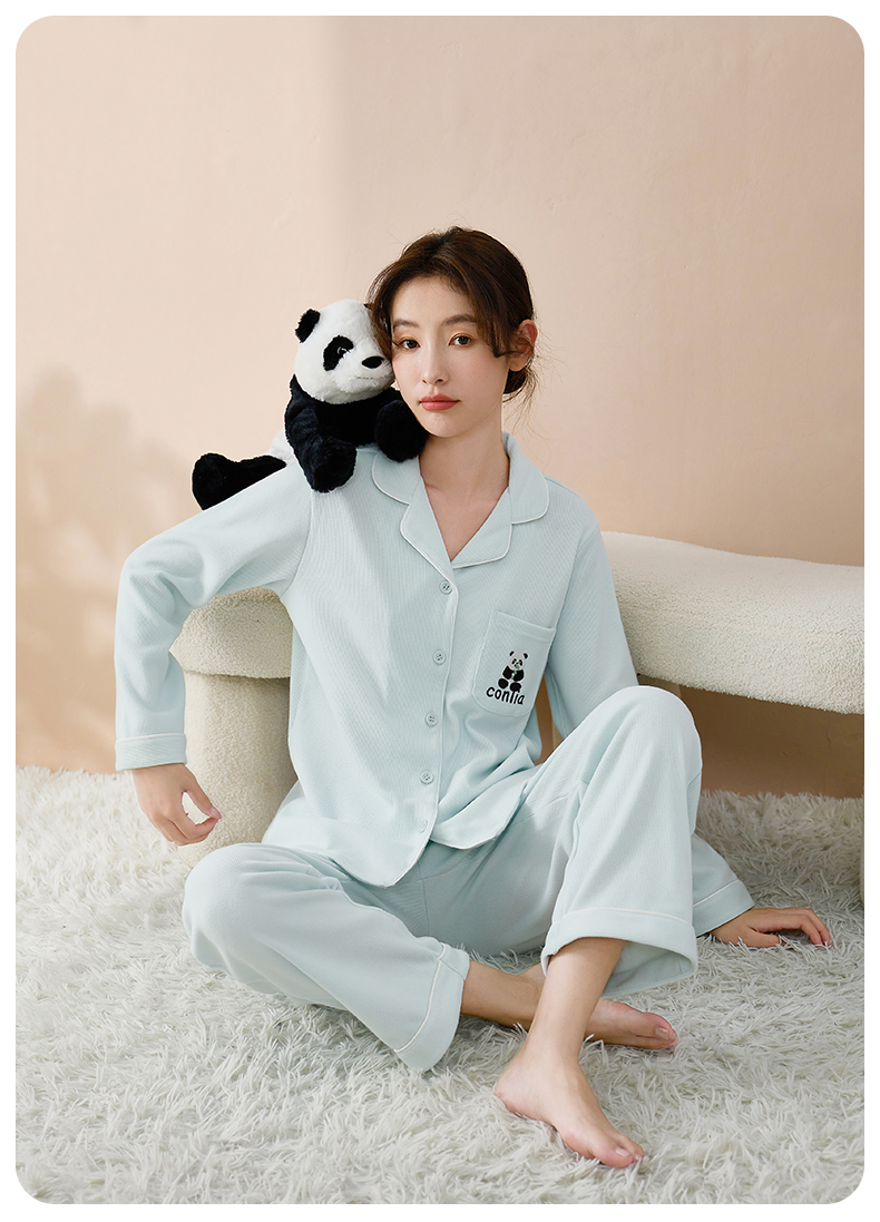 康妮雅睡衣女式长袖长裤开襟套装