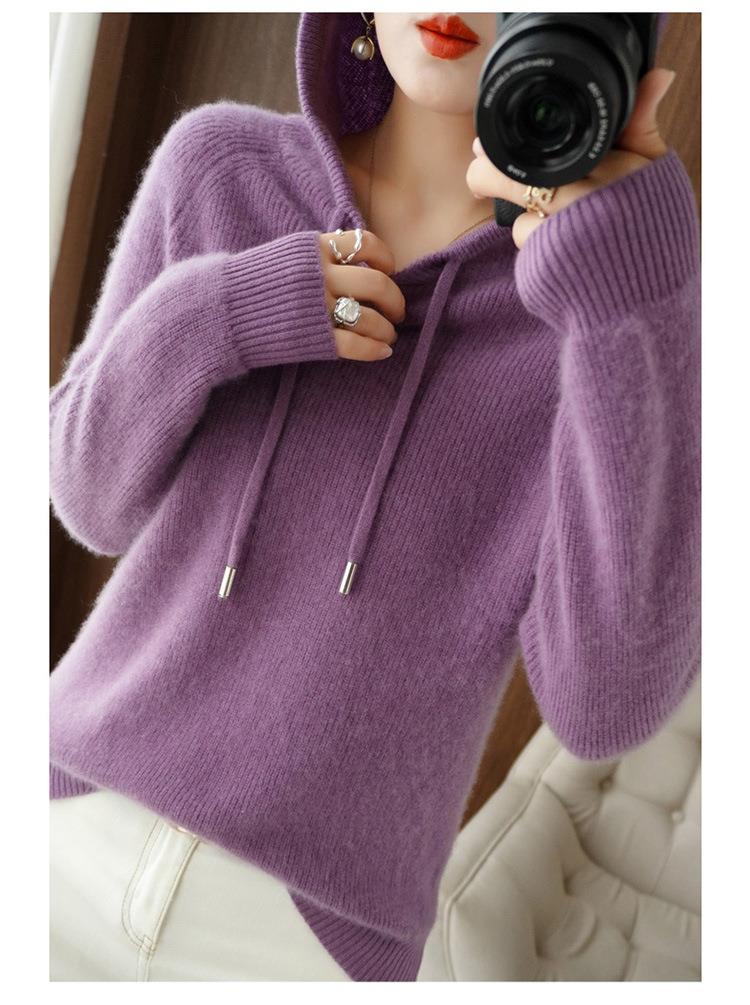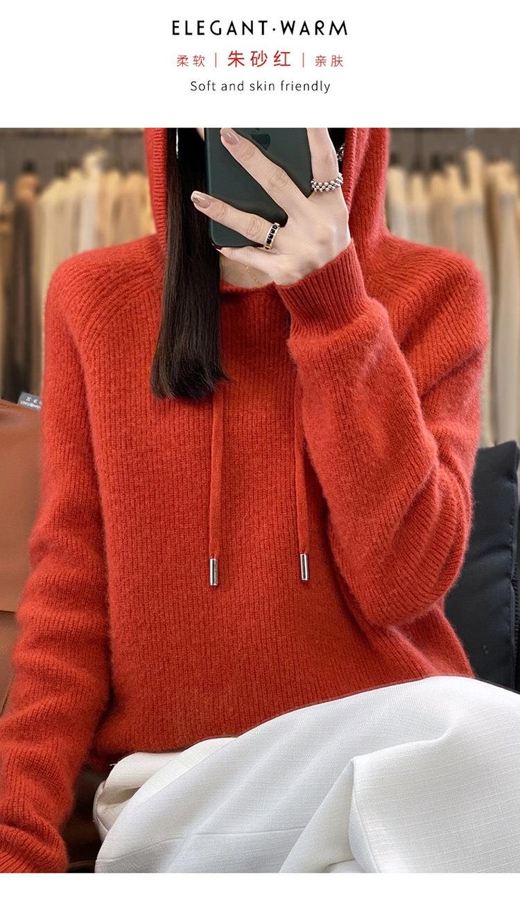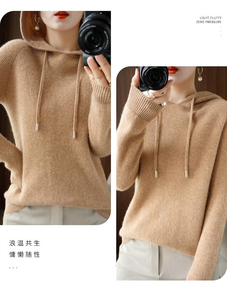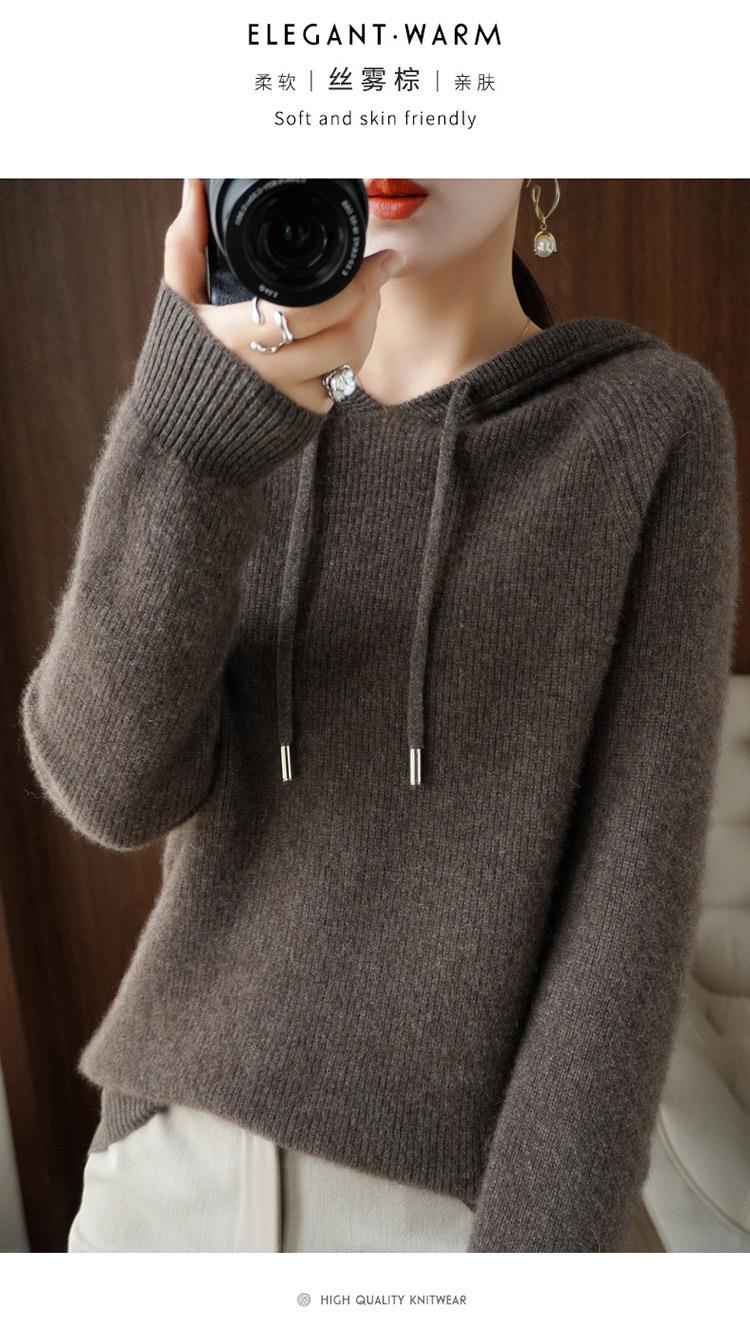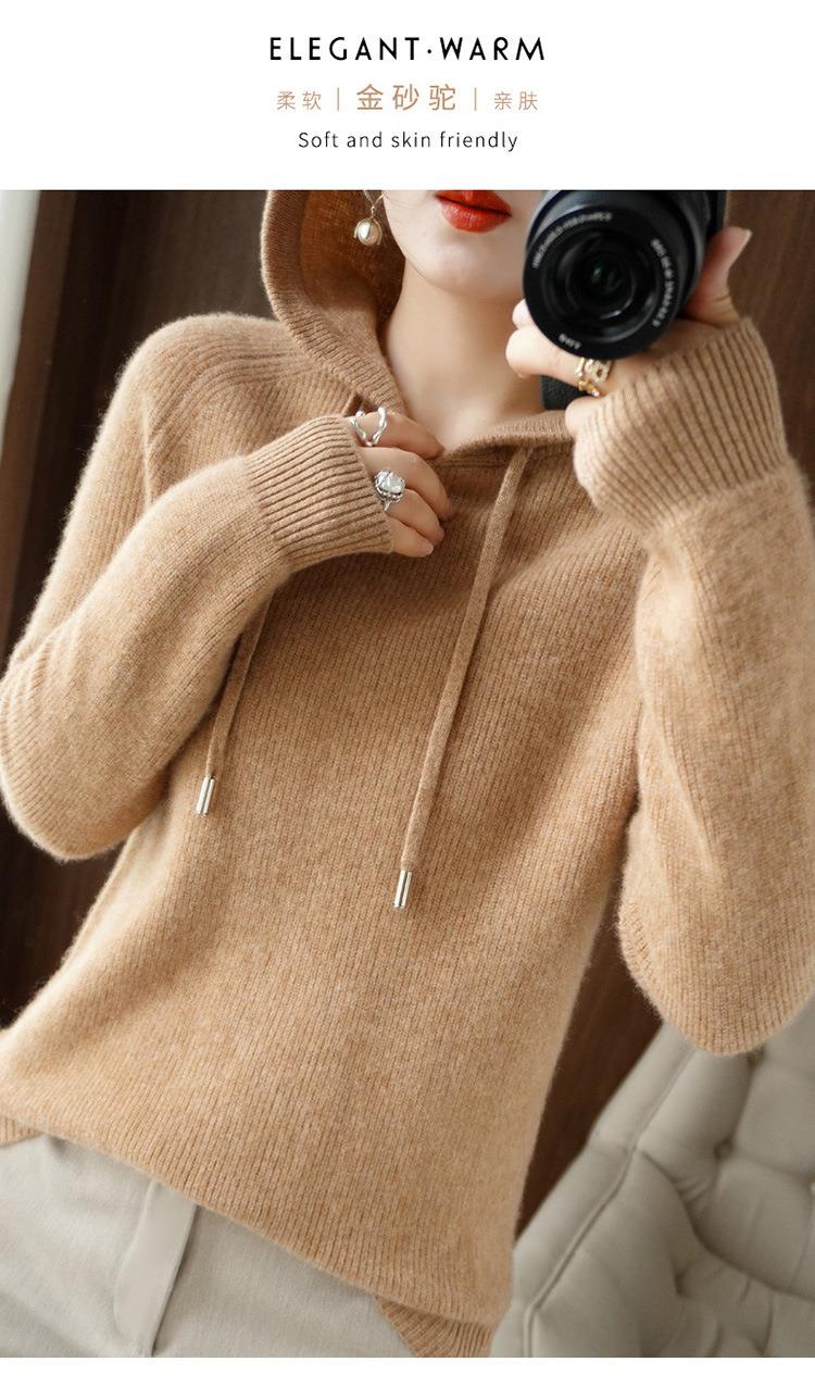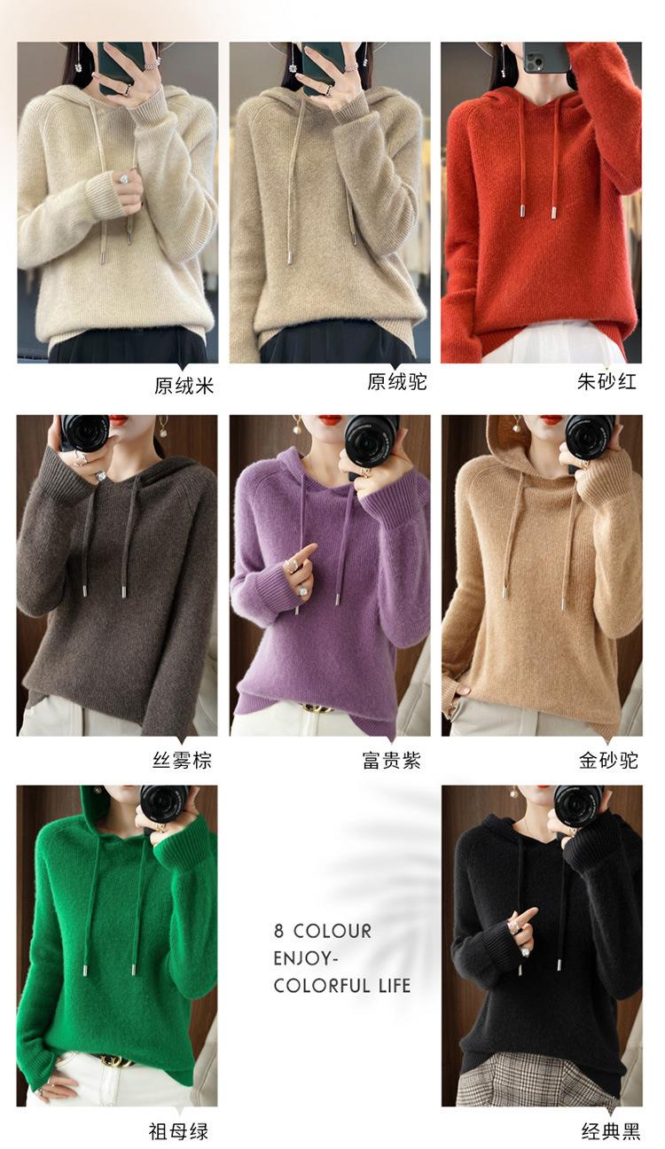 2023年秋冬新款韩版女士连帽长袖针织衫女士外地套头纯色针织帽衫
