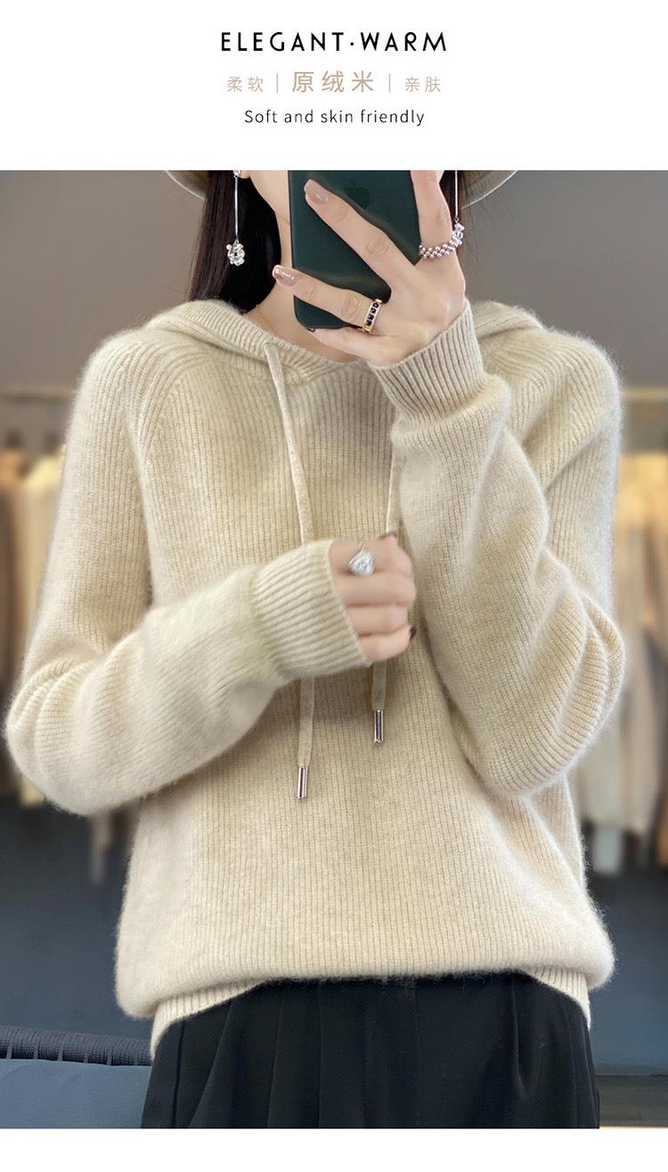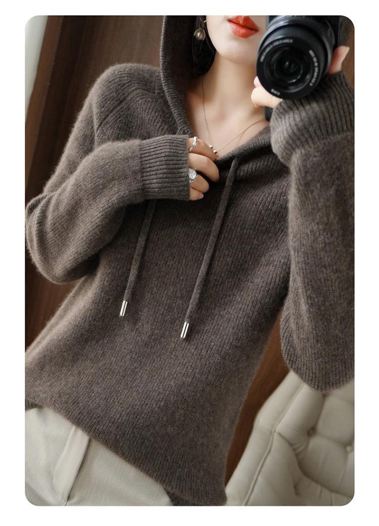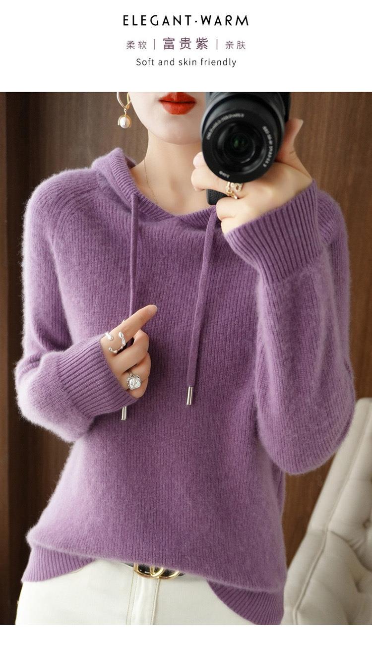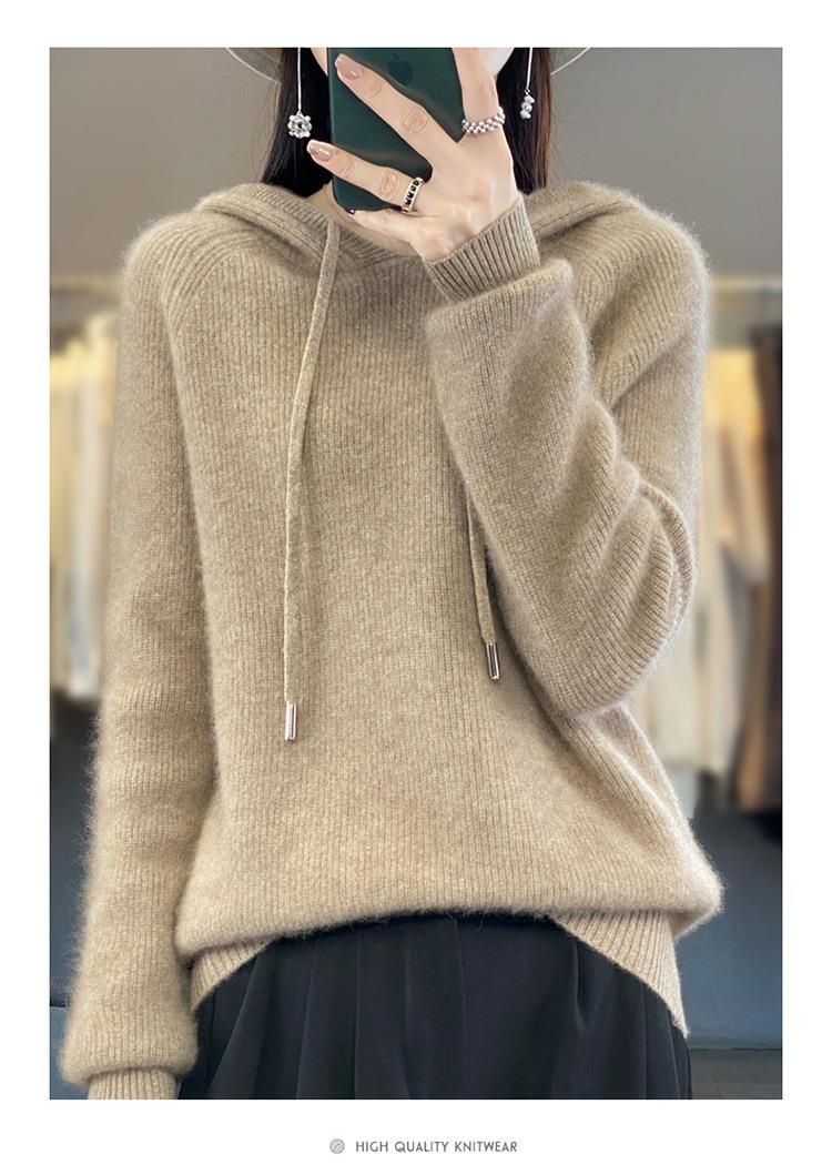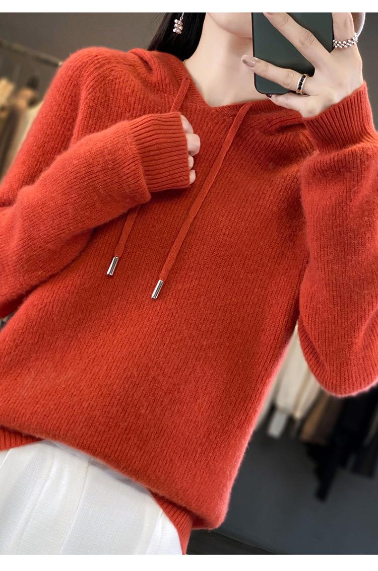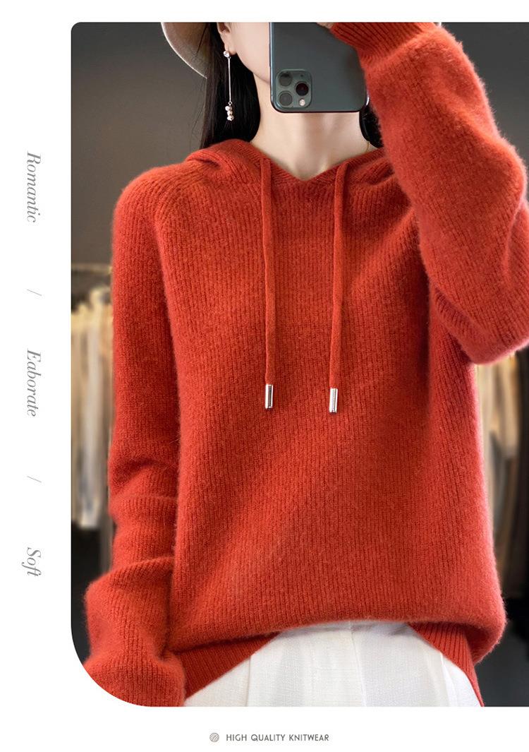 2023年秋冬新款韩版女士连帽长袖针织衫女士外地套头纯色针织帽衫