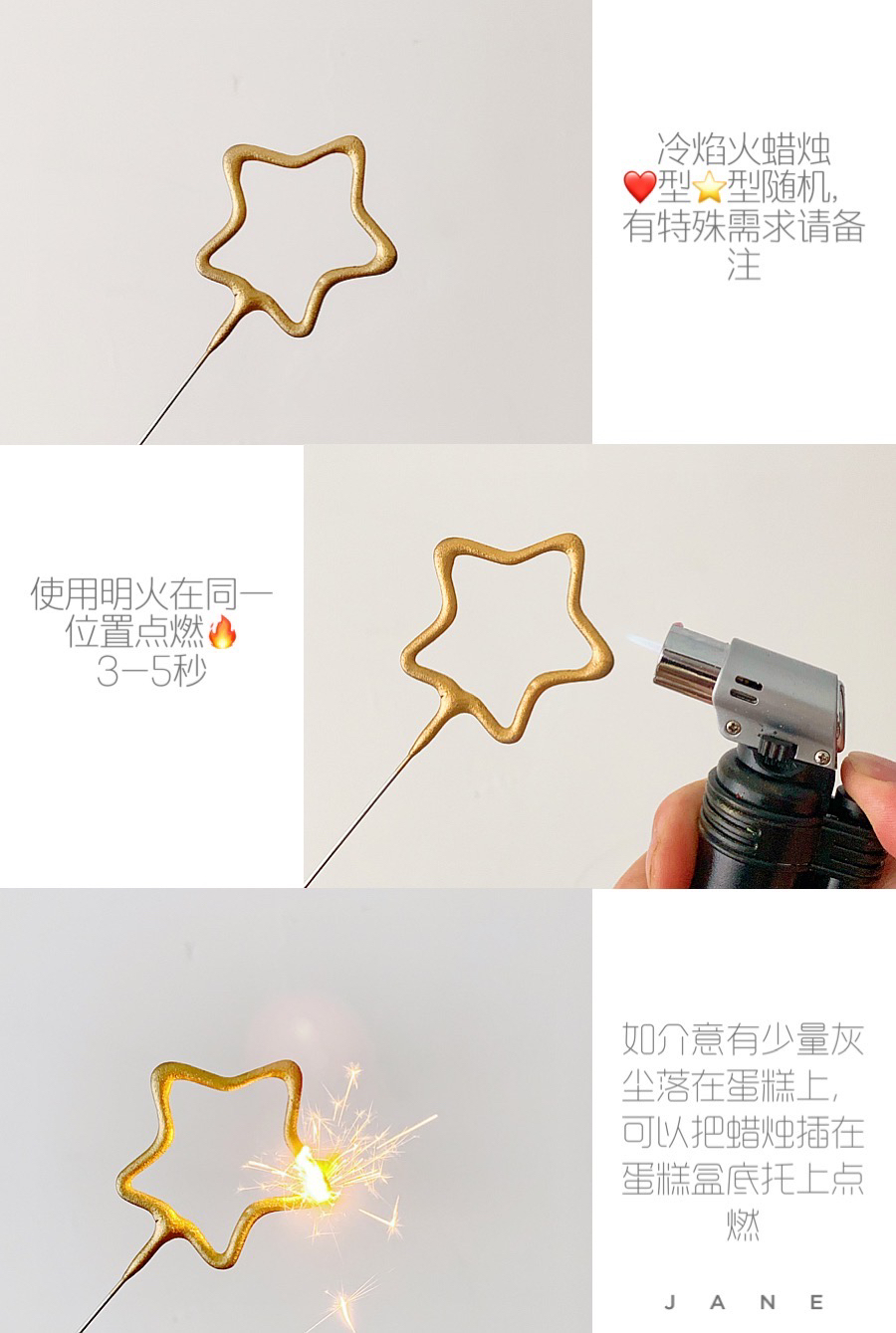 小型烟火蜡烛,燃烧后会有少量粉尘及燃烧物,如介意,可将烟火蜡烛插置蛋糕盒上或能直立的容器中(水杯)10岁以下儿童禁止使用