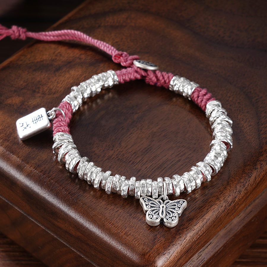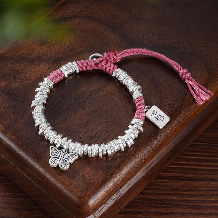 【寓意】:纯银盘绕手串,融合粉色绳结编织,点缀蝴蝶小坠饰,满载少女情怀,优雅明艳。寓意传递幸福与美好,爱与希望如影随形。