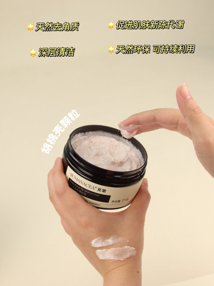 选择了胡桃壳作为磨砂膏的材料,相比化学合成的磨砂颗粒,胡桃壳更加天然安全,减少了对皮肤的刺激以及潜在的过敏风险。去角质清洁高效而温和,敏感肌可放心用~
