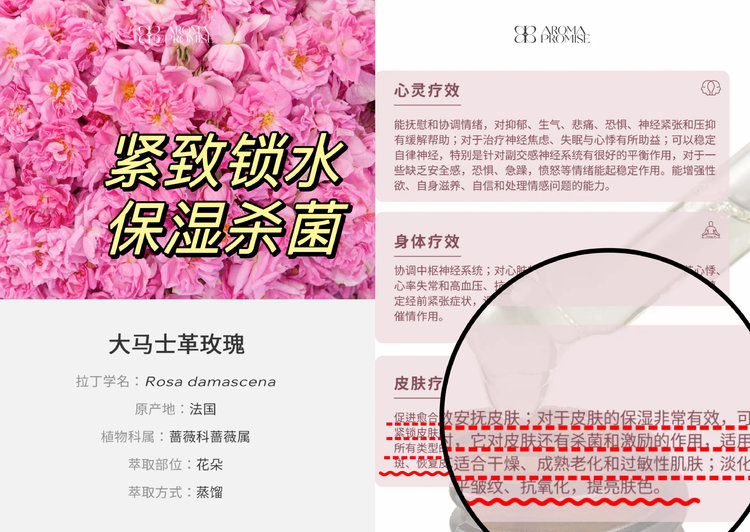 以【大马士革玫瑰精油+牛油果果脂】协同【紫苏籽油+杏仁油】