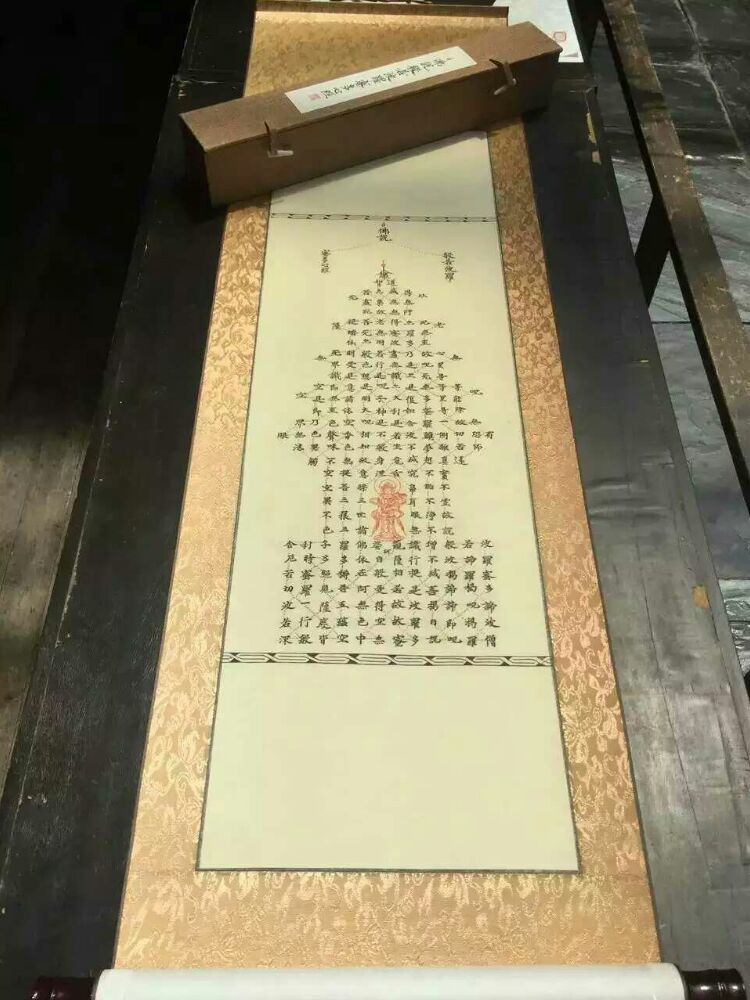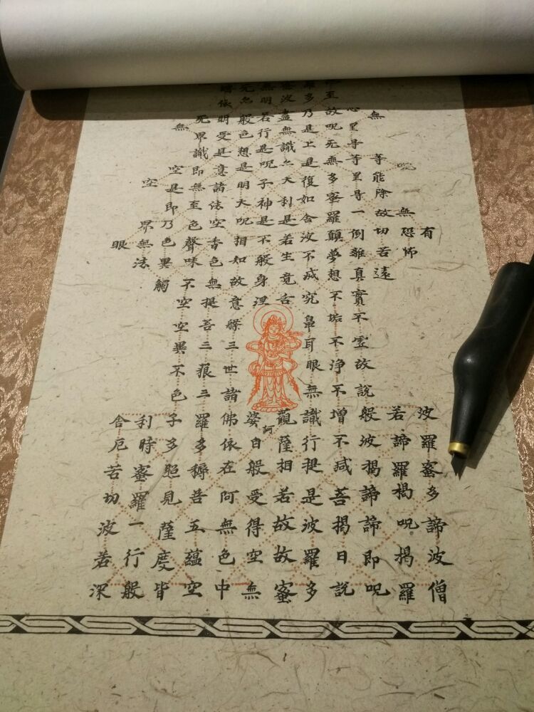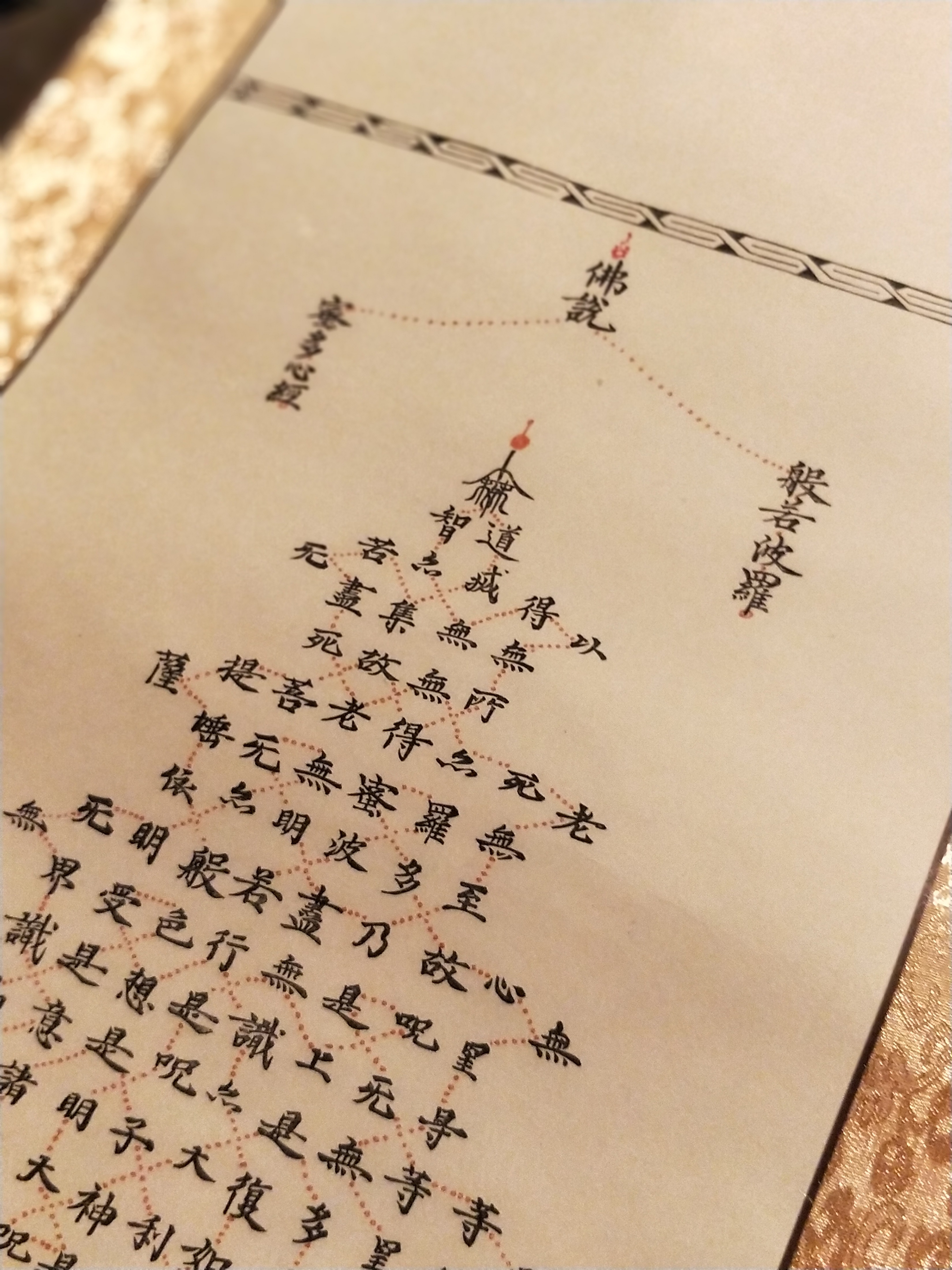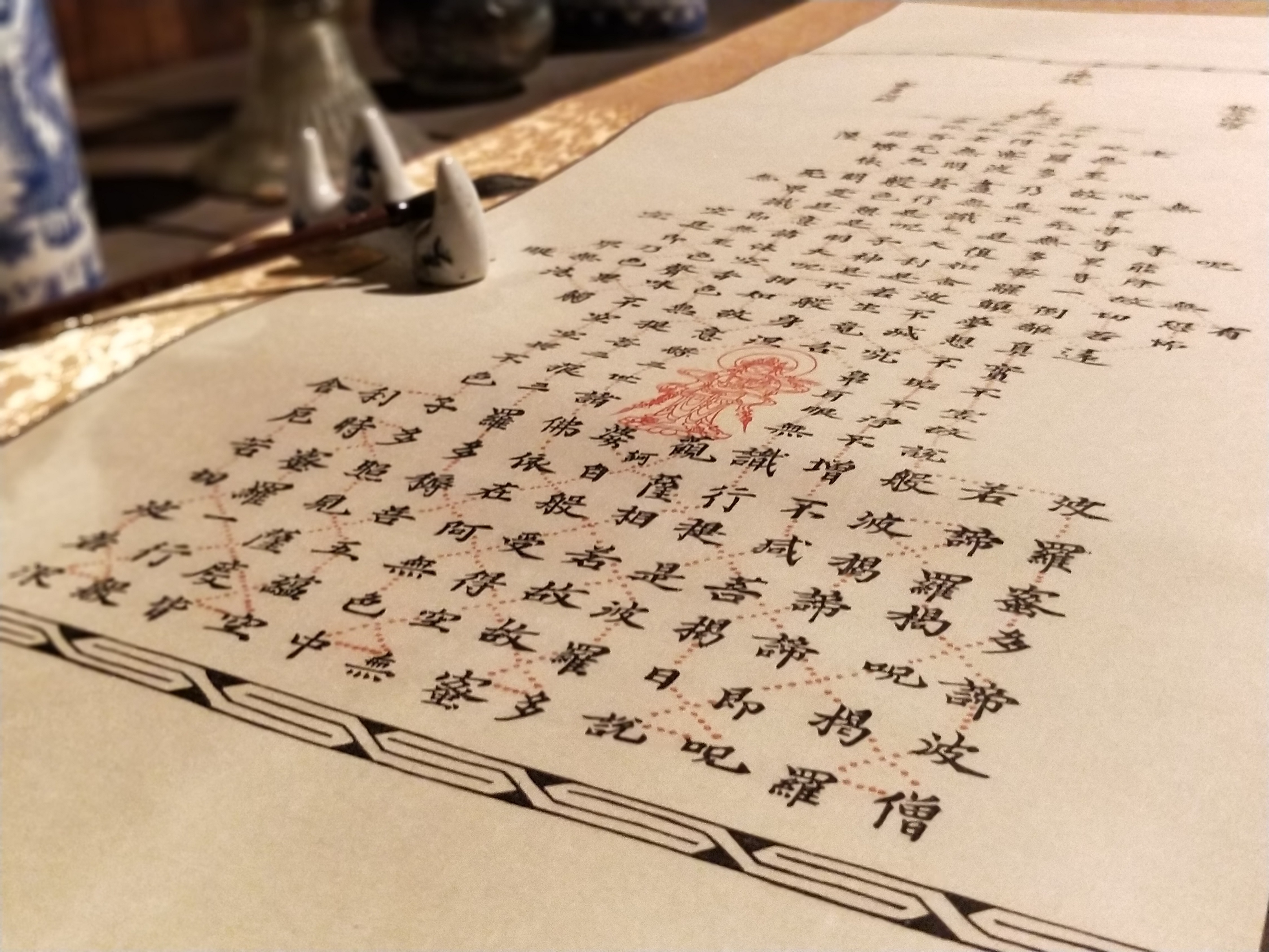 此版本心经很有意思,开始念的地方是菩萨的脚下,由虚线连接,通篇绕成宝塔形状,最后结尾又回到菩萨脚下,非常有创意的书写格式。
