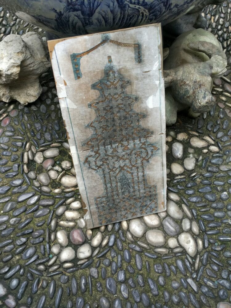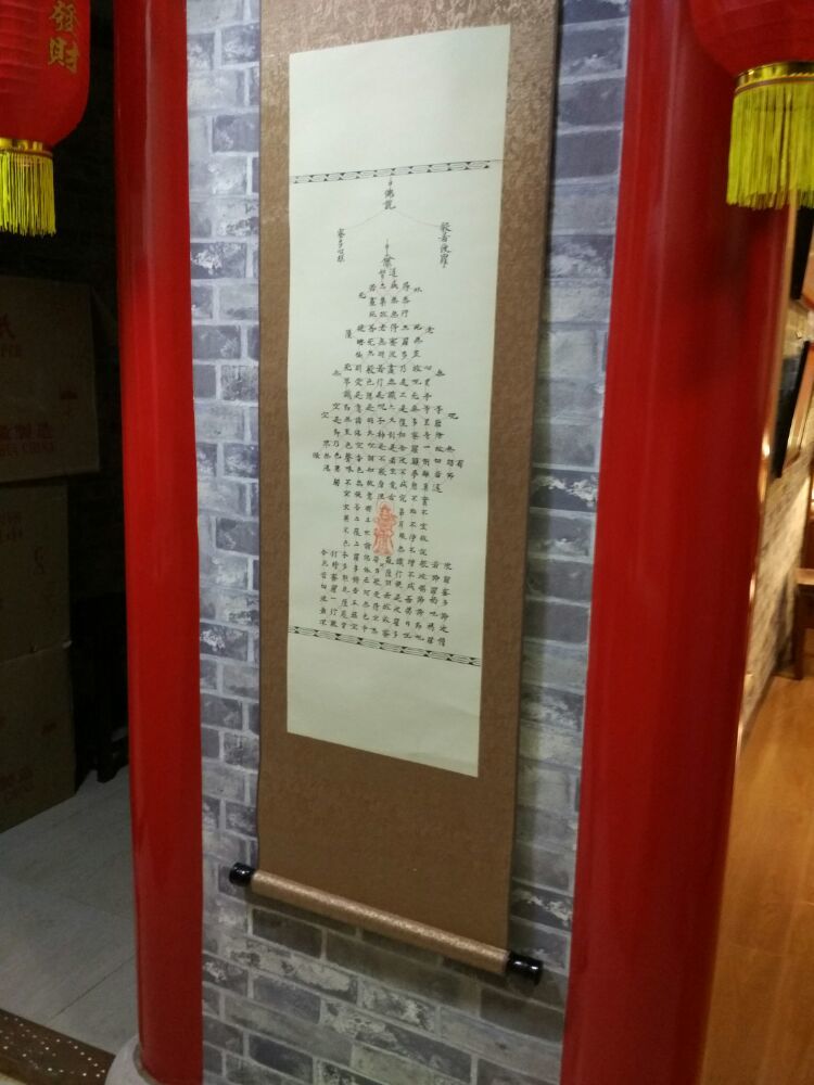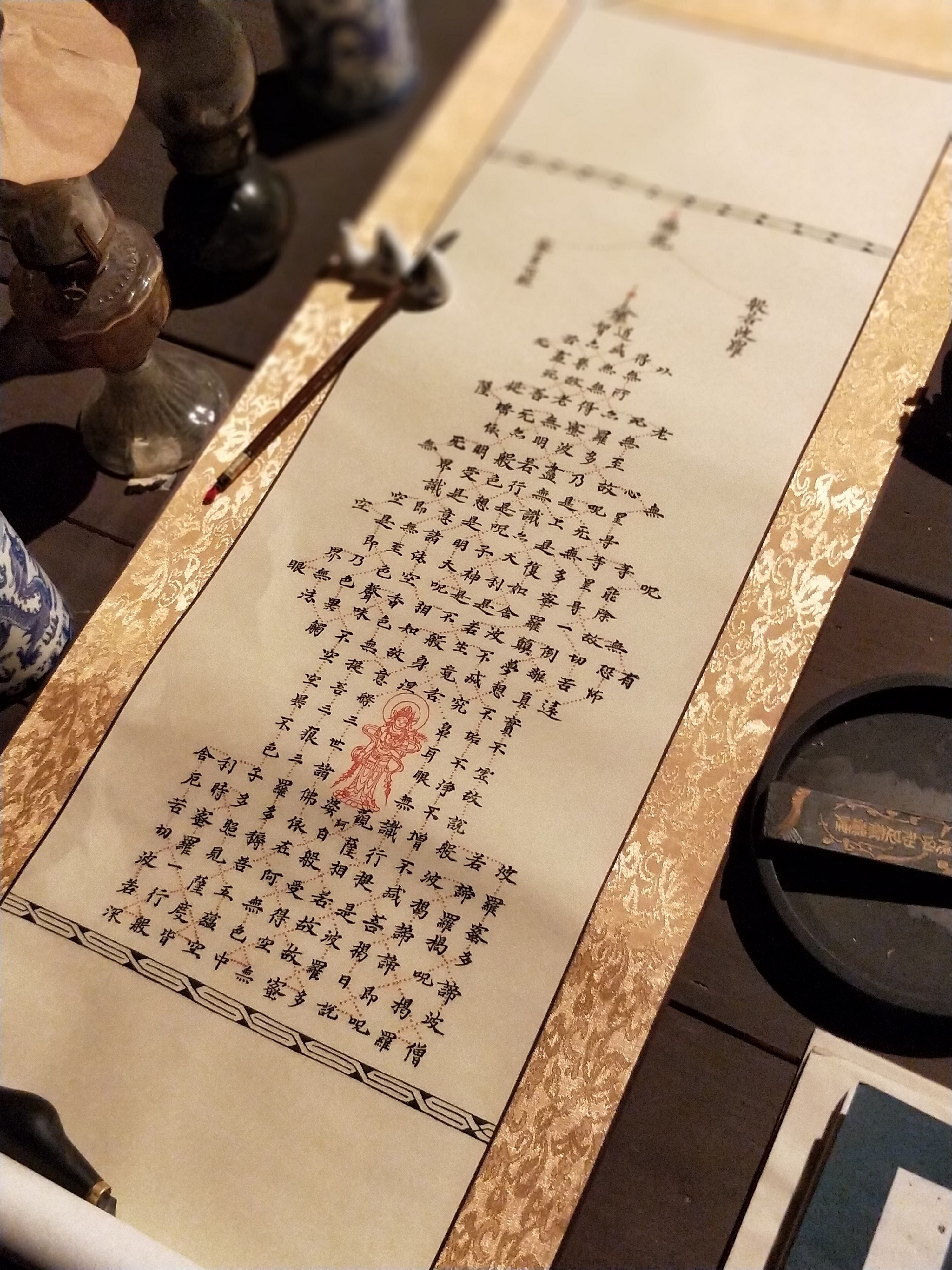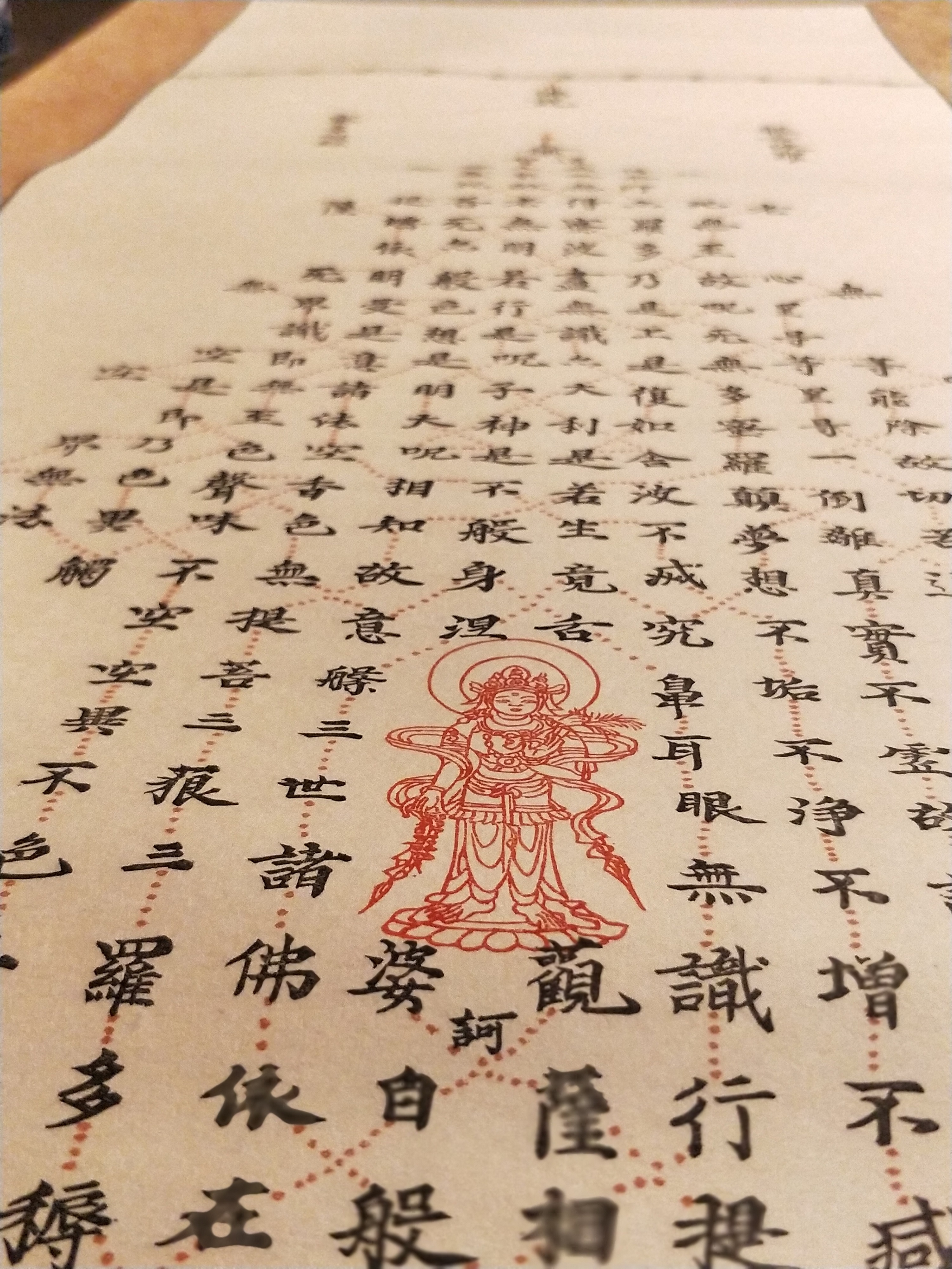 此版本心经很有意思,开始念的地方是菩萨的脚下,由虚线连接,通篇绕成宝塔形状,最后结尾又回到菩萨脚下,非常有创意的书写格式。
