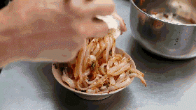 加一点点醋,和到碗头的香油、蒜颗颗香菜渣渣拌匀净,一口嗦一条比吃炫迈还停不下来