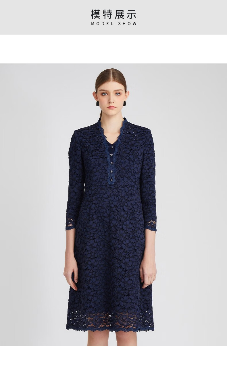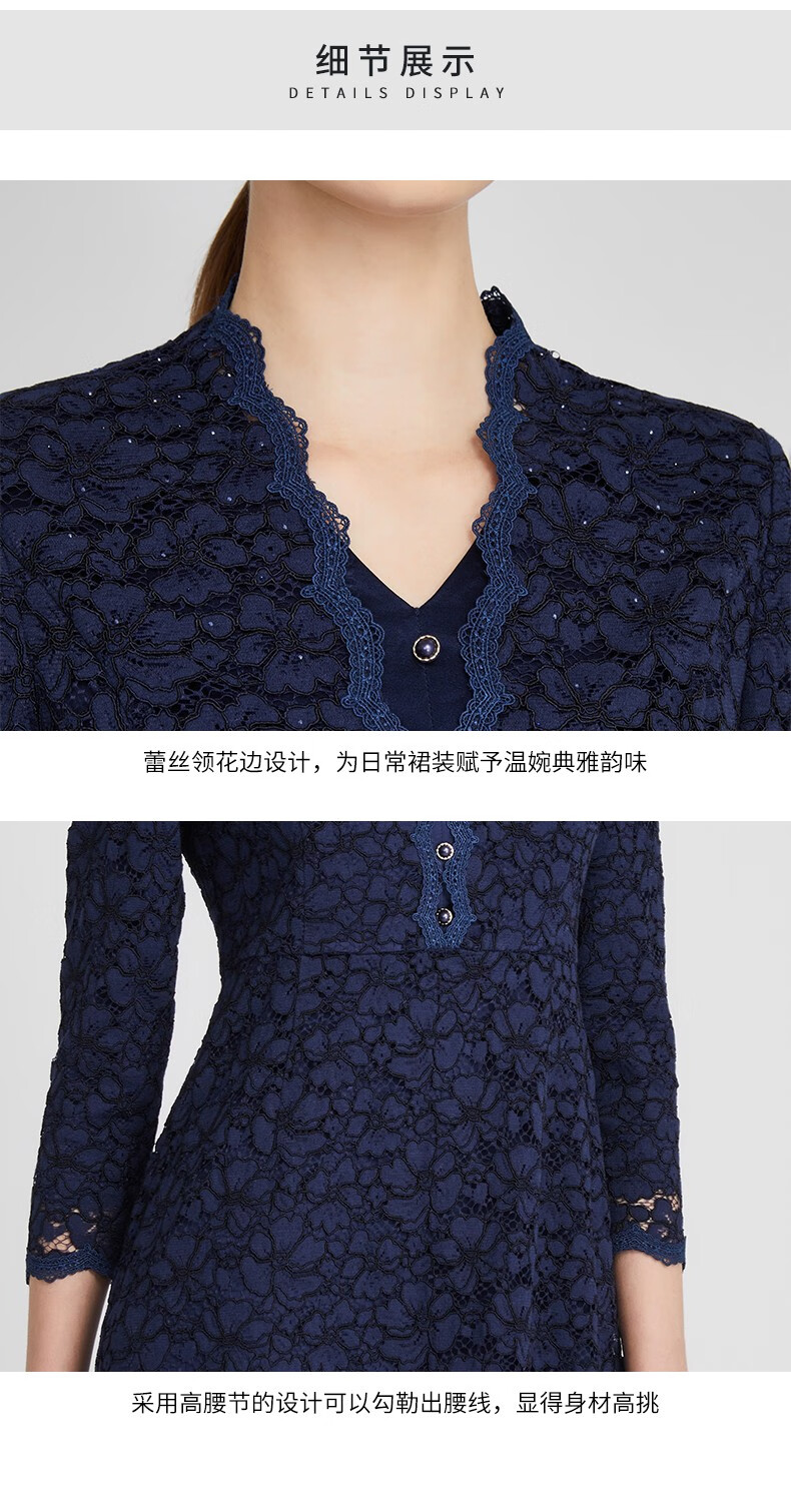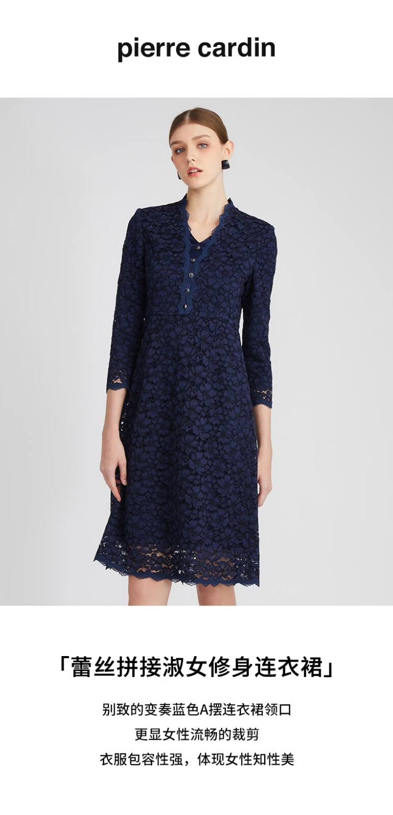 皮尔卡丹女装连衣裙蕾丝拼接淑女长款七分袖通勤裙子P2323E2940N0