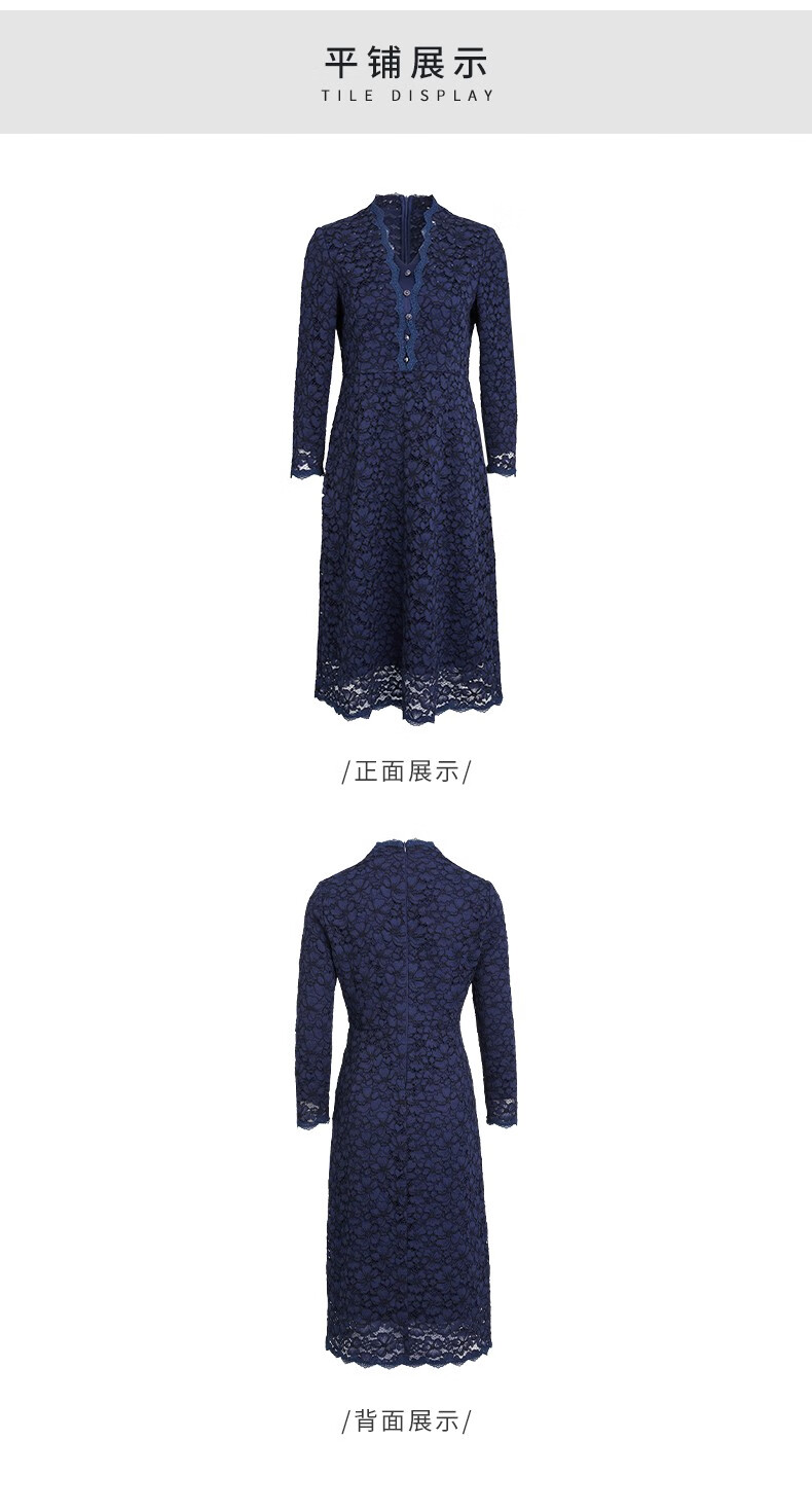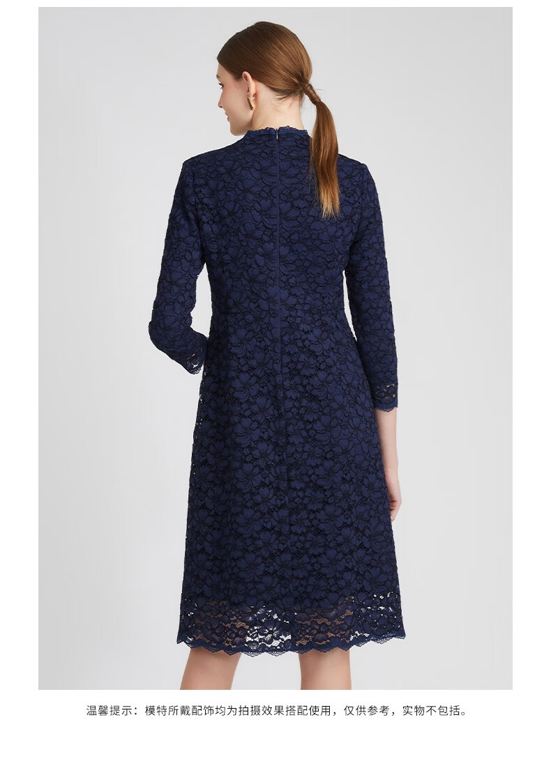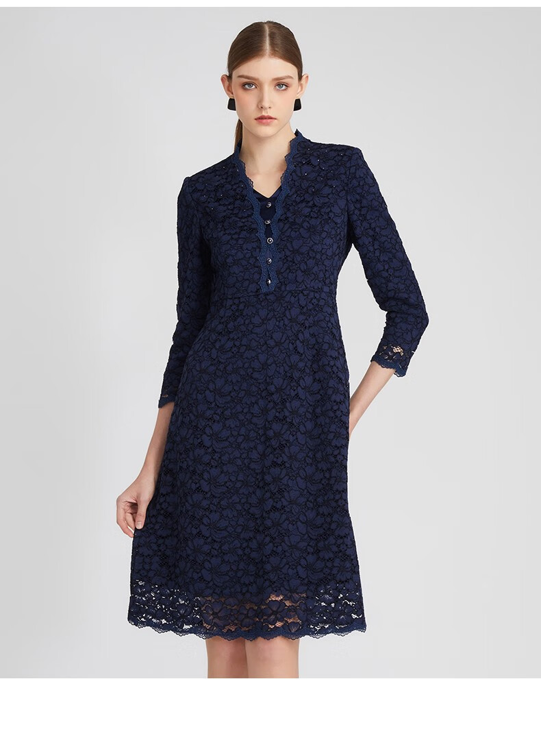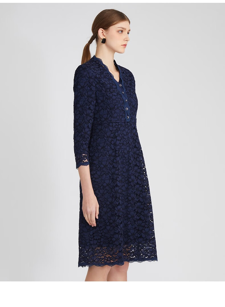 皮尔卡丹女装连衣裙蕾丝拼接淑女长款七分袖通勤裙子P2323E2940N0