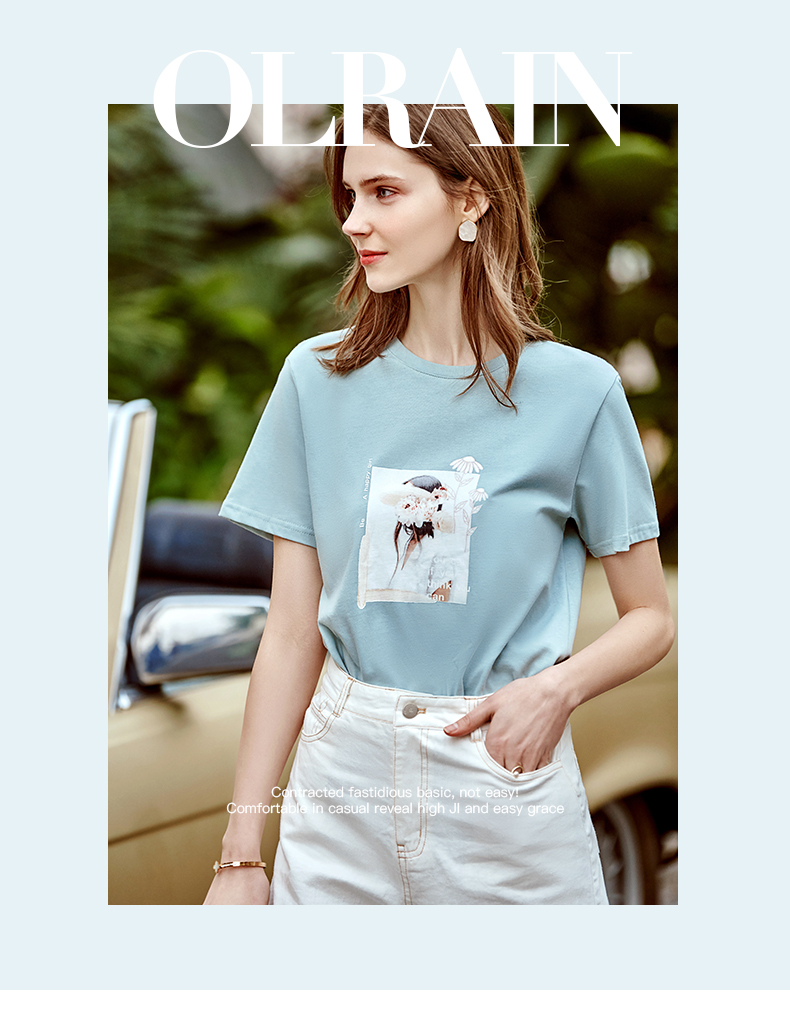 欧芮儿2026年新款夏季印花设计纯棉圆领宽松灰色休闲简约短袖T恤