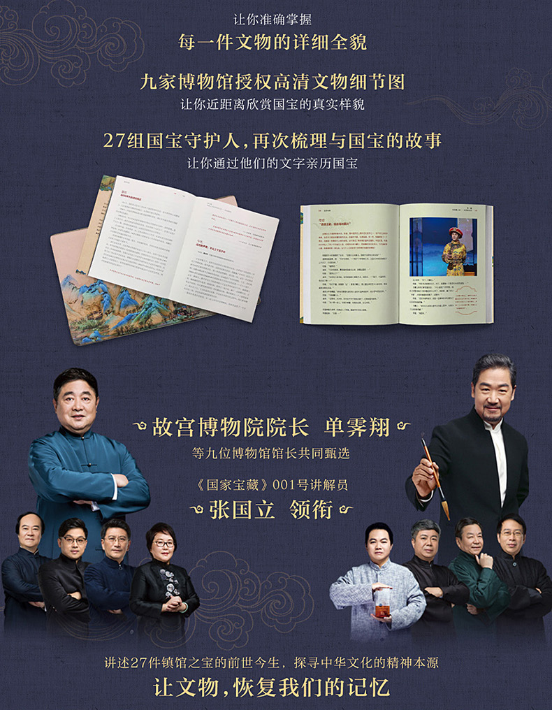 《国家宝藏》这本书的出版是一场文化盛事。27件文物背后是绵延传承的中国优质传统文化的精神和信仰。希望通过我们的努力,能让大家打开书籍,了解文物背后的中国温度,能让更多父母和孩子走进博物馆,理解中华文化的精神本源。这也是我们"看门人"历史使命的延续,这是对文物的历史谱系、价值传承的深入挖掘,视频中所无法呈现的浩如烟海的历史细节将在书中一一呈现。