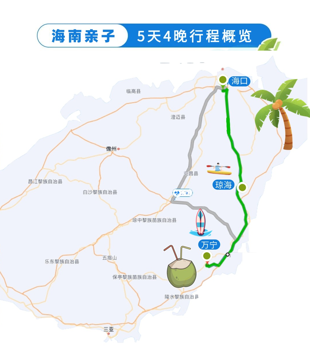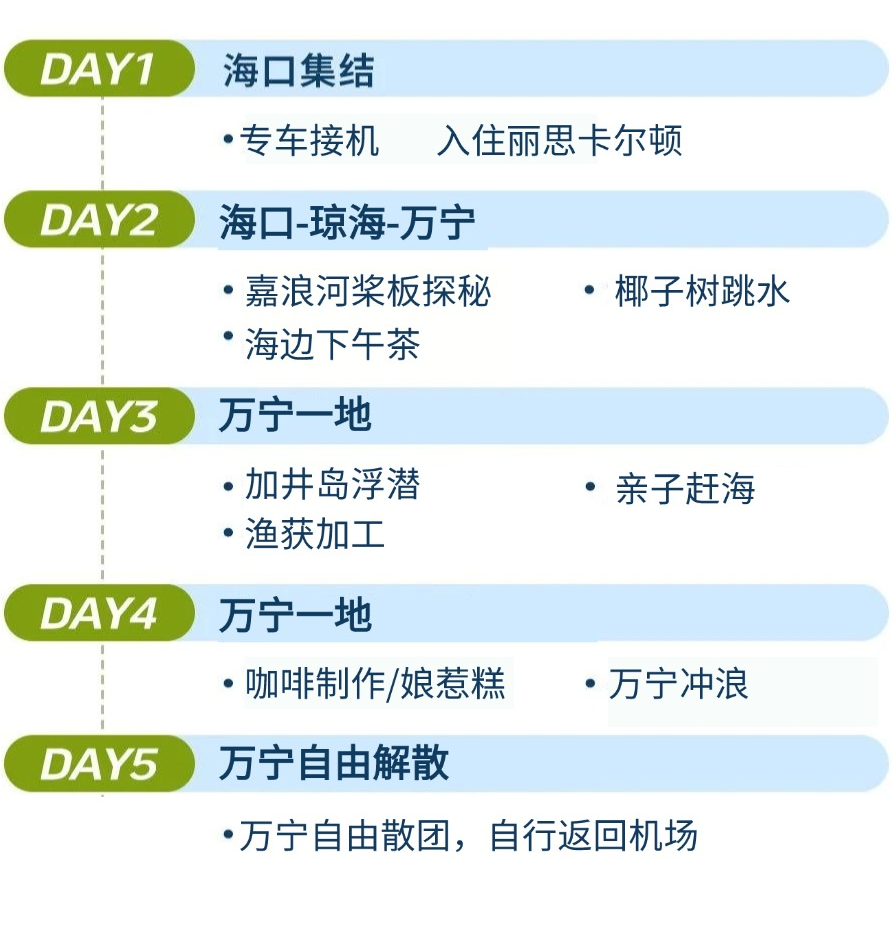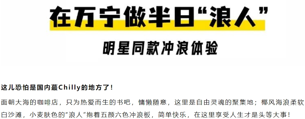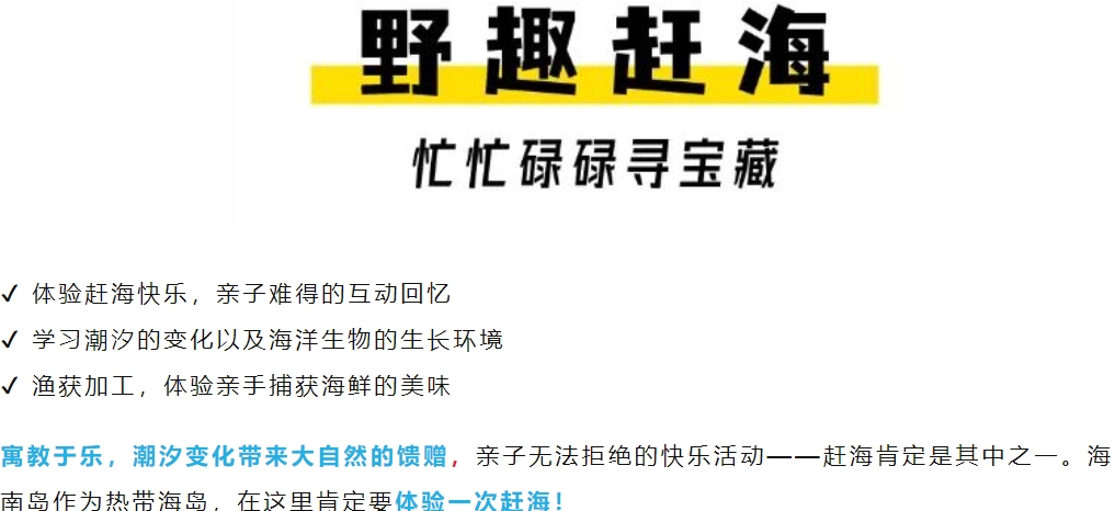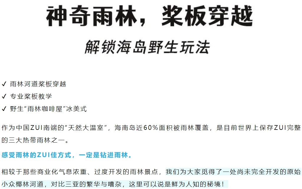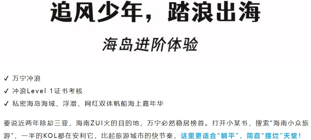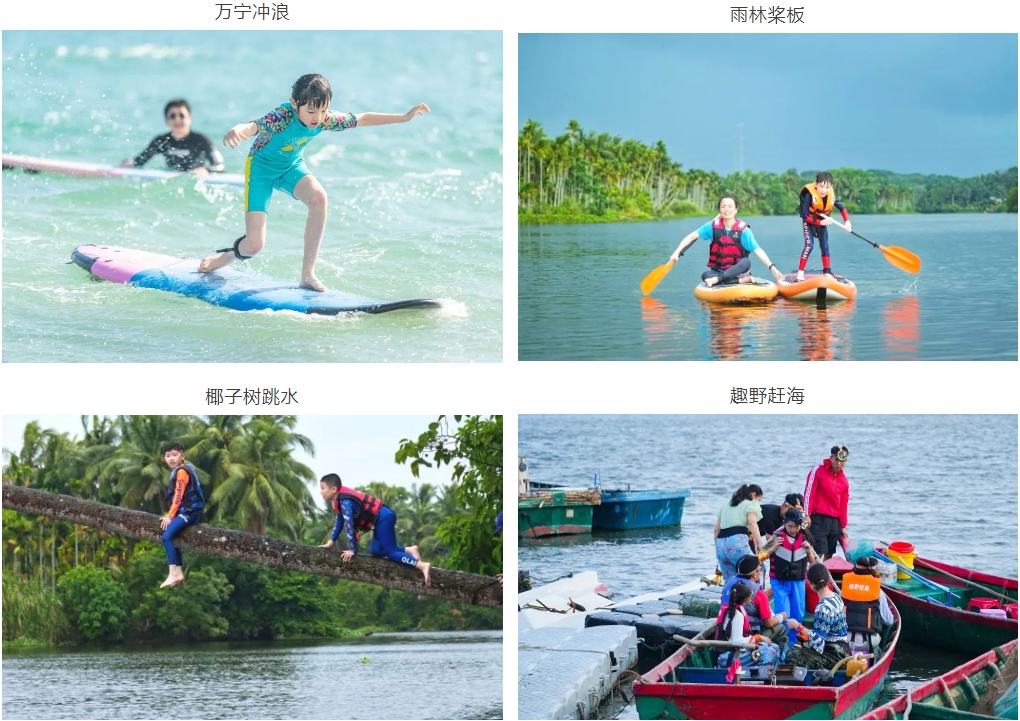 万宁冲浪、热带雨林桨板、东南亚版的椰子树跳水、雨林咖啡、趣野赶海、海上嘉年华(无人岛出海,摩托艇,香蕉船,玻璃海浮潜...)