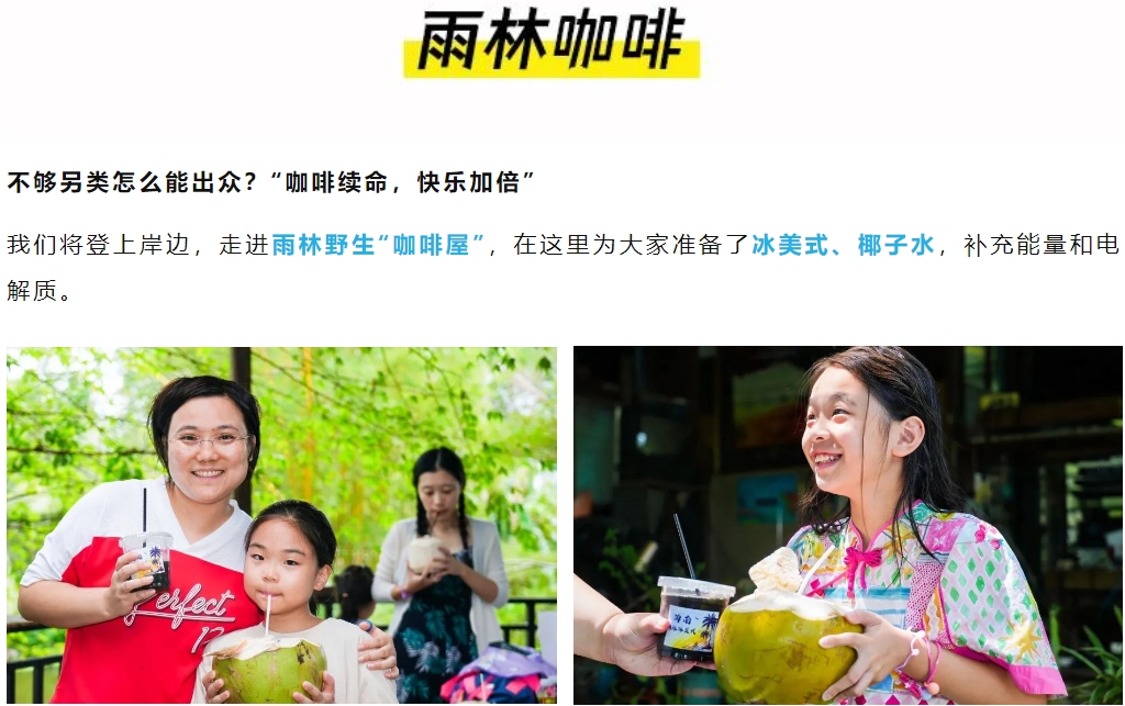 上午:早餐后驱车前往热带雨林河道,专业教练桨板教学,轻户外桨板SUP穿越雨林秘境,简直不要太出片。回程登陆以后可以在我们的原始雨林“咖啡屋”进行能量补给,来一杯冰美式,小朋友还可以补充椰子水(富含电解质)