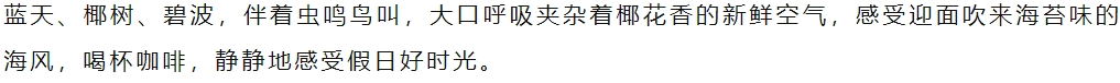 我们在神州半岛酒店附近餐厅的沙滩区域,为大家安排了一场浪漫下午茶。(家庭为单位,根据人数配比安排,饮品+小吃+果盘)若天气不允许或者其他因素影响的的情况下,则改为室内下午茶,请知悉!在这里,庄园的工作人员将会为我们讲解热带植物和兴隆咖啡的历史,了解咖啡初加工的整个过程。