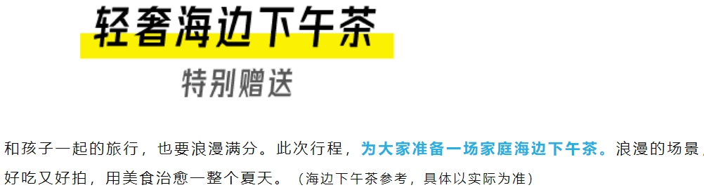 特别安排一个海边轻奢下午茶,让家长轻松度假,与孩子一起度过一个快乐休闲的亲子时光