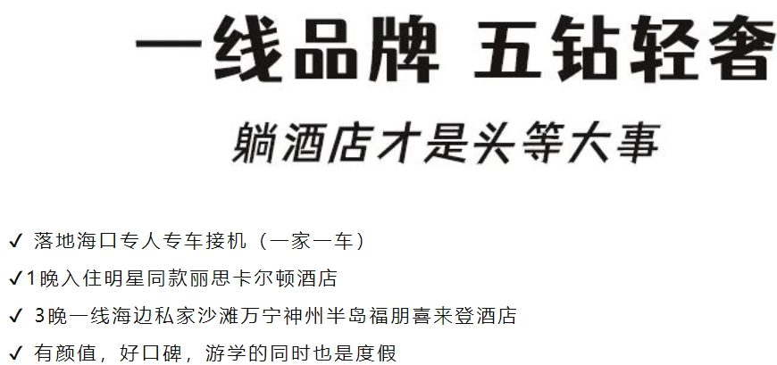 全程入住五钻+携程4.7分+国际品牌酒店,1晚海口丽思卡尔顿酒店,以及3晚神州半岛福朋喜来登酒店连住,估算下来5天4晚房费就要6000+!