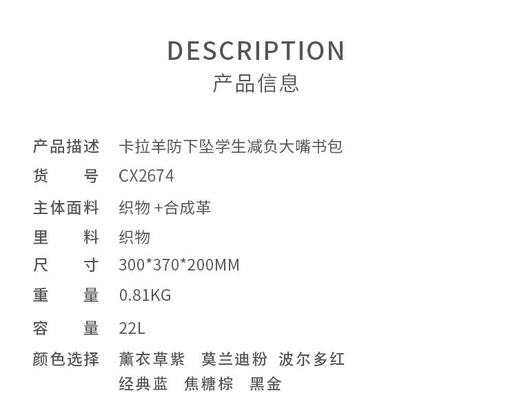 【3-6年级】卡拉羊22L学生防下坠减负大嘴书包S2674