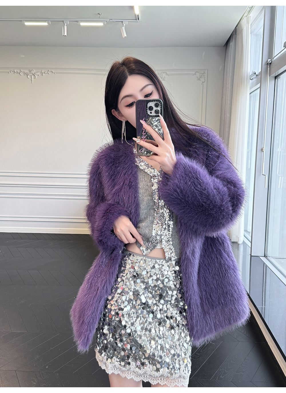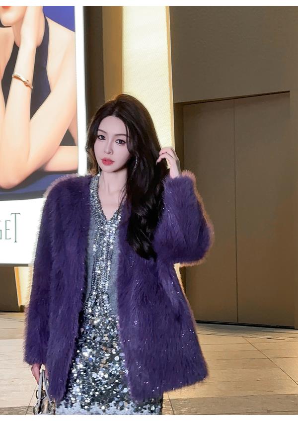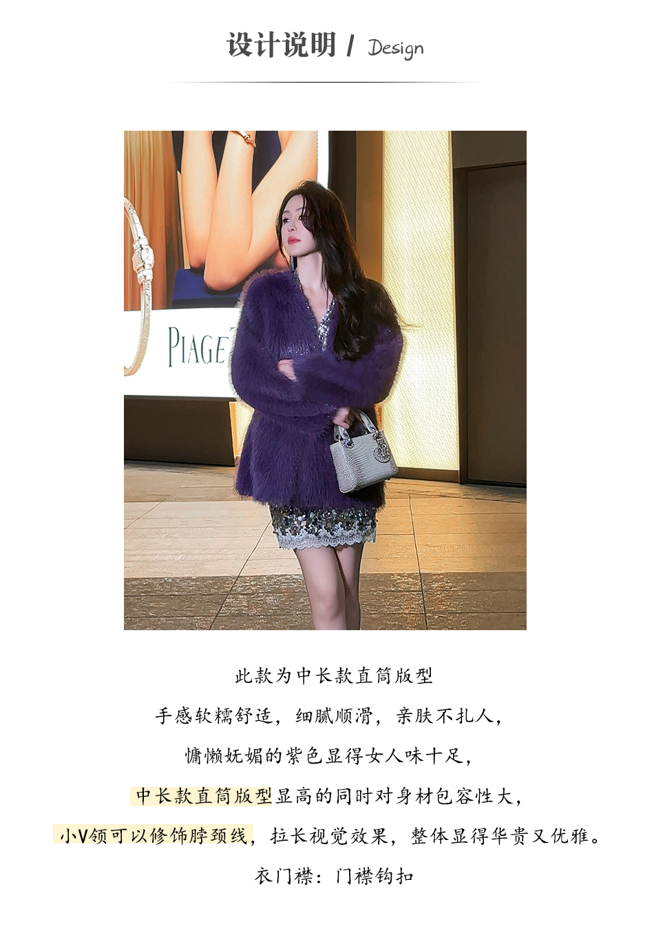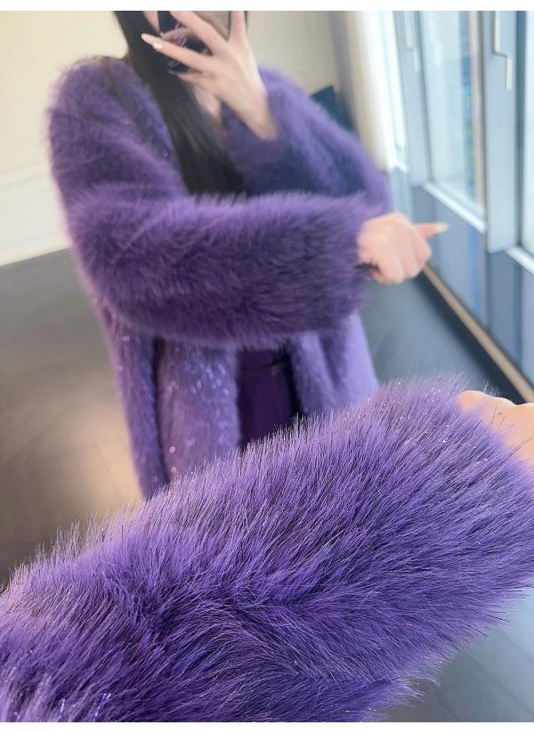 BeQueenStory【紫焰玫瑰】软糯顺滑细闪环保中长款显高直筒V领外套