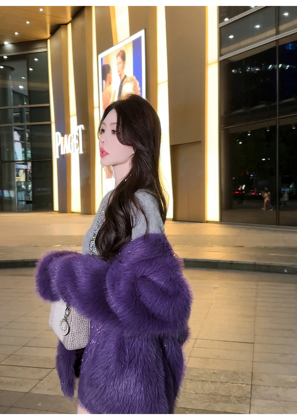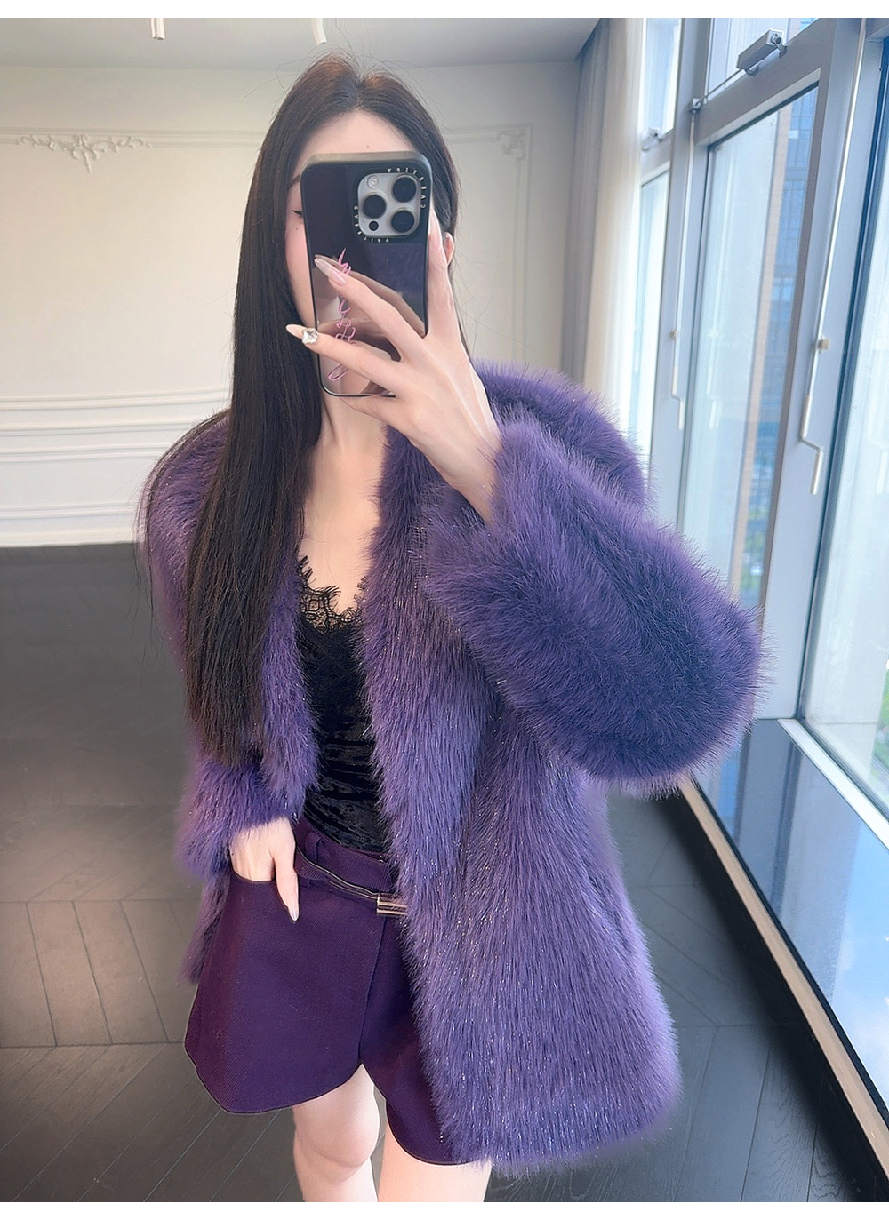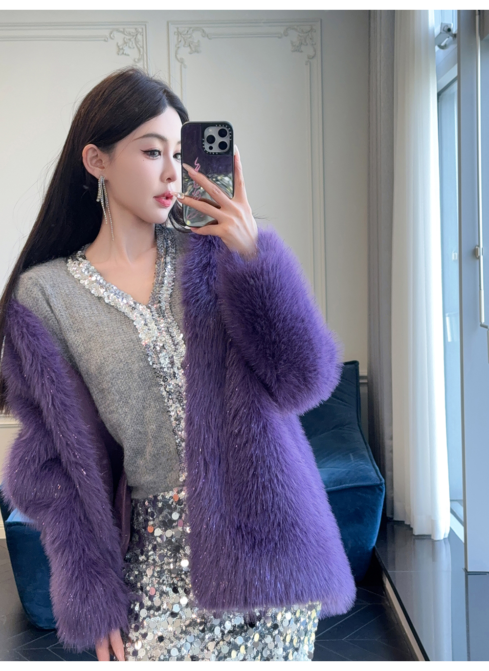 BeQueenStory【紫焰玫瑰】软糯顺滑细闪环保中长款显高直筒V领外套