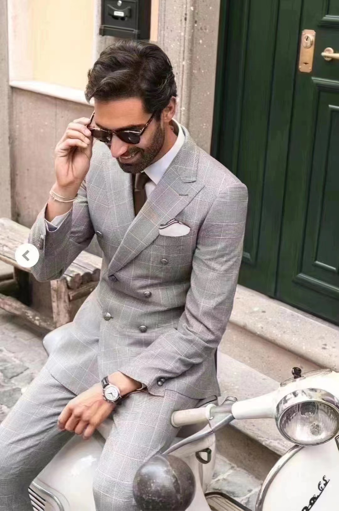 2、款式上采用大戗驳领双排扣色设计,穿着时使得整个人更加的有气场,威尔士亲王格的花型,经典中又透出时尚的感觉,是”正装控“的最爱,在婚礼上穿着一定能成为焦点