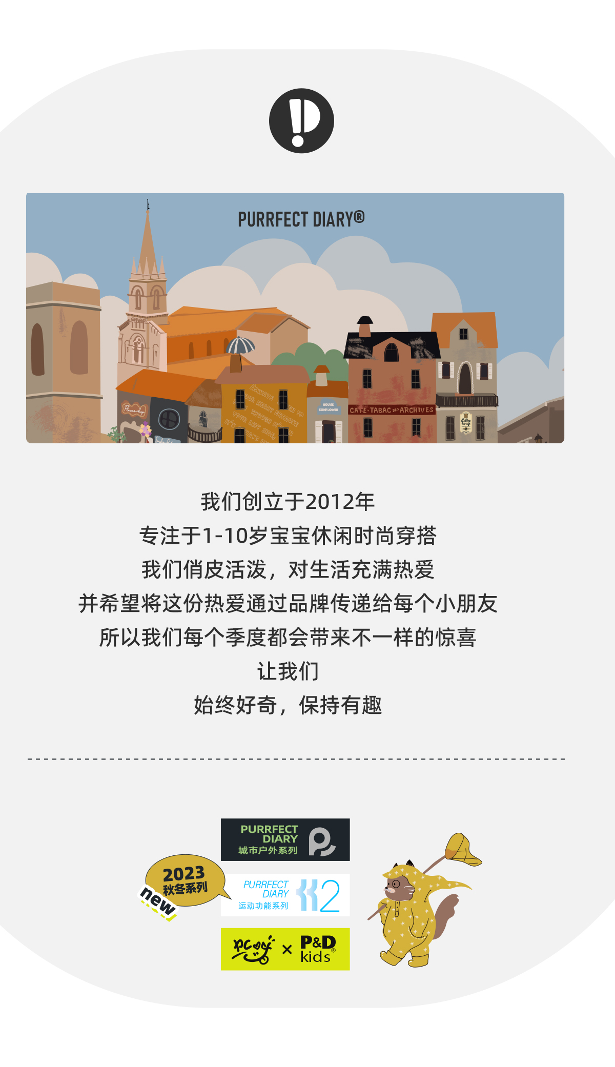 Purrfect-Diary专注于贴近自然随性的穿着概念,轻奢平价的童装文化传播,在产品设计上更加注重婴童穿着的舒适性、安全性、更出众的国际化品牌,将欧美的育婴文化在中国进行深入的传播与推广。