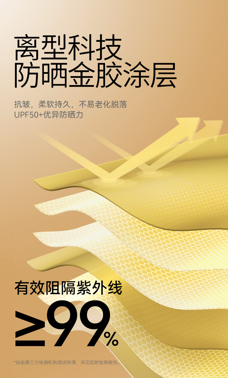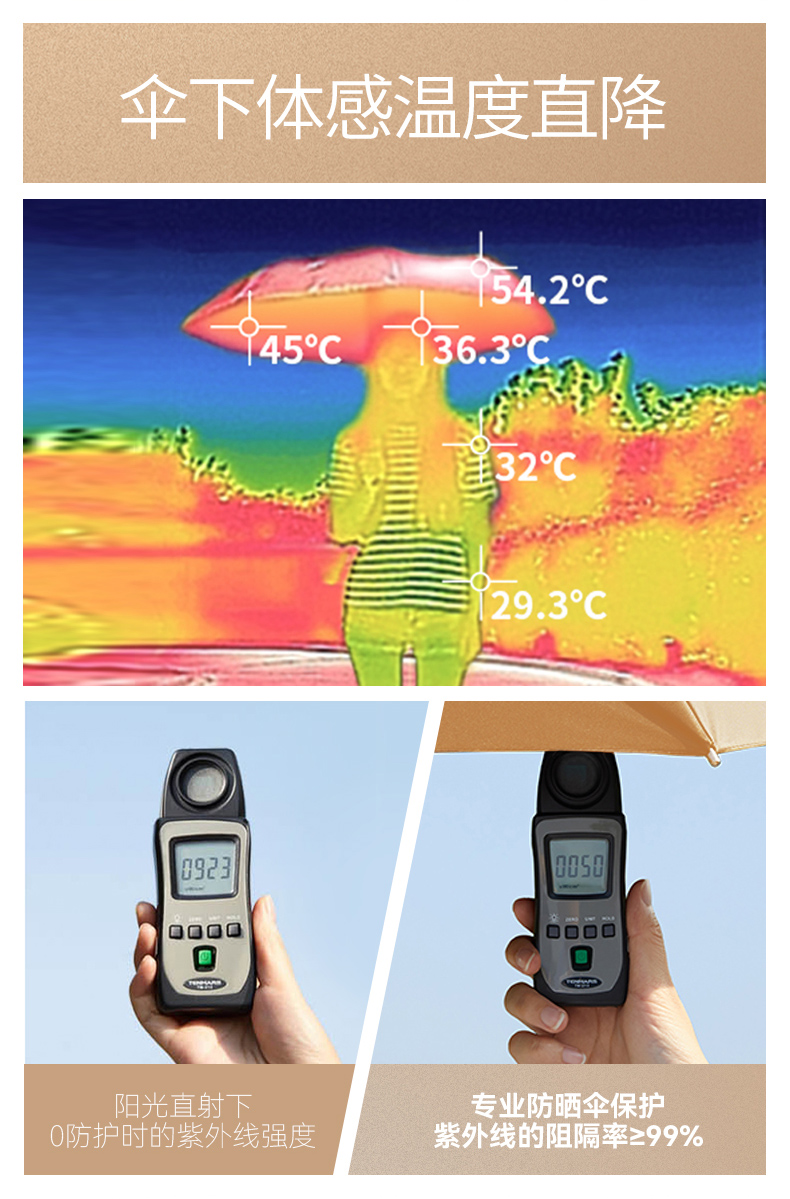 1. 专业防晒。UPF>50+,金胶高密离心贴合工艺柔布,零透光,阻隔99.9%紫外光,伞下最高降温12°C,拥有第三方检测报告;