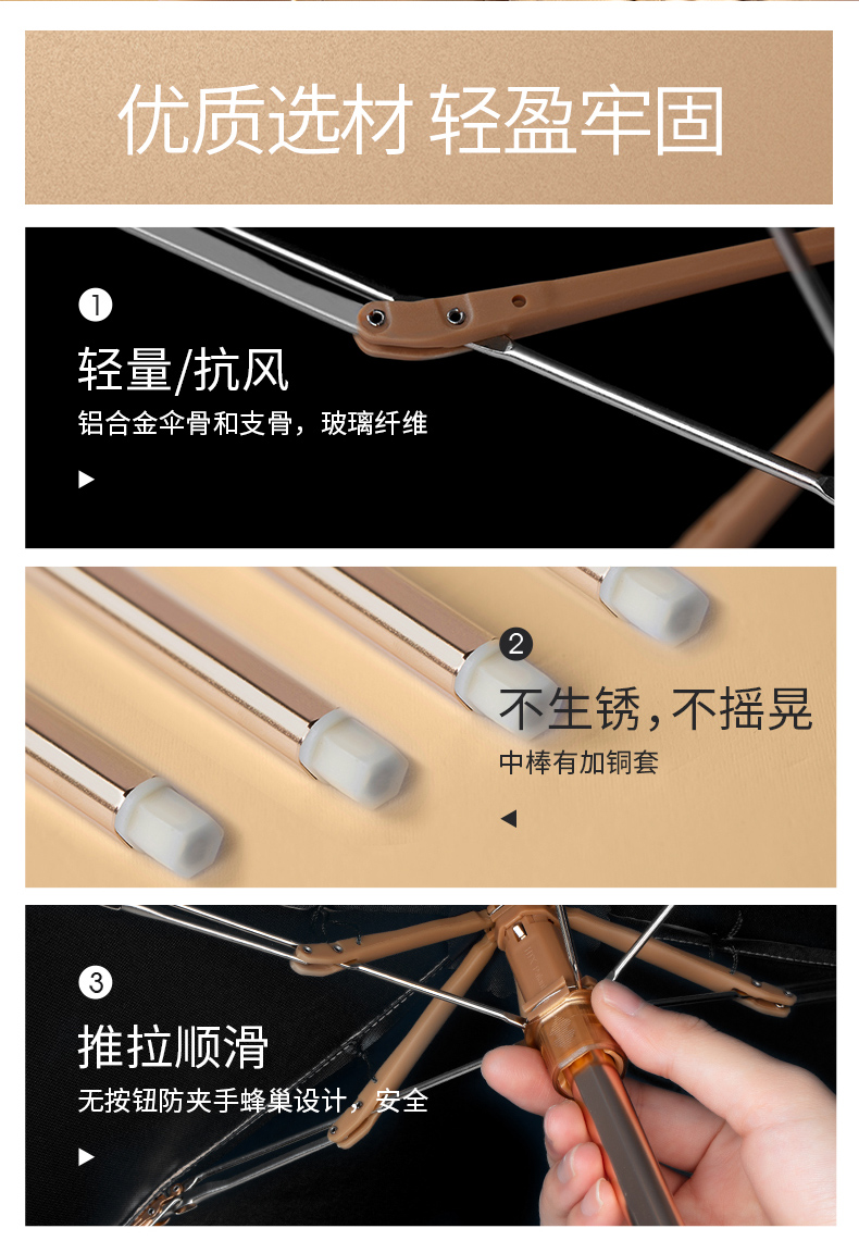 4. 防风伞骨。伞骨通体金色(铝合金中棒、合金槽、玻纤骨、树脂骨),防风设计,坚韧能抗8级大风,吹翻亦能复原;